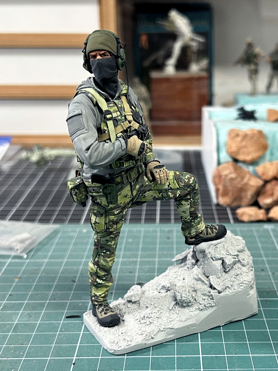 That is some damn fine work Mario. You have really painted it so well- the way you have finished the jacket, hat and mask is incredible- it looks so much like the heavy fabric they would be made from! There is a real sharpness to your detail work too- the definition of the camo trousers, the Oakley gloves and the NLAW and rifle slings.