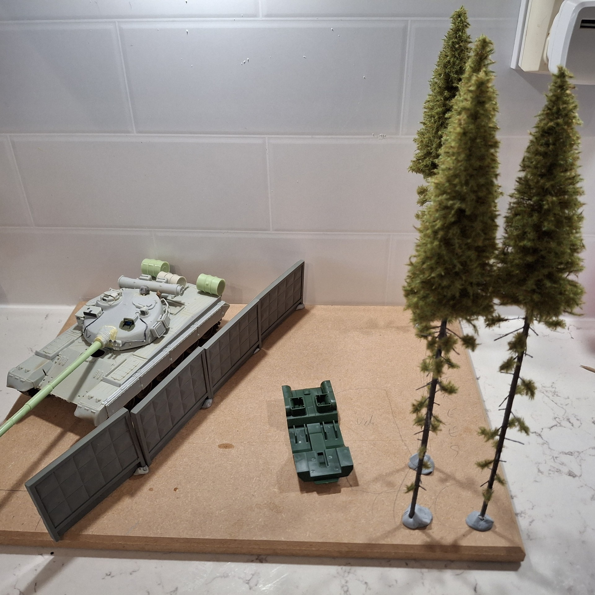There’s still a fine bit of fine tuning to see to. The tree line will be consistent – I think I’ve enough trees to indicate the edge of a forest, and will hopefully appear dense enough. The base for the tank might be raised a bit so I’ll have to get the landscaping right and incorporate the Lachman panels accordingly. I must also ensure that the tank is in the line of sight of the BRIXMIS operator who is snapping away, and position an indignant T-80 crew as well.