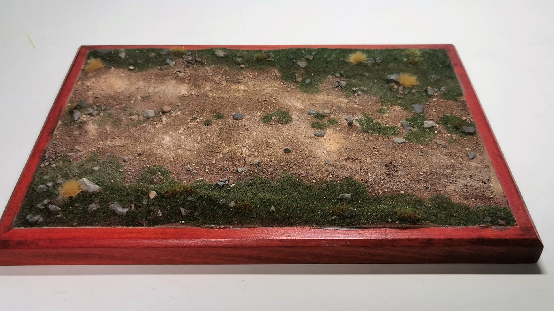 So this is really the last update gentlemen . I finished my small uncomplicated diorama base for my Challenger. I used a picture frame stuffed inside with styrofoam and sculpted a slightly uneven surface with Ovalit paste. Birdsand and small pepples were pressed in as everything was still wet. After all I sprinkled static grass over it and painted and dusted everything carefully. This is the final result: