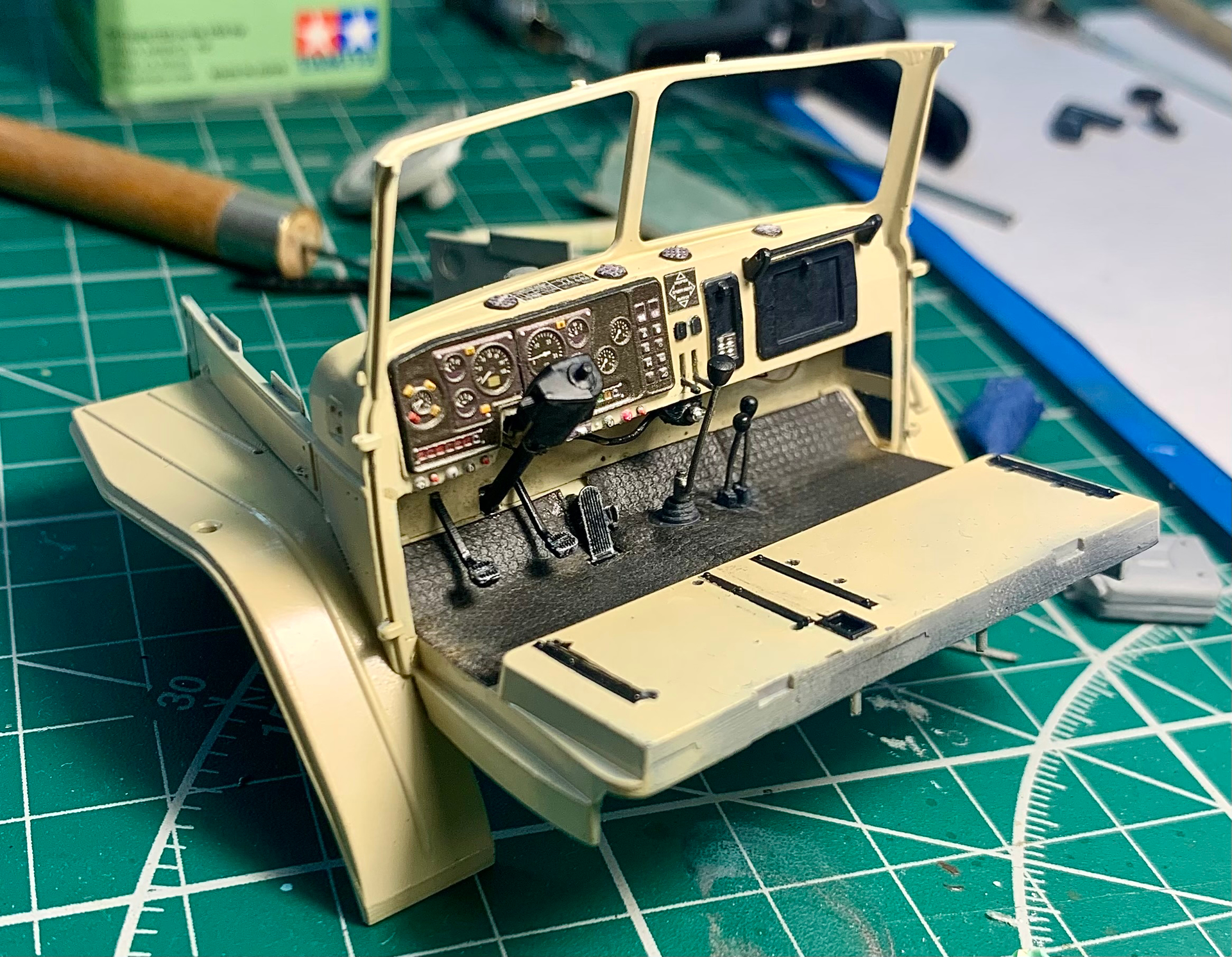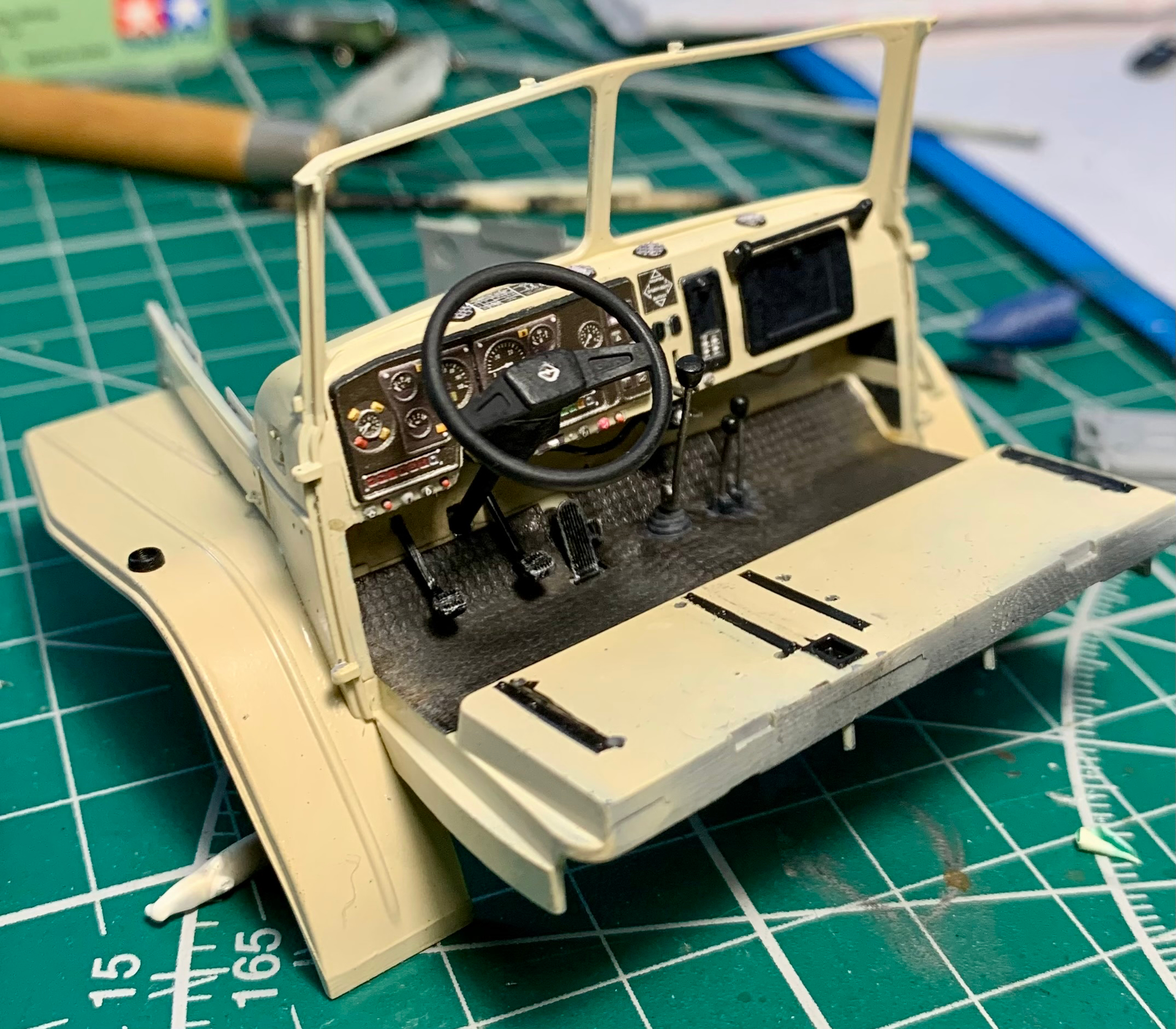 Before the steering wheel obscured all the details. Hand-made interior elements + added a cardan shaft to the steering column + Emboss 3Ddecal.