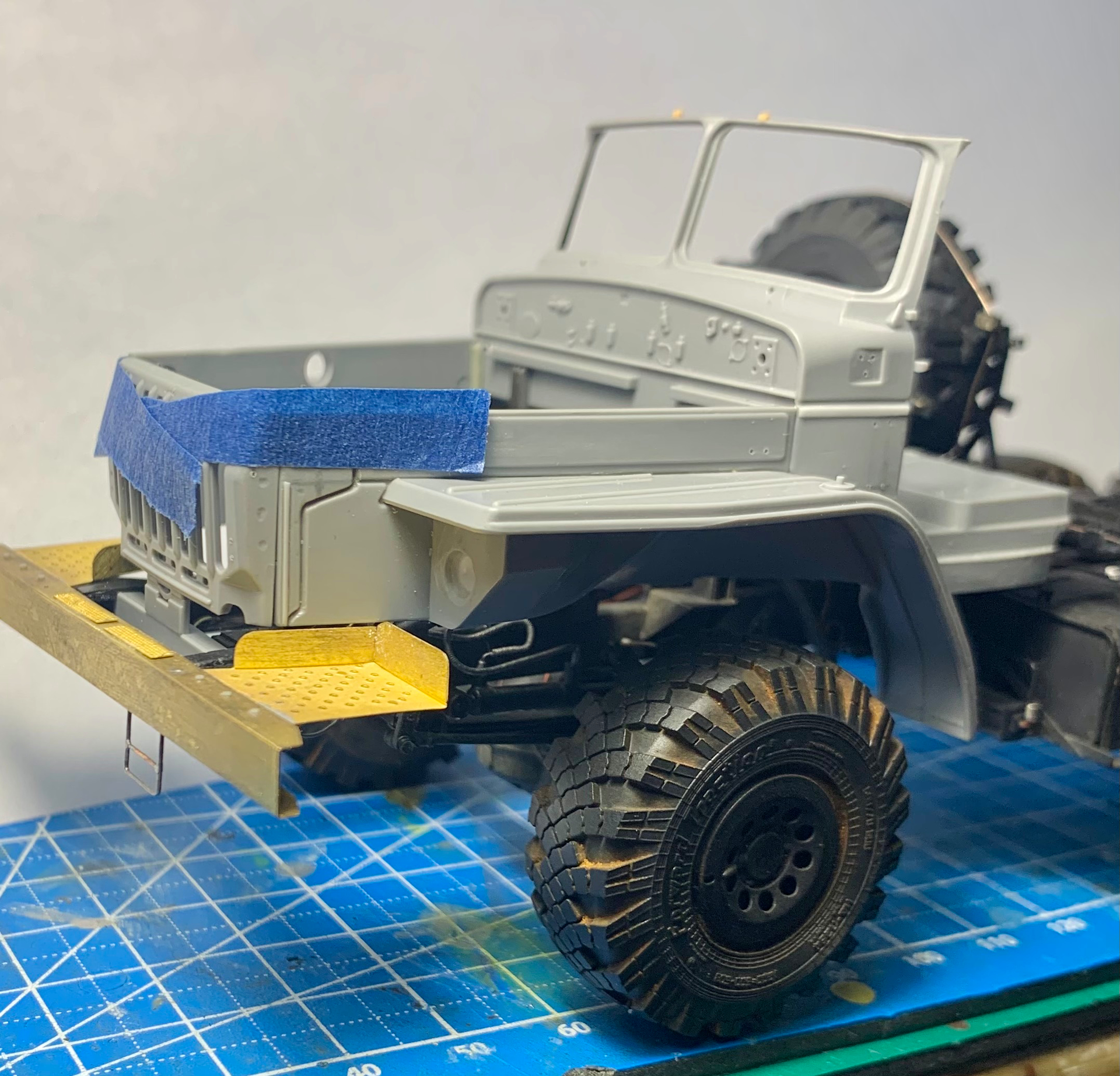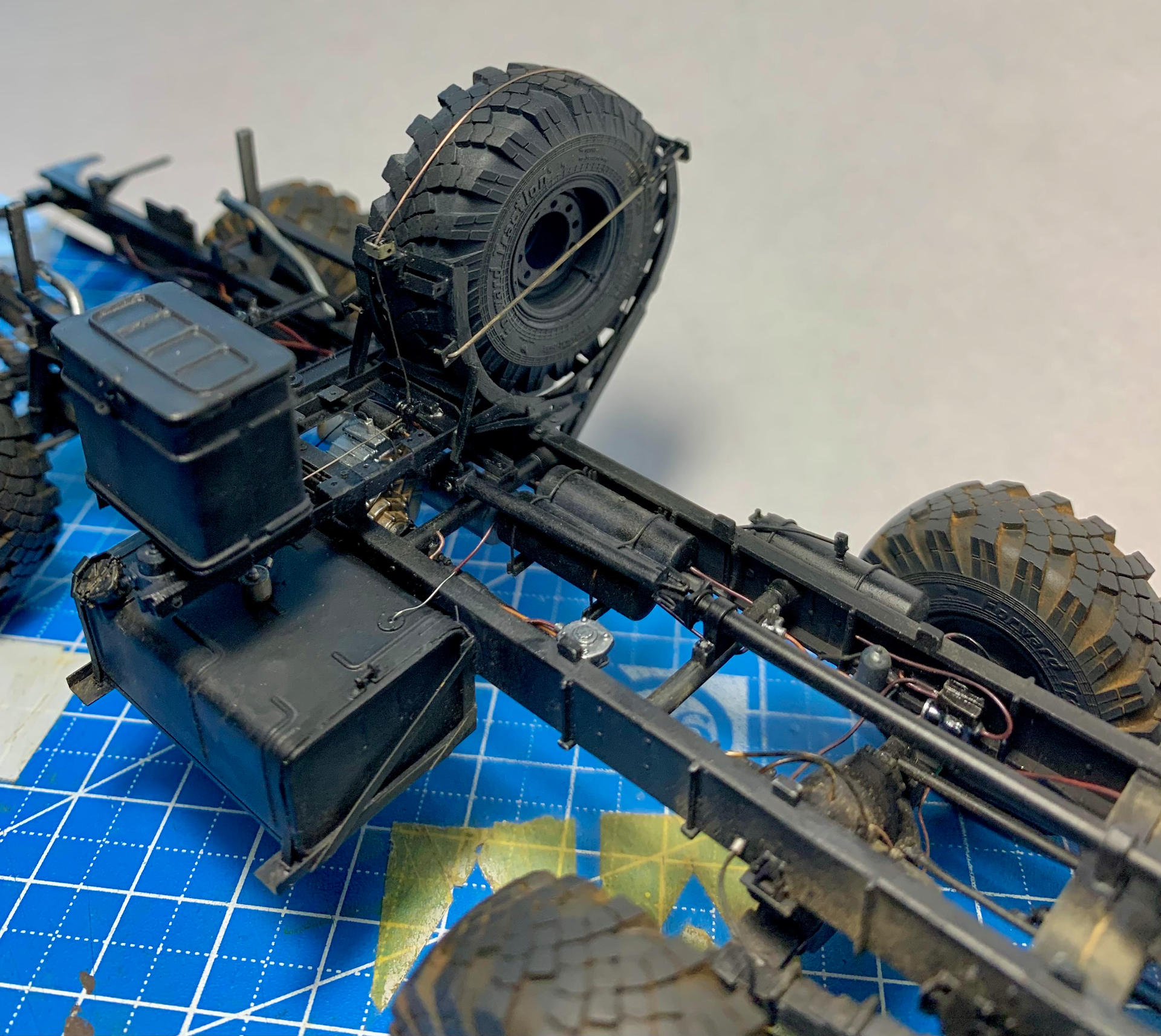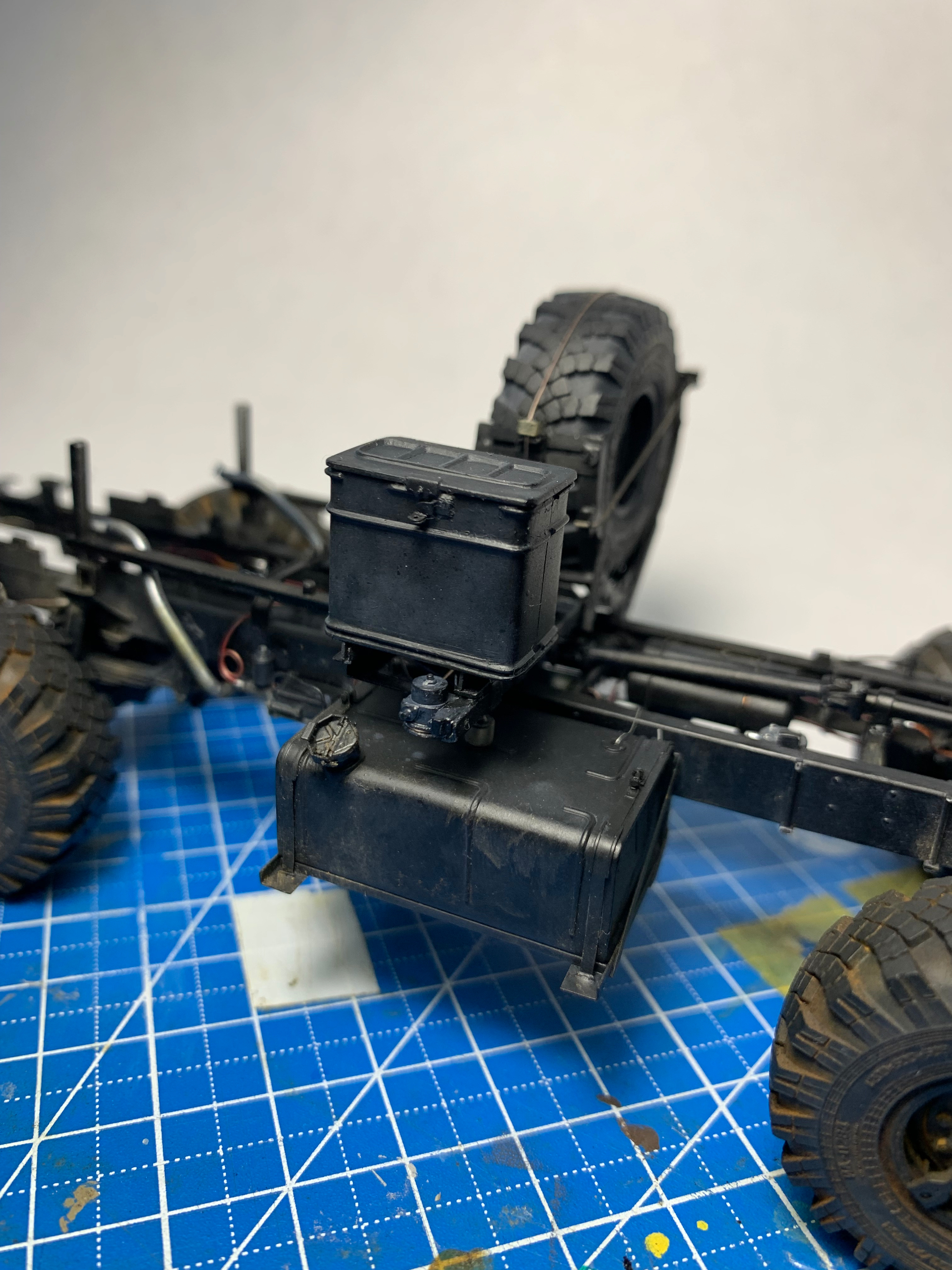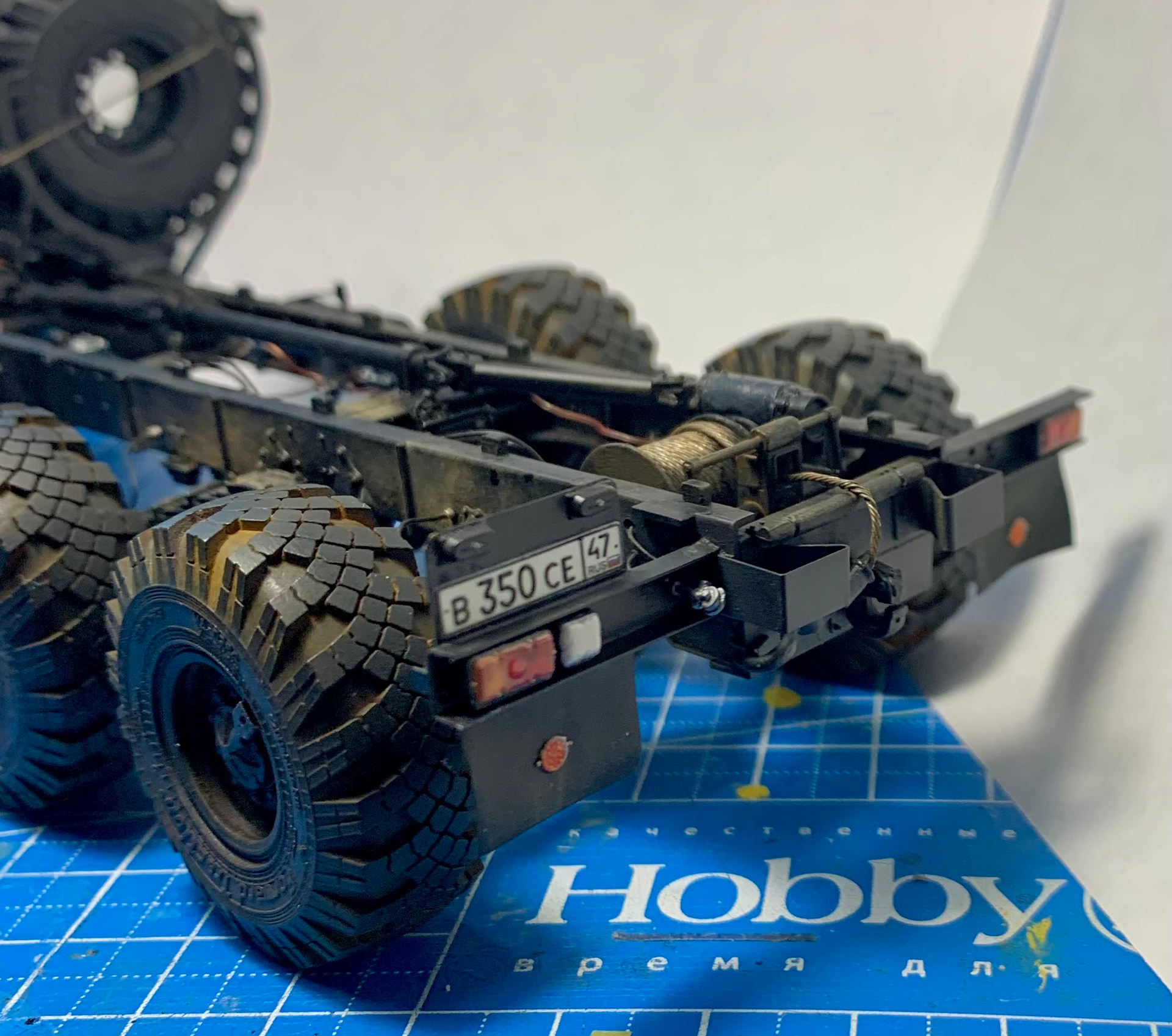 Hello, colleagues! The Ural 4320 model from the Zwith “minor” modifications: - the frame has been extended to 3800 mm. - a spare wheel mount has been made. - a new spare parts box has been made (I had to make two because I made a mistake with the size). - new mounts for the tail lights have been made. - small parts have been added to the frame (valves, regulators, etc.). - wiring has been added. - the front axle is pivoting… Only the frame is ready for now.