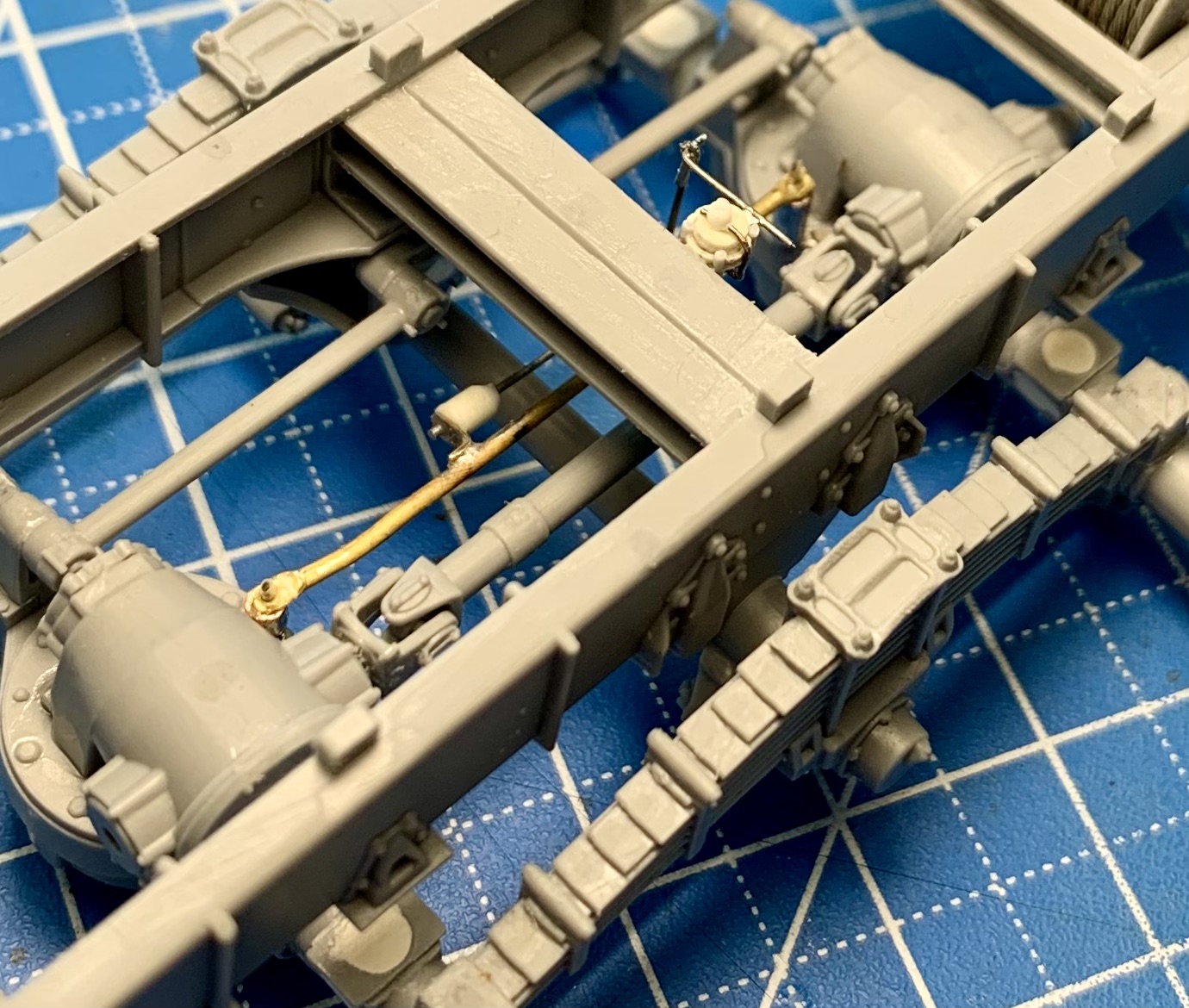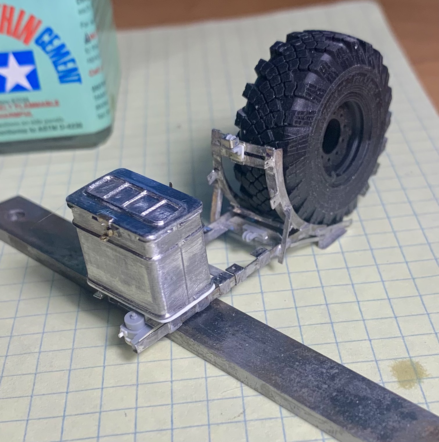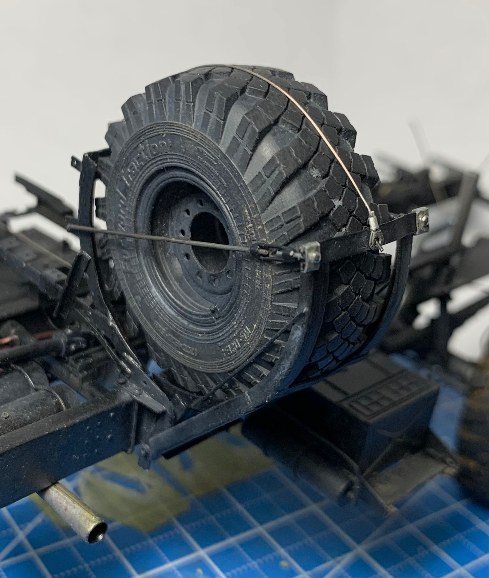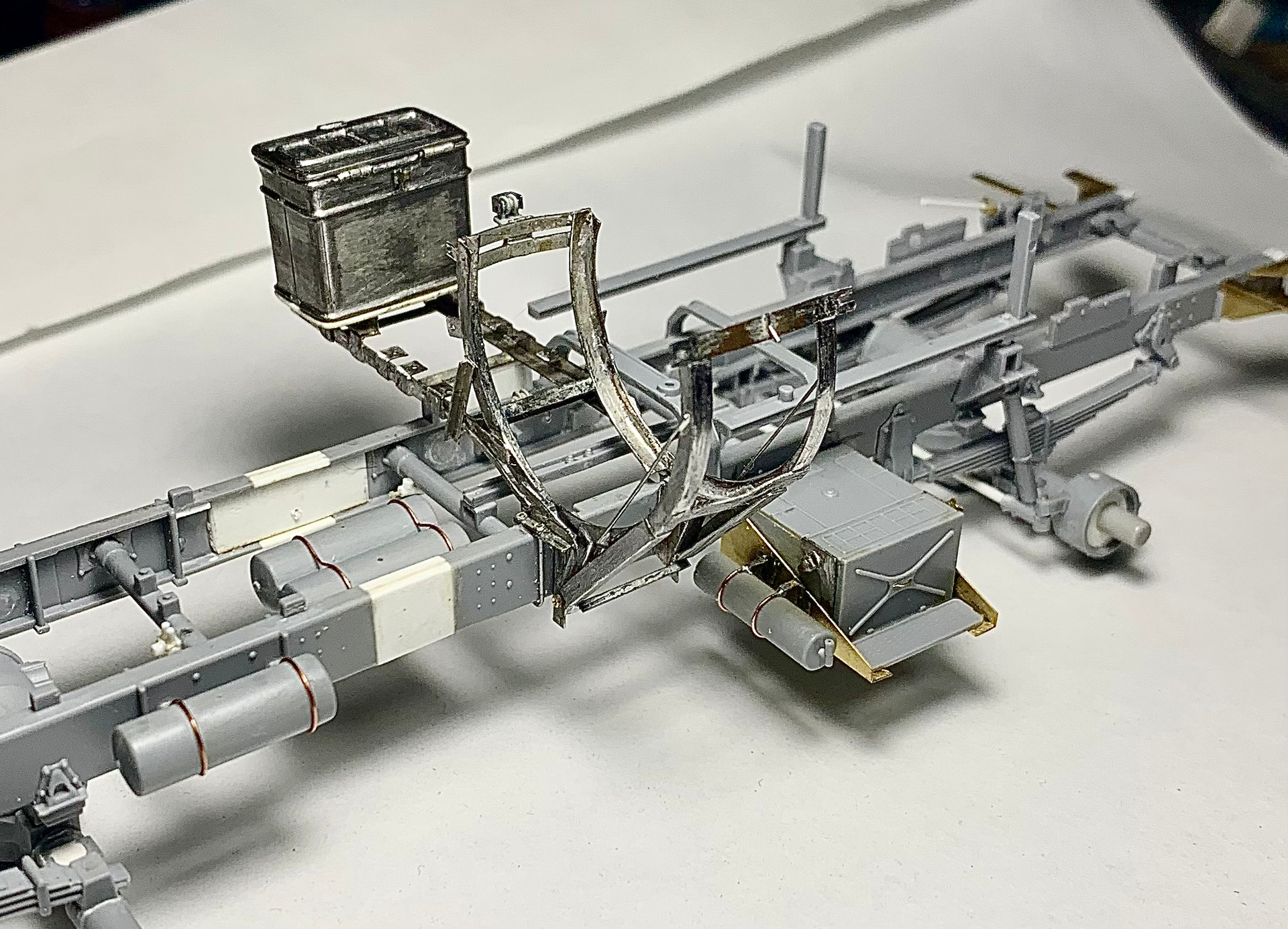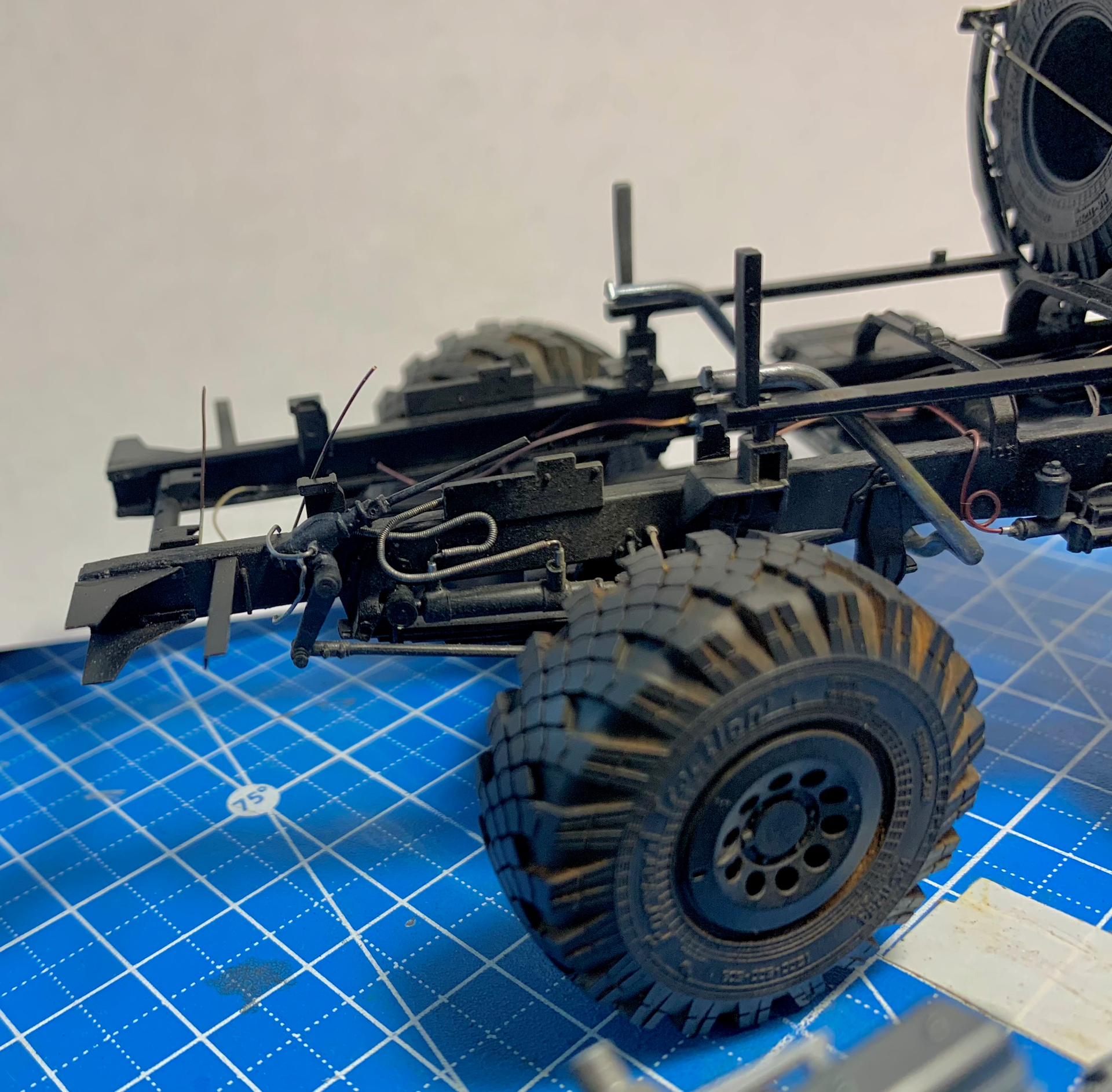 Hello, colleagues! The Ural 4320 model from the Zwith “minor” modifications: - the frame has been extended to 3800 mm. - a spare wheel mount has been made. - a new spare parts box has been made (I had to make two because I made a mistake with the size). - new mounts for the tail lights have been made. - small parts have been added to the frame (valves, regulators, etc.). - wiring has been added. - the front axle is pivoting… Only the frame is ready for now.