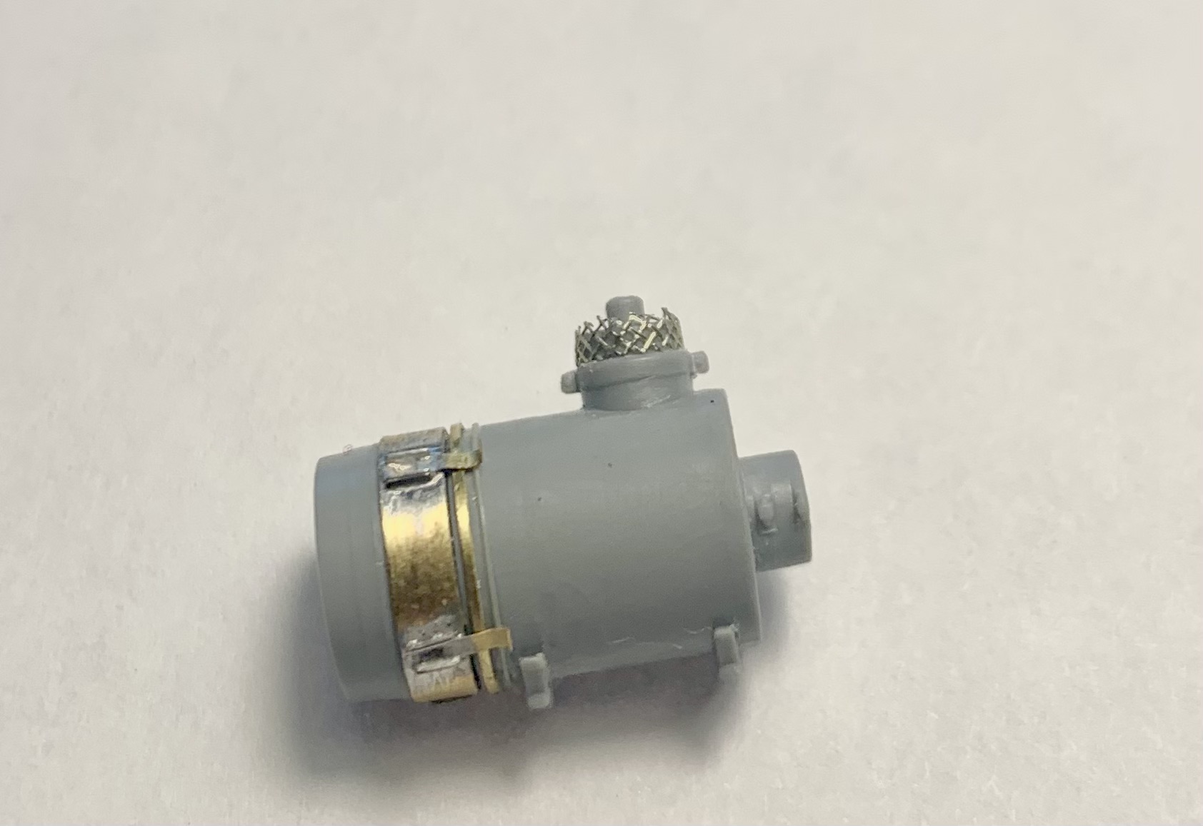 A few homemade parts. The plastic ribbing on the filter was removed, new plastic and metal rings were made, and a mesh was added. The windshield wipers are etched with some modifications.