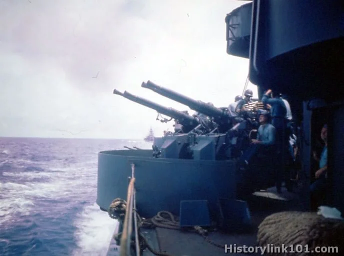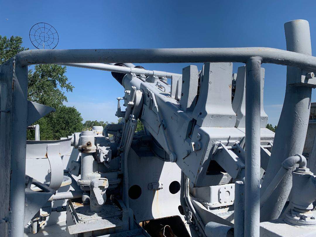 If he is making the gun with a shield, the exterior shield color should match the camouflage pattern of the ship. The interior shield color may or may not match the camouflage pattern of the ship. In the photo of USS Missouri BB-63 below, you can see the Bofors mounts’ shield exterior and interior color matches the color of the superstructure. This was common, but not universal. The color here is “5-H Haze Gray”. It is a medium gray (see paint chip below). There were actually two different Haze Grays in use during World War Two. One was a pure gray, the other had a more bluish tone, almost lavender.