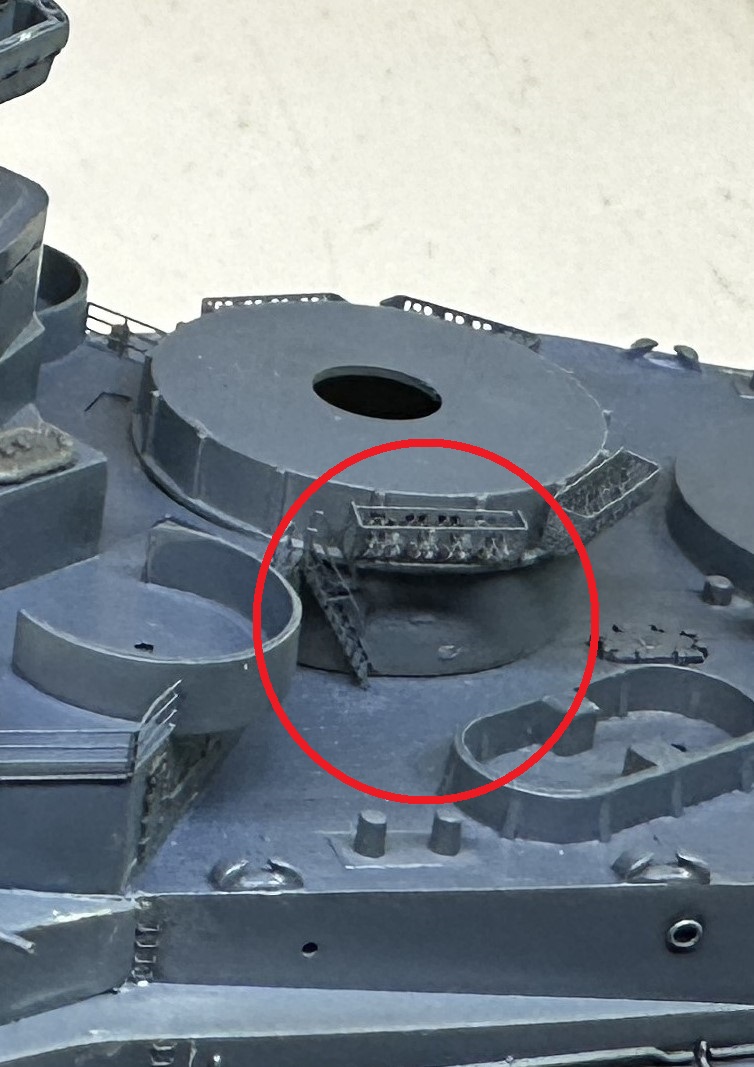 A word of caution to anyone who see’s this while building Texas. The instructions are vague about the placement of the paravanes on the forward barbette and seem to indicate they be glued towards the back. Don’t do this as I did because that will block the placement of ladders later on.