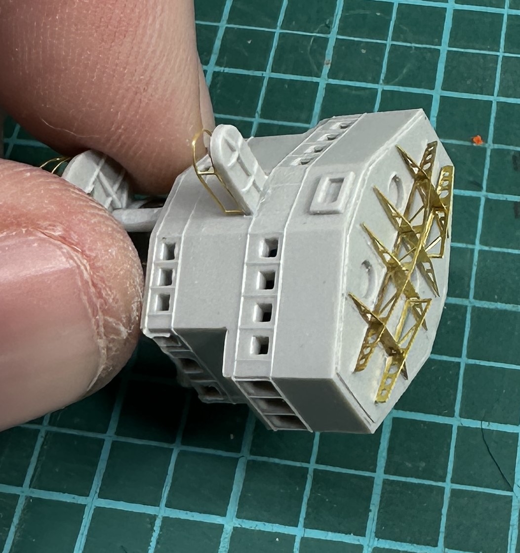 I had to dig into my spares for a ladder for the funnel as one isn’t included in the kit PE. I am using that most versatile of resources to get some details…World of Warships! Luckily I have USS Texas in my port and she is very detailed. I will be using that for my rigging guide later.