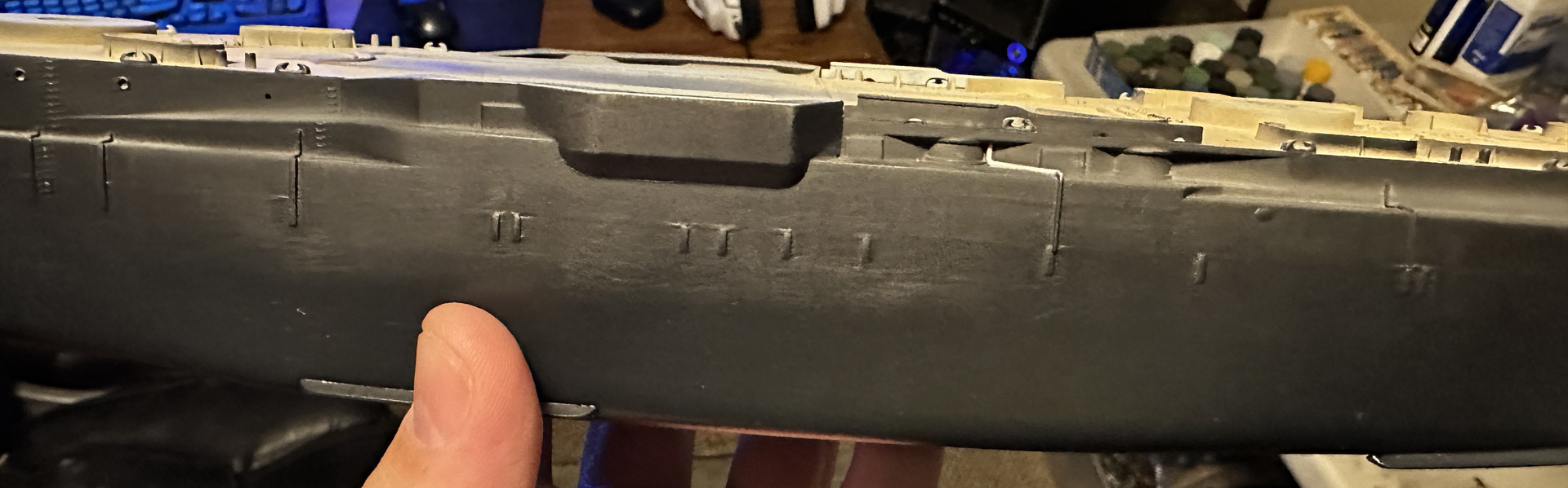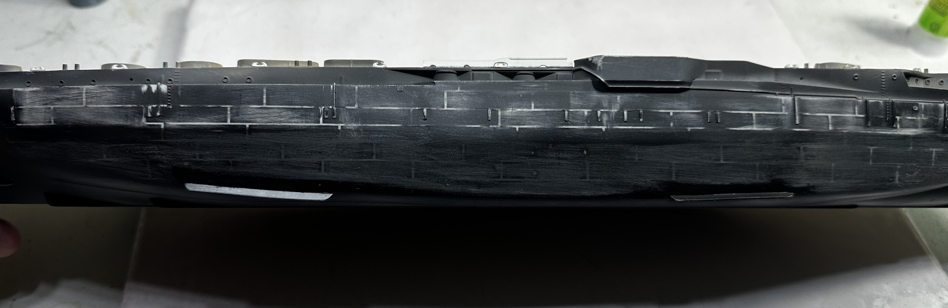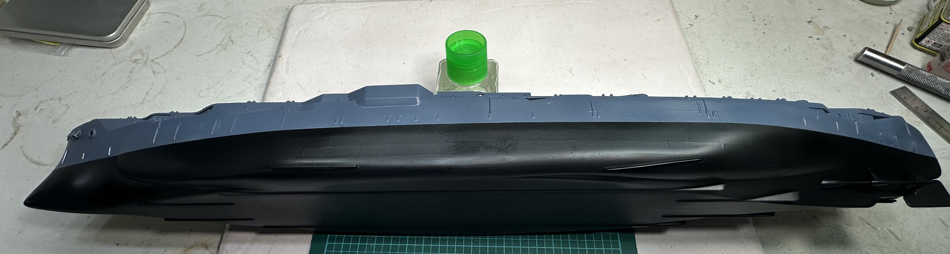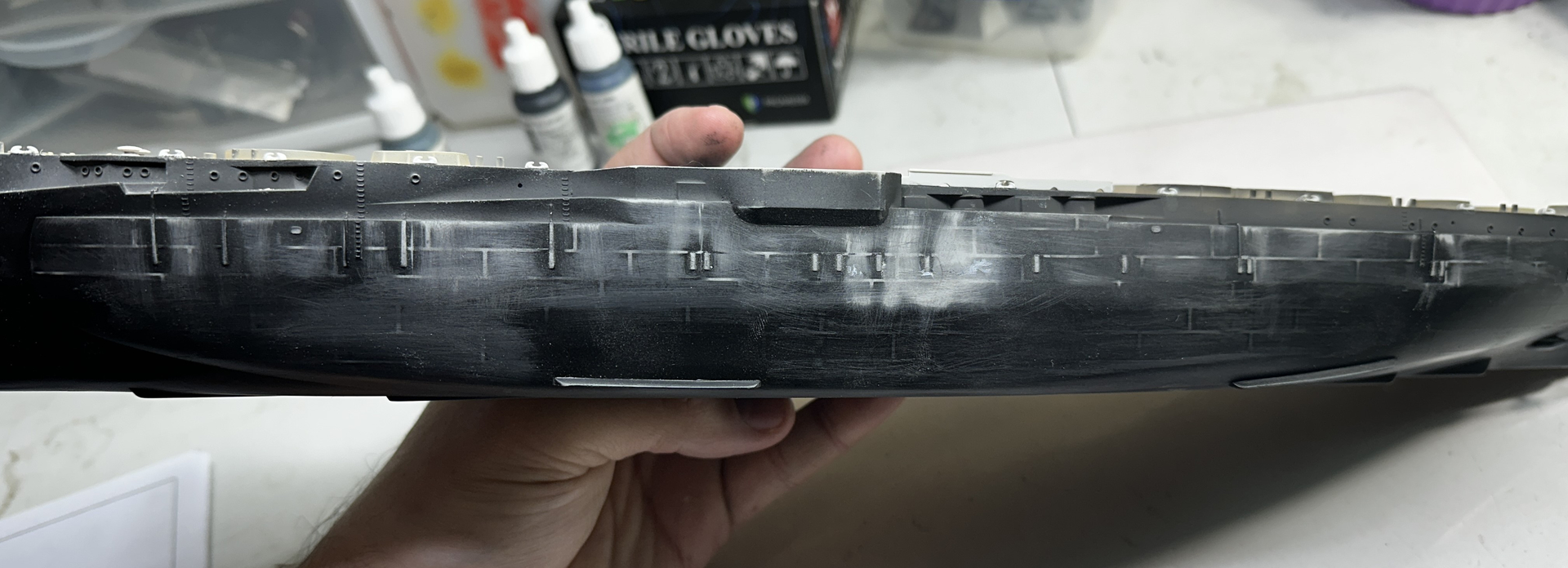 This weeks progress. I applied my black to the hull and the massive plate lines were still showing up. So back to sanding I went. I have hopefully gotten them all knocked back.