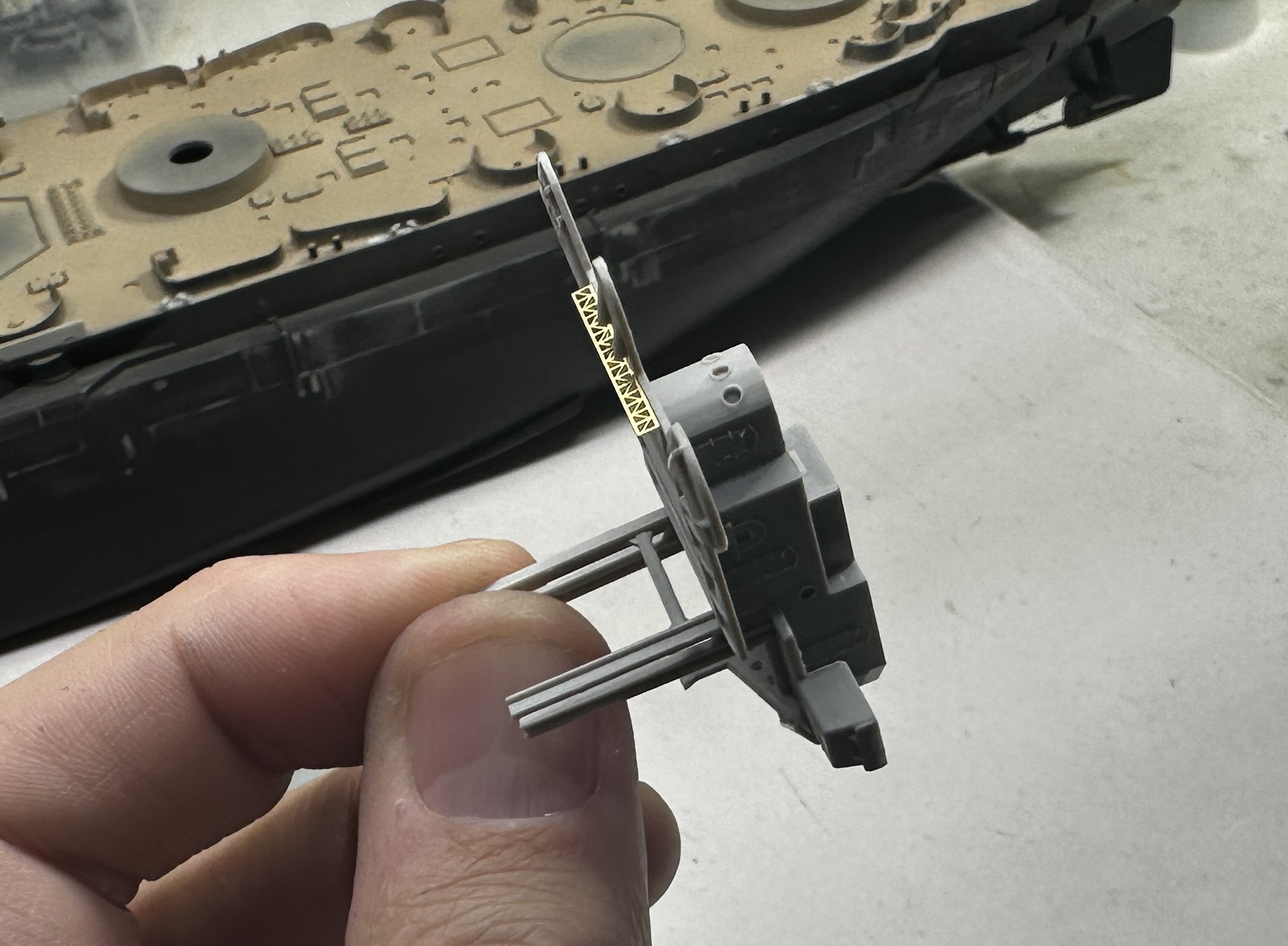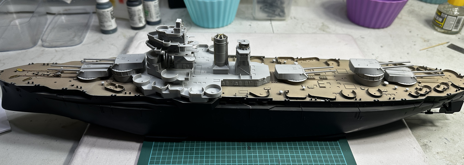 1 step forward, 1 step back. I had looked at photos and updates on her progress and it looked like they were going to leave the deck bare. So I have painted her deck in tan, preparing for a wash.