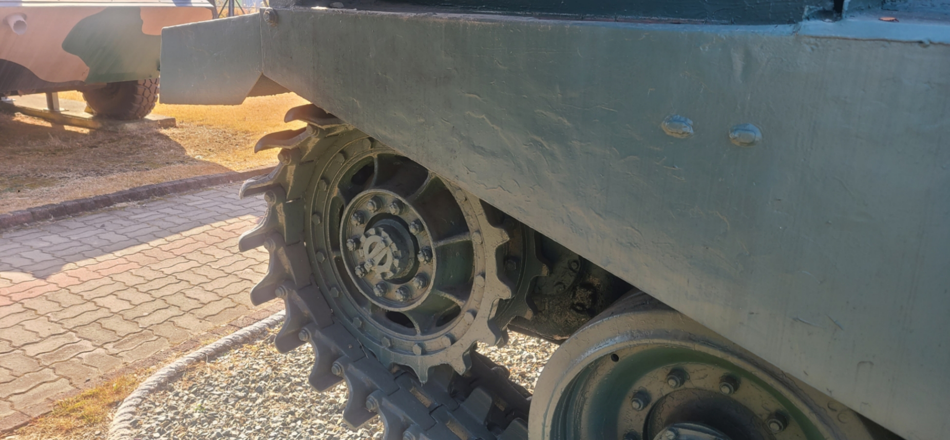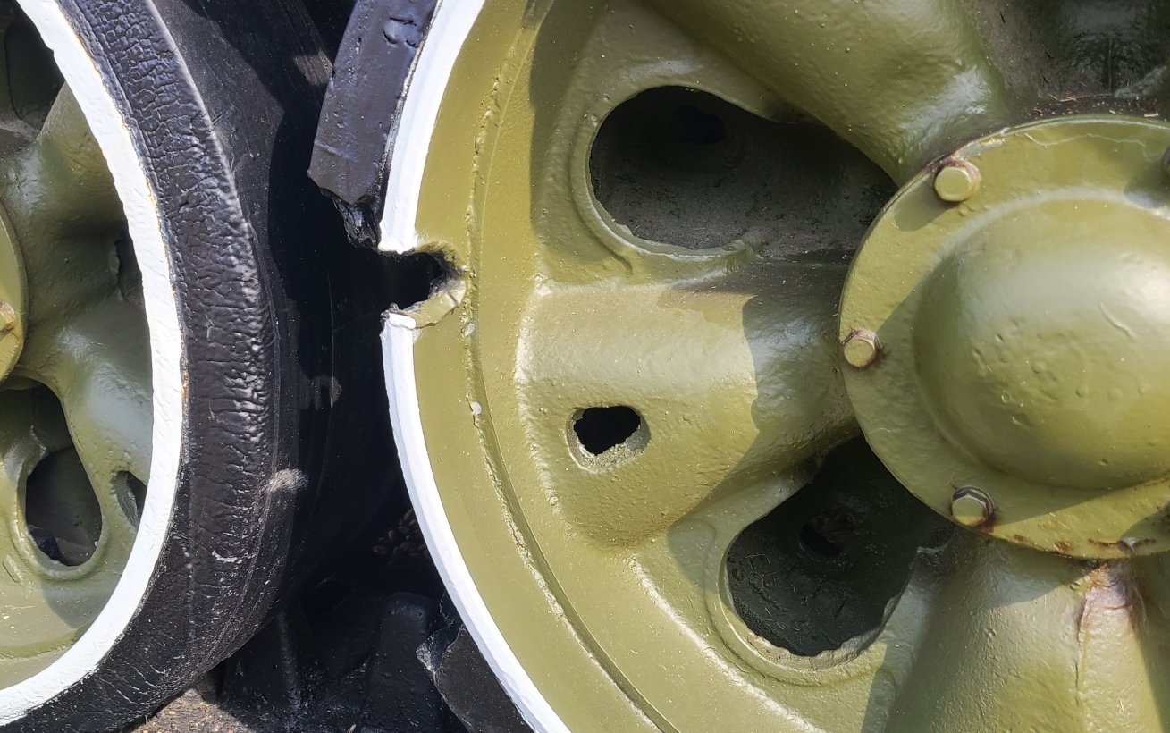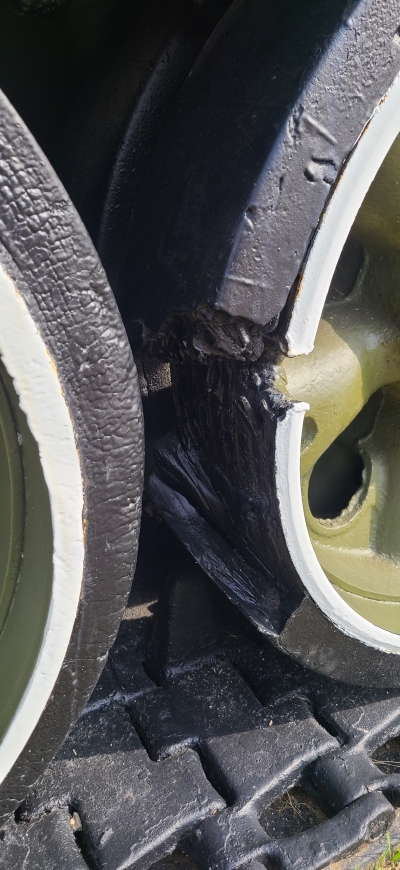 There is a visible hole in the front of the wheel and the rubber has been violently torn away. It is presumed that the damage was caused by shrapnel from a nearby detonation of a 105mm or 155mm high-explosive shell. or a direct shot of Recoilless rifle or M72 LAW, Idk.