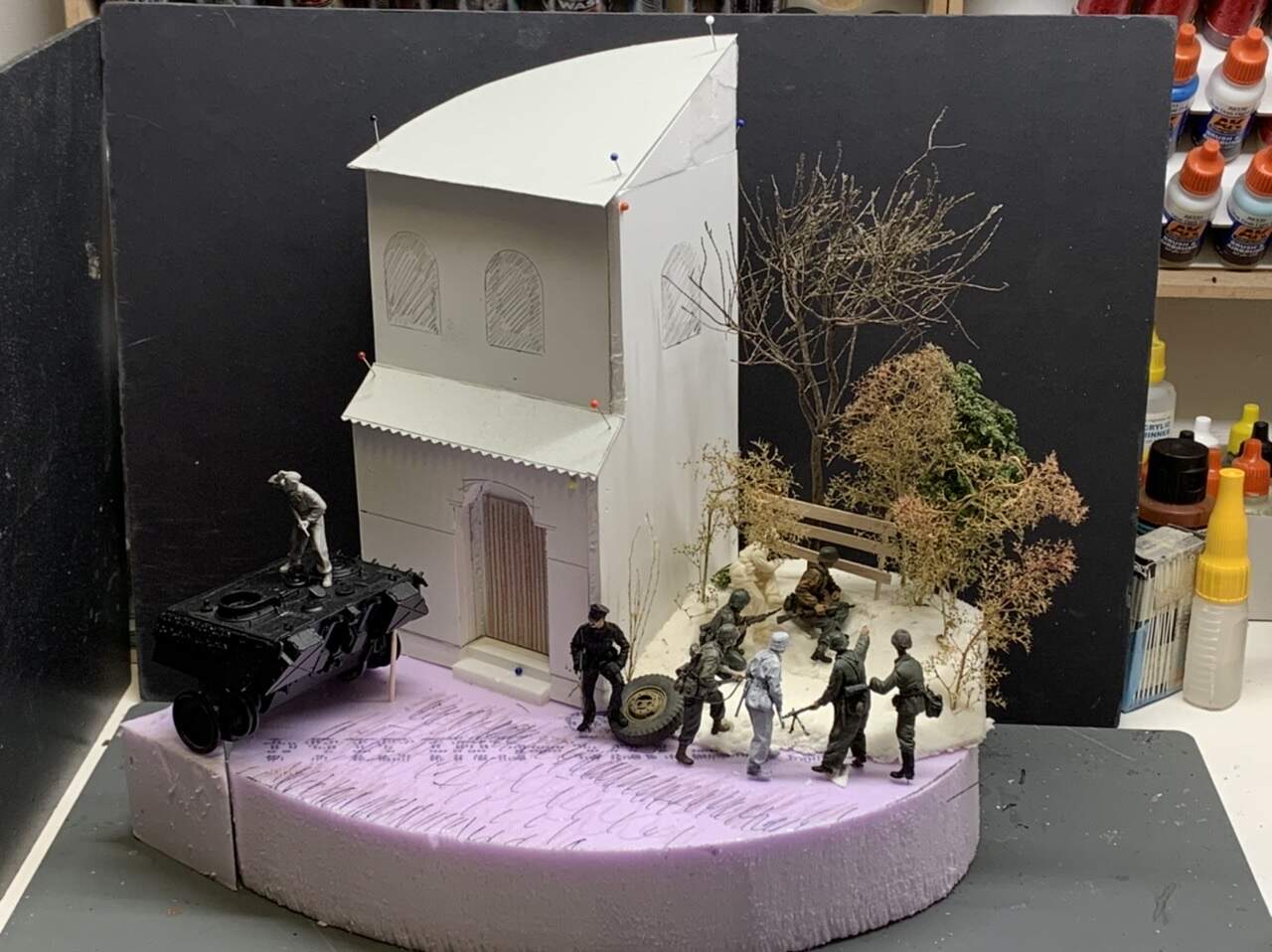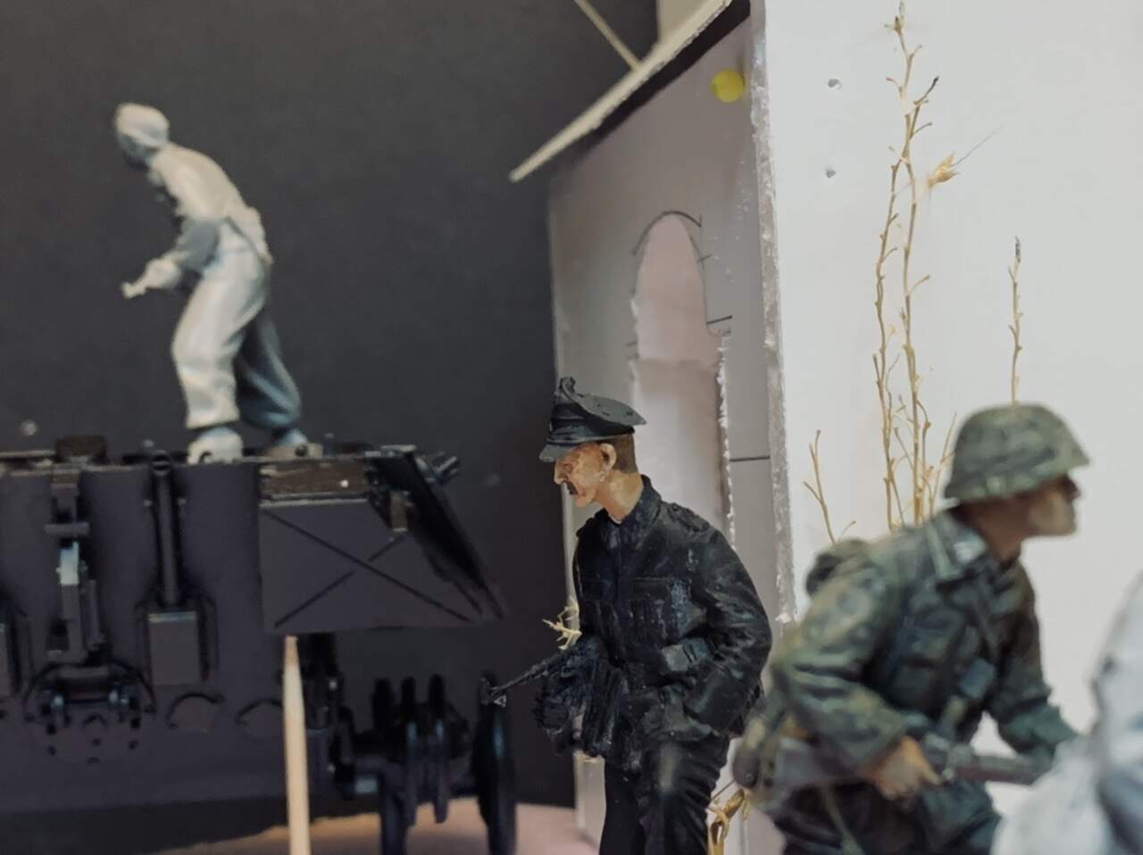 I like your dio idea very much. The only exception is the old Panzer officer. He looks too old to me. Old enough to be a Volksstrum member. I would replace him and the tyre with someone who looks less geriatric (hey, he looks older than me and I’m 68) and an ammo crate, rock or some brick debris.