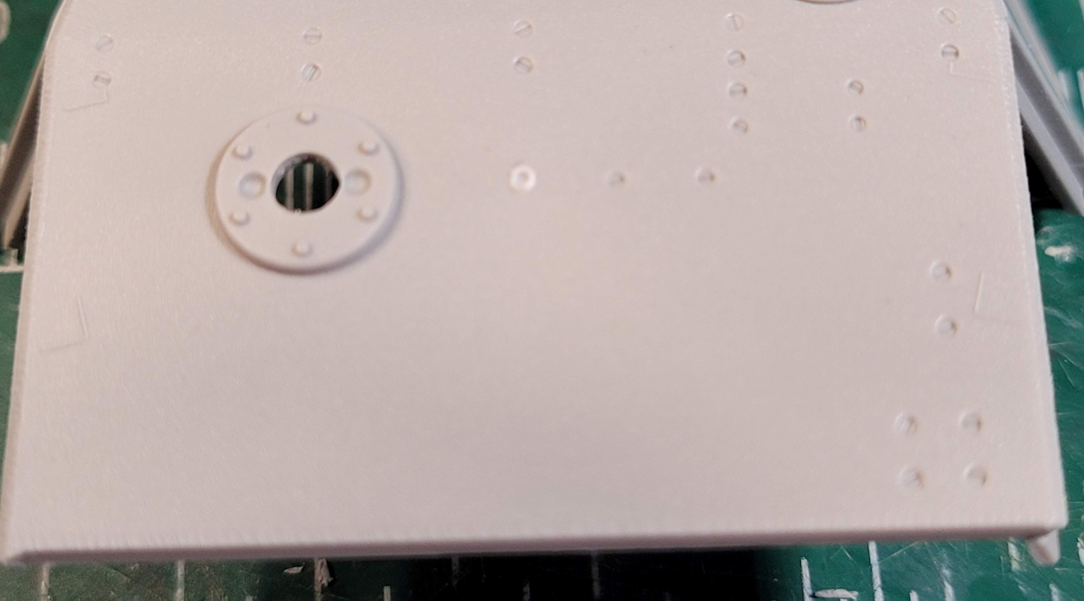 Added rest of front armor plus texture, added texture to upper hull due to lots of tooling artifacts that may not show in pictures, added tow cable holder to rear. Discovered the kit parts were missing so that’s why that’s white styrene.