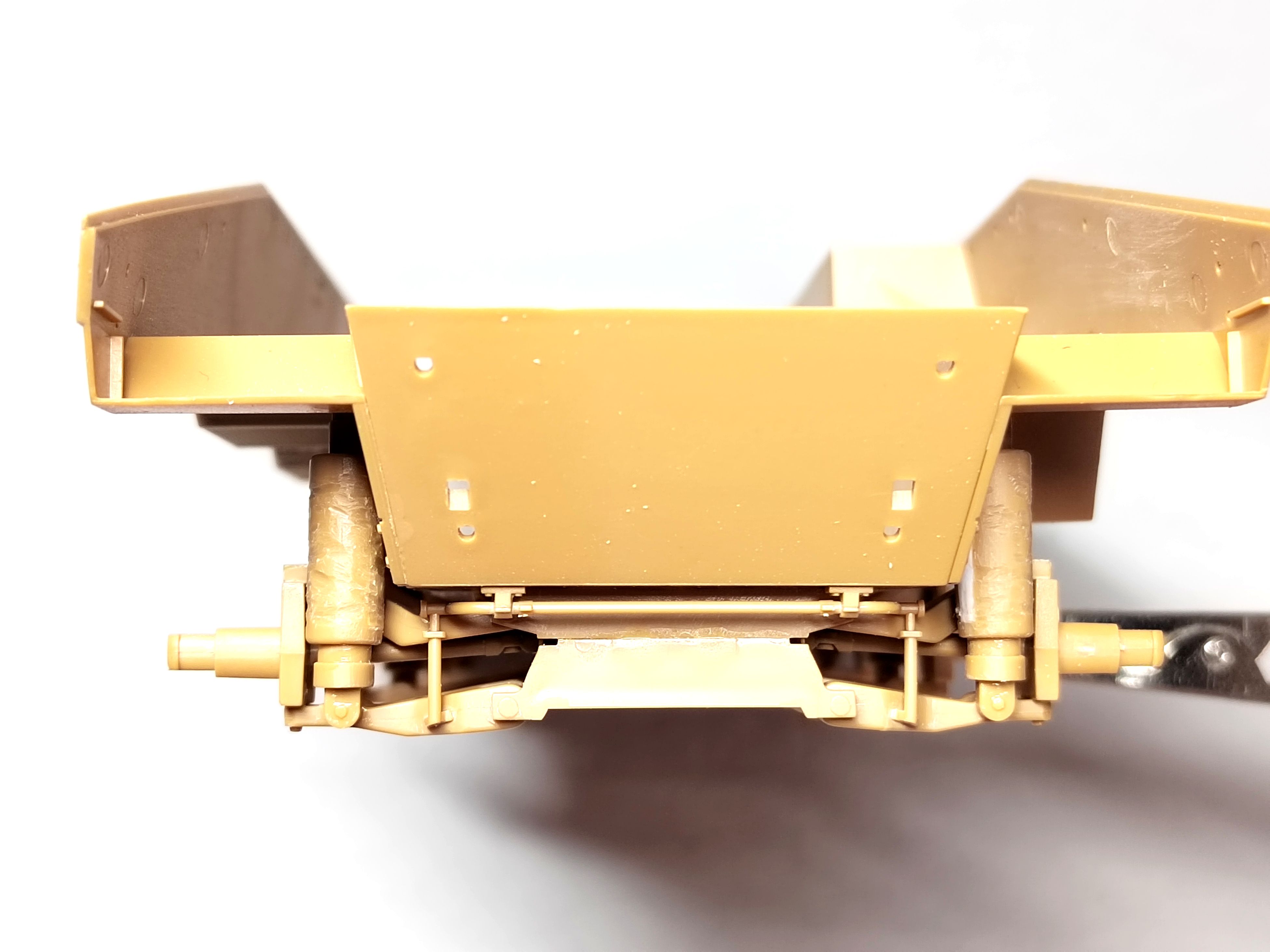 Before starting the detailing of the interior, I had to tackle the shock absorbers. Heller molded them with a huge hole facing the hull sides. The four at the first front axle and the rear most axle really need to be fixed. Then the plastic covers need to have their smooth look removed.