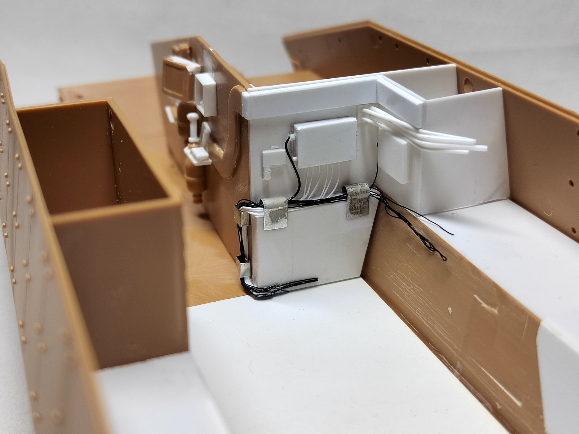 The vehicle floor is not correct either even for the VBCI. I cut it and only kept the front part because I wanted the notches to position the engine wall correctly. The fictitious seat supports are removed. The rear part is simply replaced by a large rectangle of plastic card.