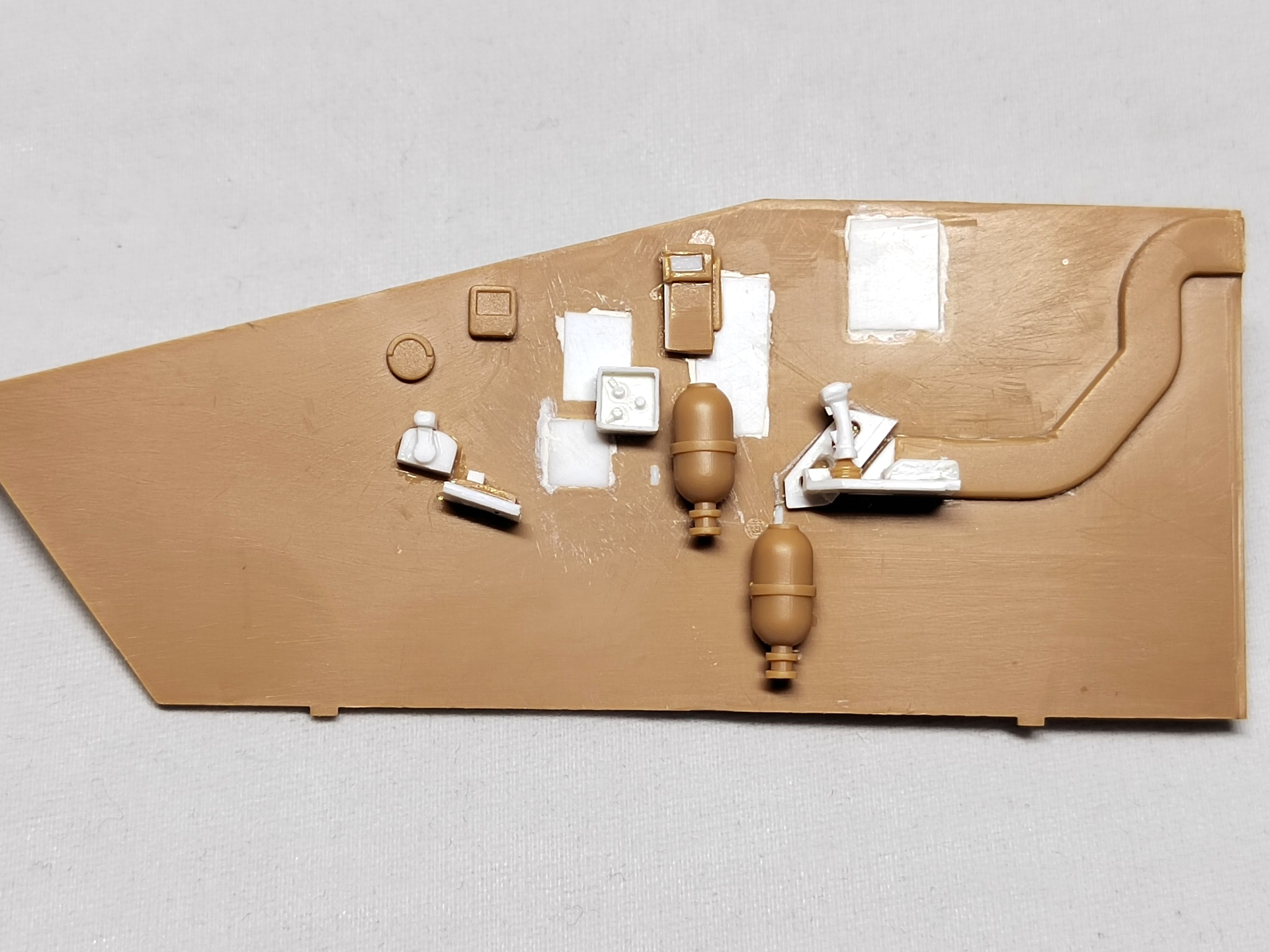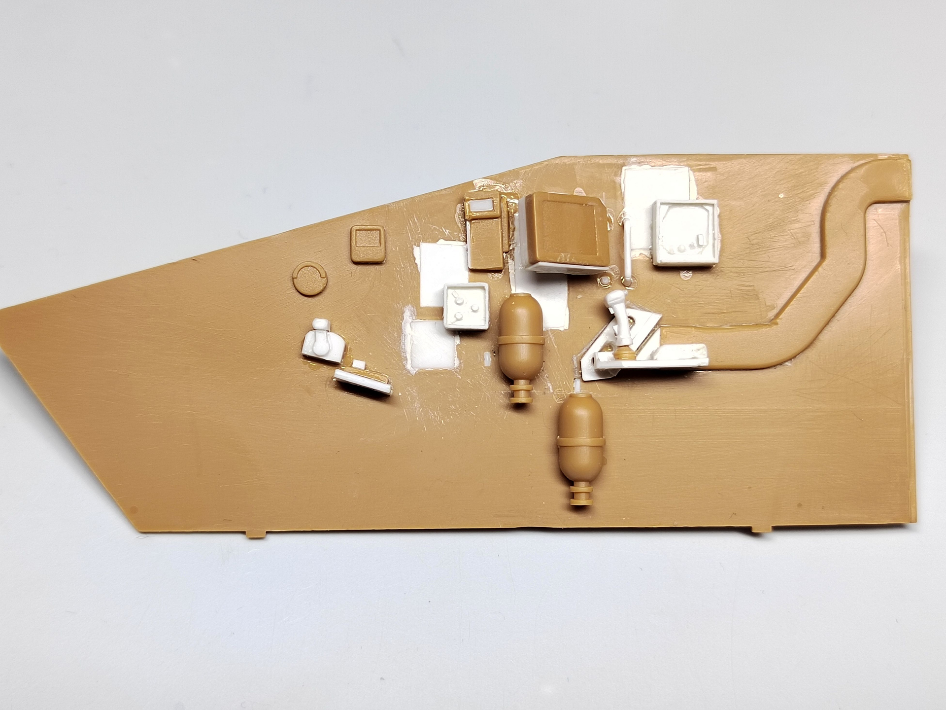I cut off nearly all the molded details (and of course the turret wall) and filled the extinguishers positioning slots. Then I made new instruments, put them at the right place and glued the extinguishers at the right place as well. I still miss one control box and the gunner control screen which I don’t know how it is fixed to the engine wall (or the roof).