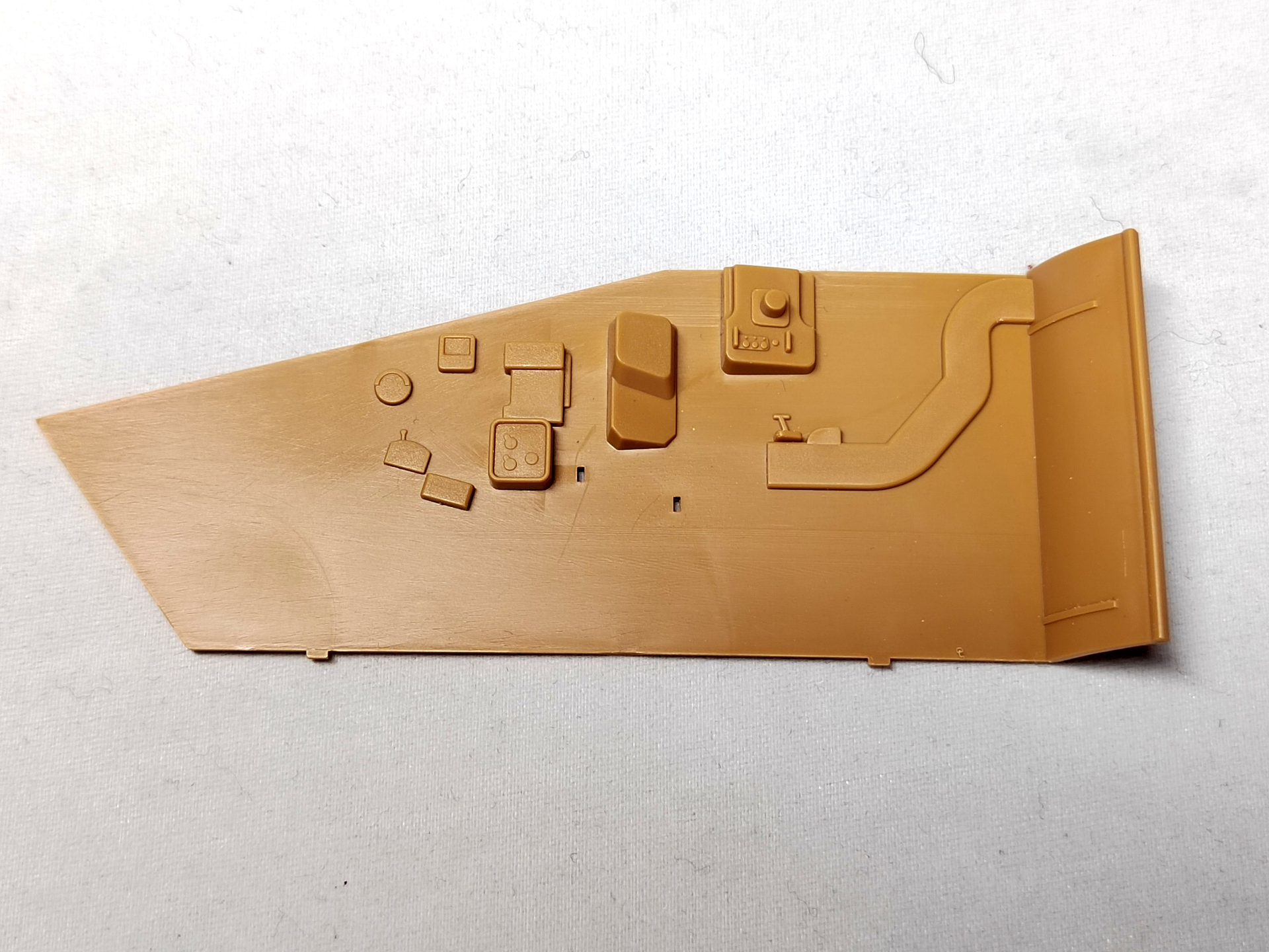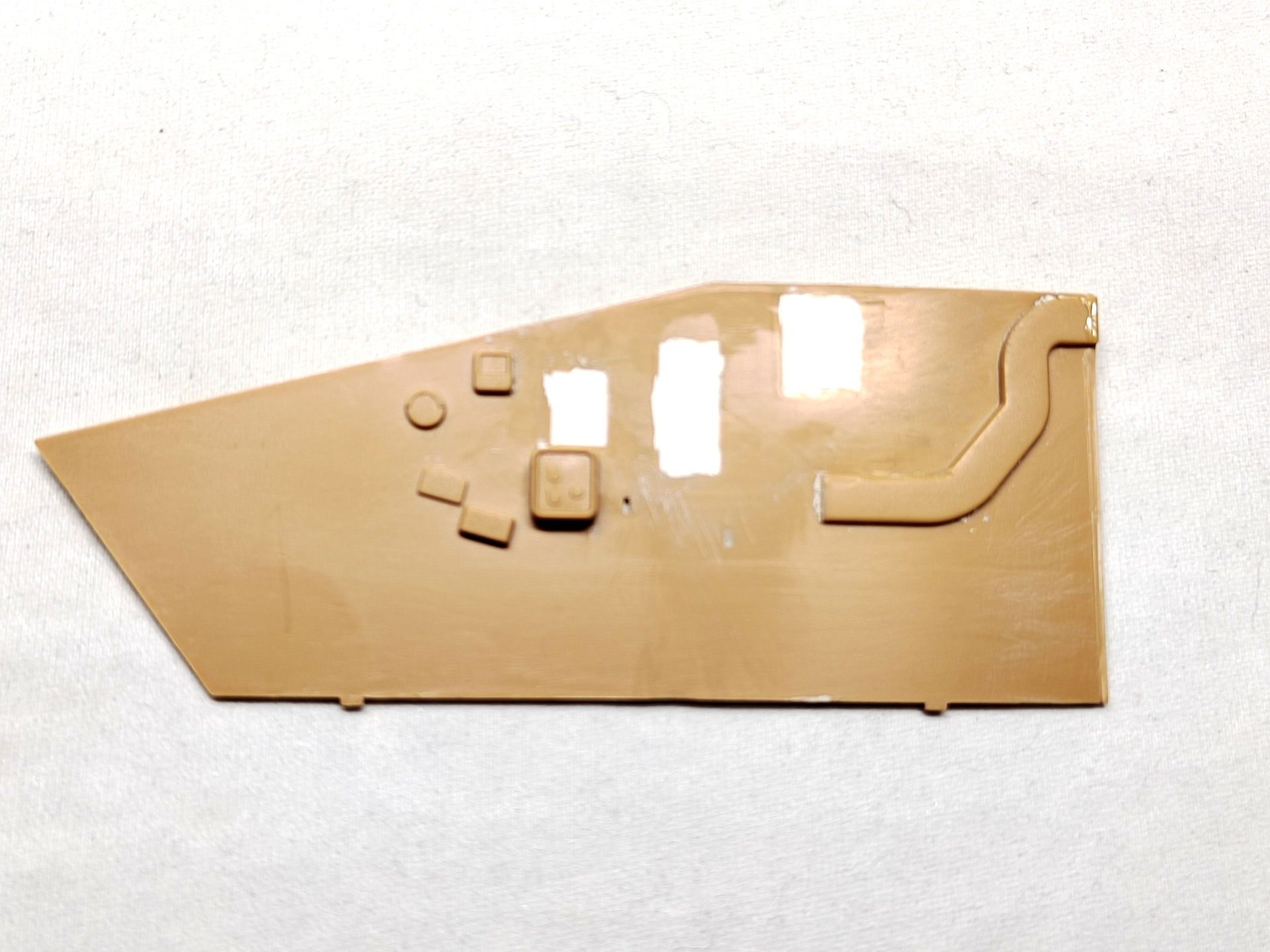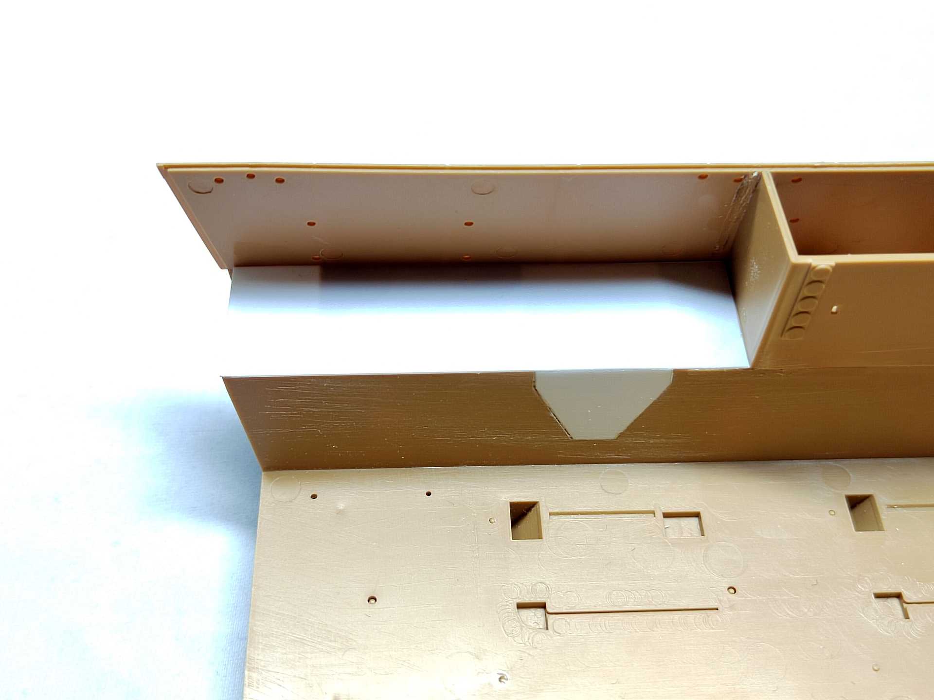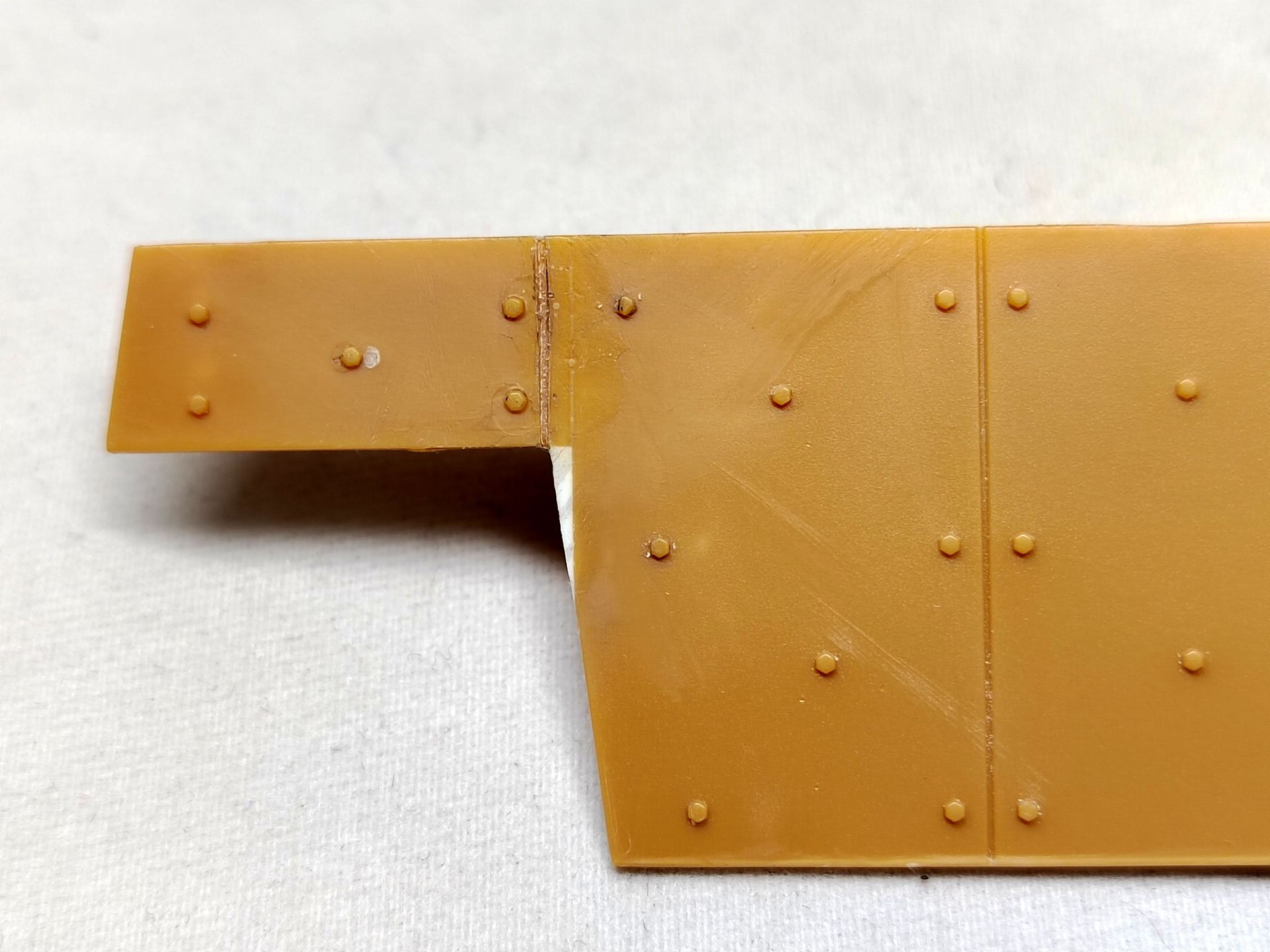 The “wings” should not have a 90° angle. So I added a piece of styrene and created the correct oblique shape. The boltheads were moved to the exterior and the original panel line has been filled and a new one engraved at the right place.