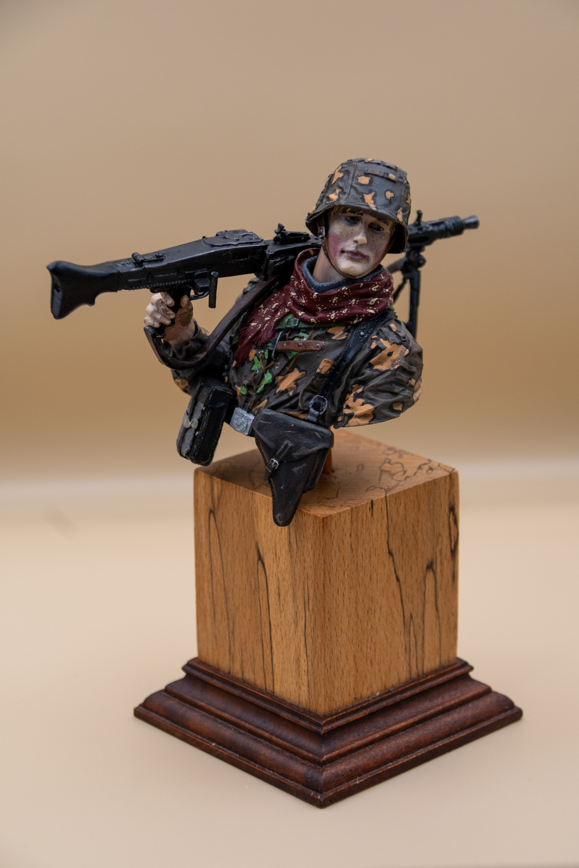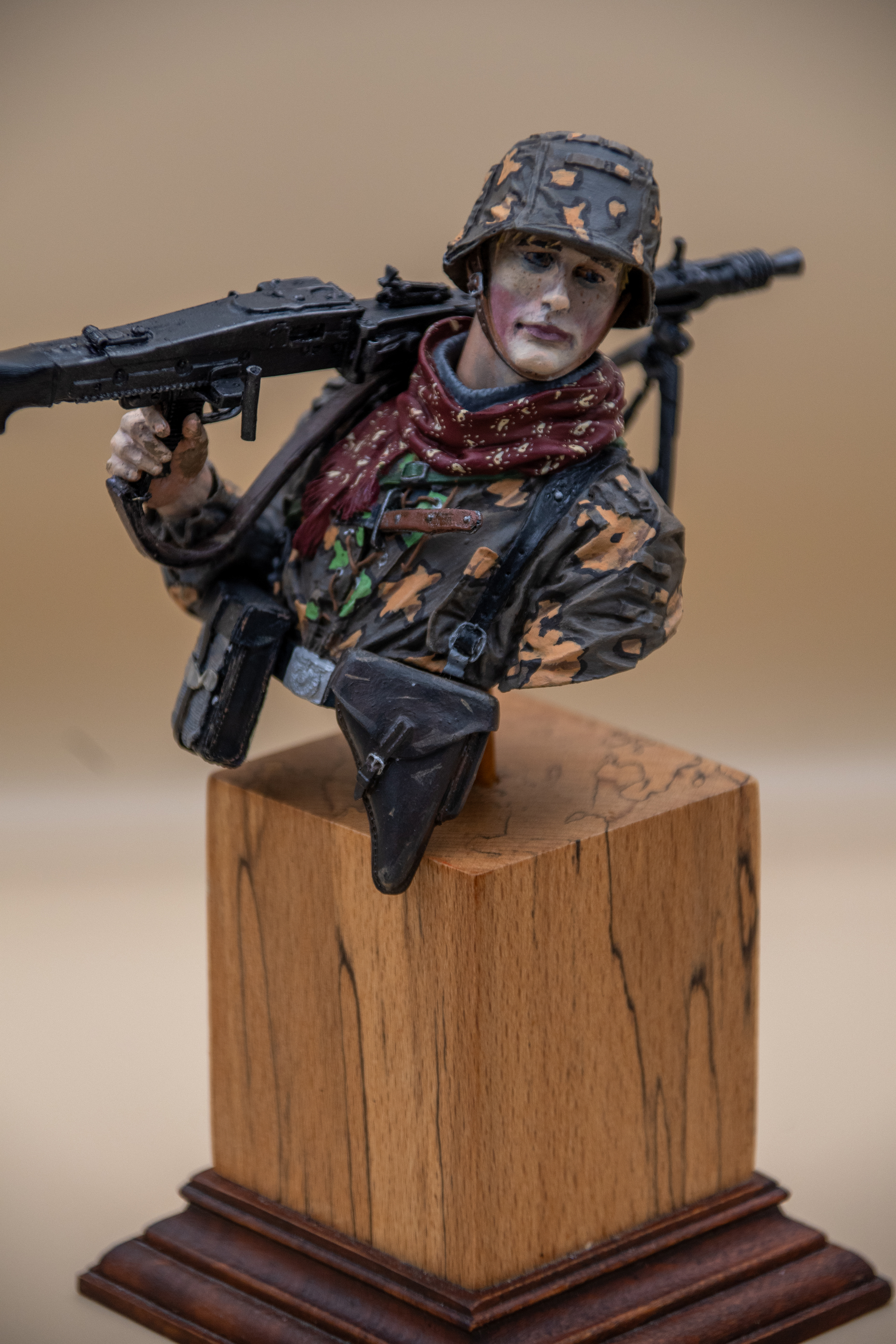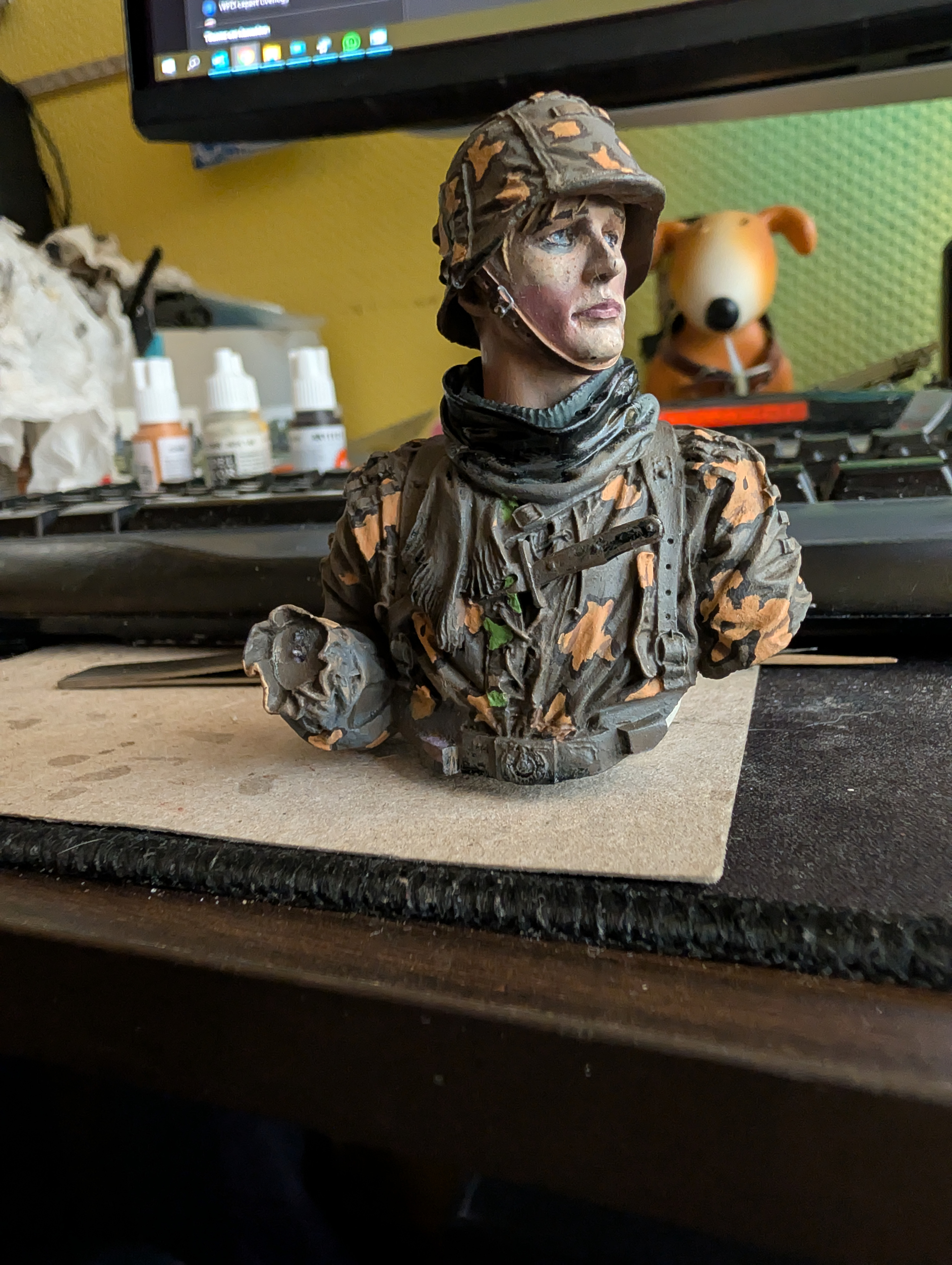 Congrats on getting it all finished up Erwin- it is a really nice piece of work finished in that particular camo scheme. I like the way you have scuffed up the leather items too and also the way you have finished the face.