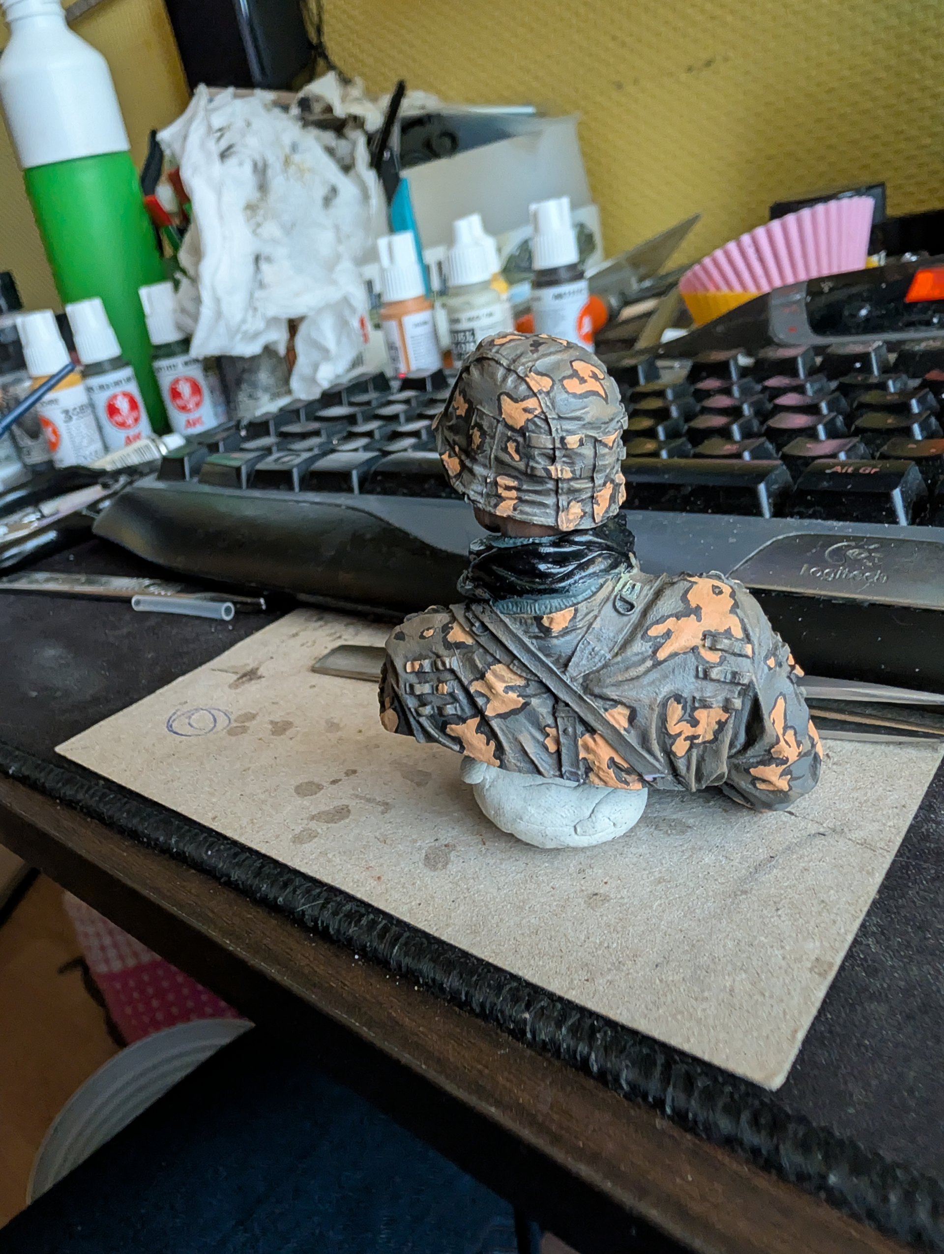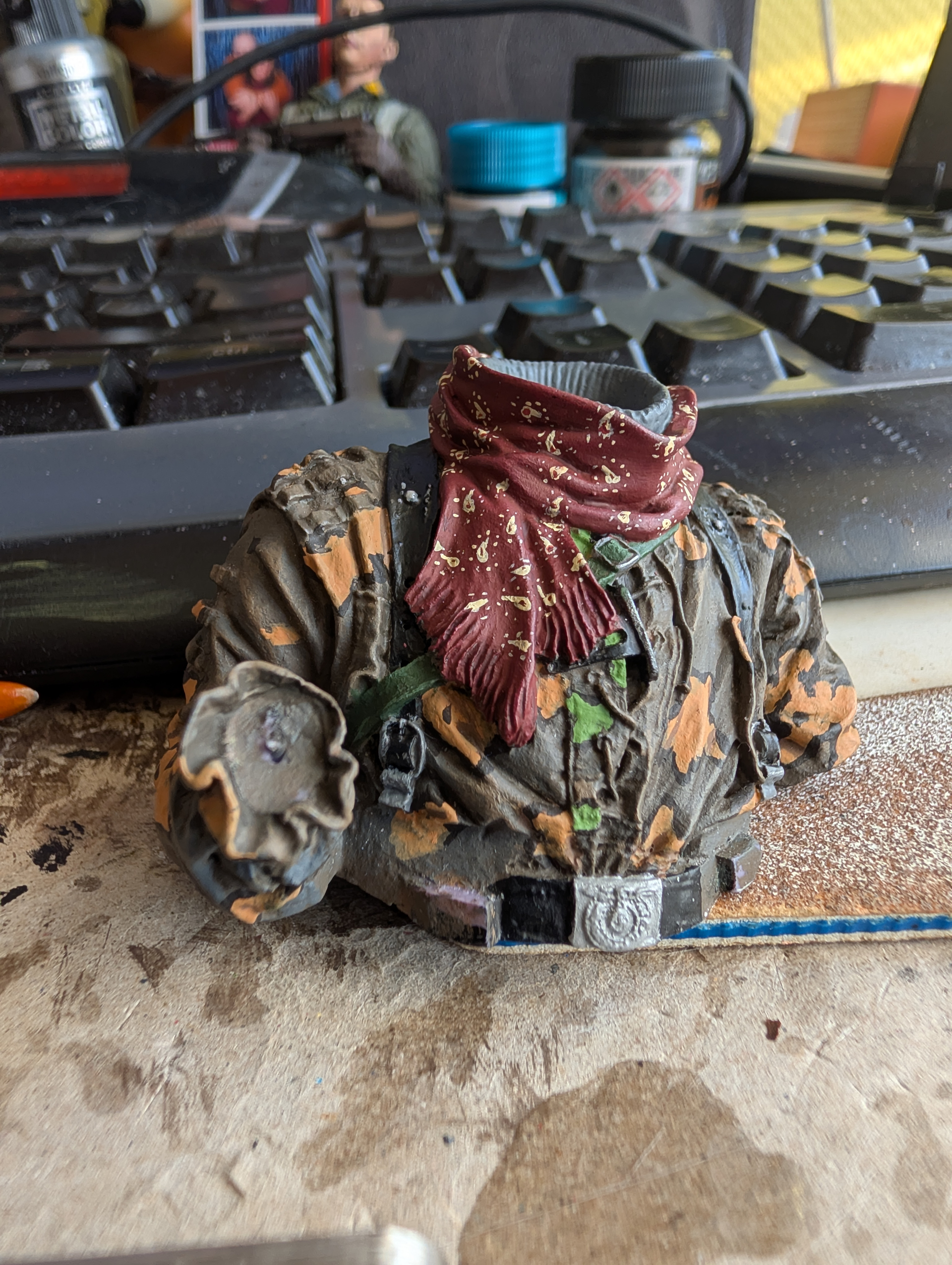 Really like that scarf, very authentic. There are some old pictures of Waffen SS men taken in the French campaign of 1940 and they are all wearing colourful scarves (one is tartan IIRC) which completely undermine the effect of the camouflaged clothing!