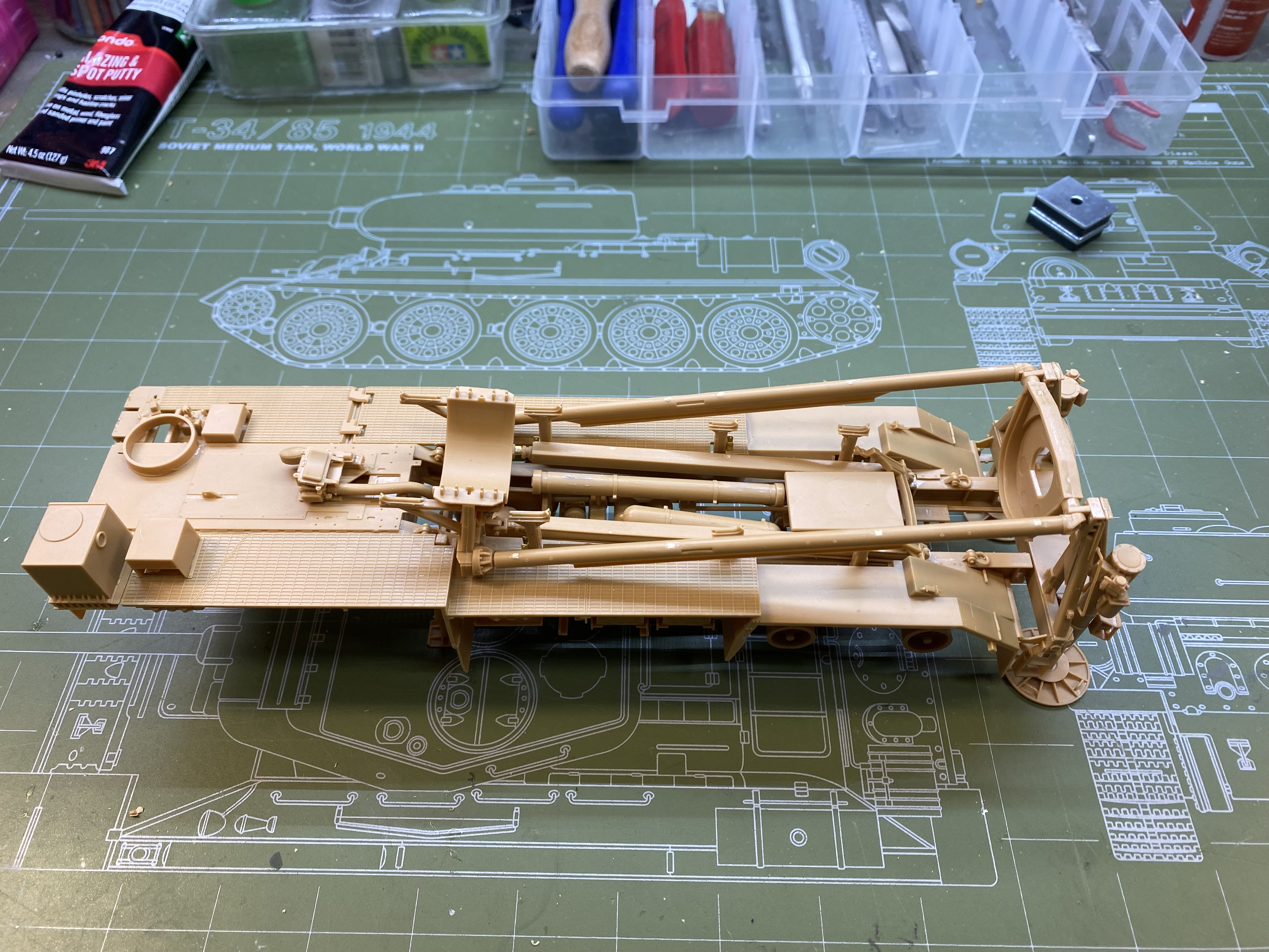 Now I have to assemble the front work table in the down position so I can show the carriage for the warhead and radar sections swung out to the front.