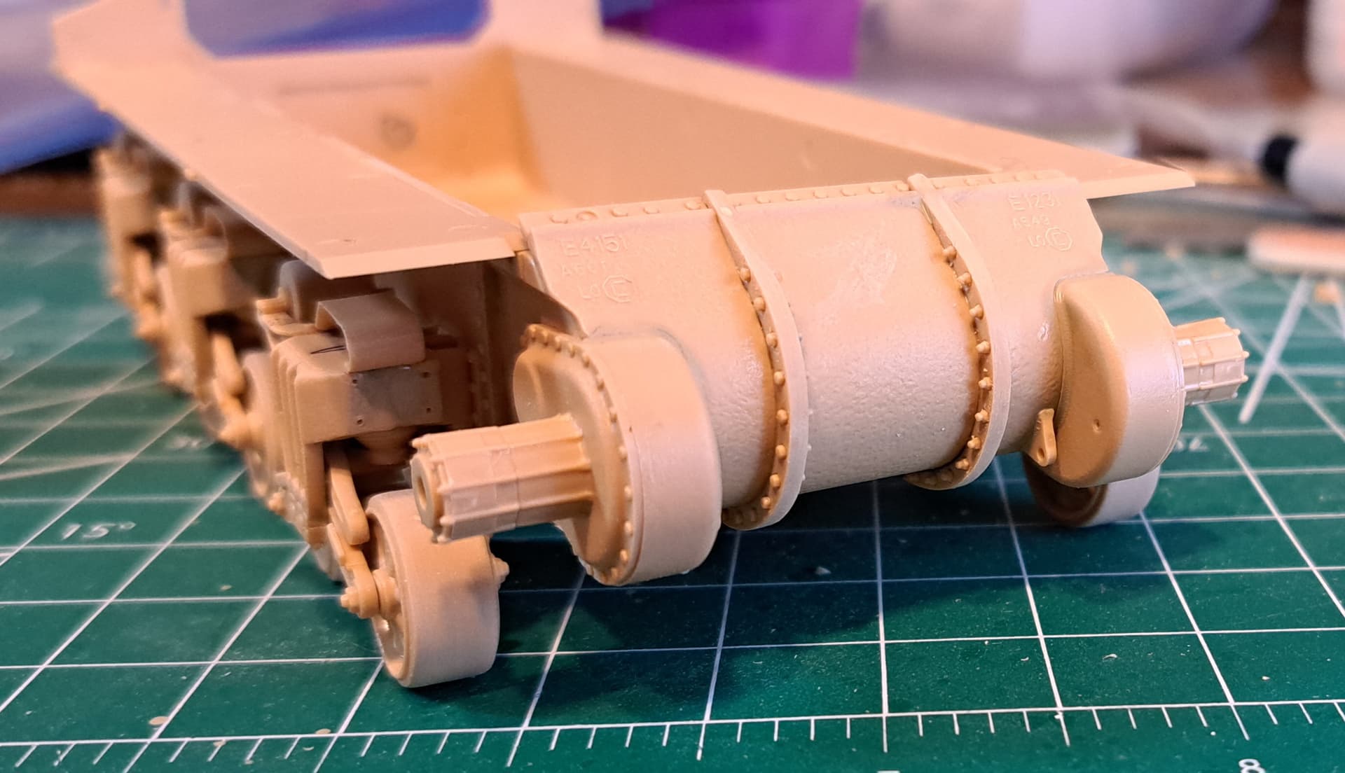Tank commander primed, side skirts painted, tracks primed black and dry brushed and started painting the tyres on the wheels, hull got a gloss coat and built the tow ropes.
