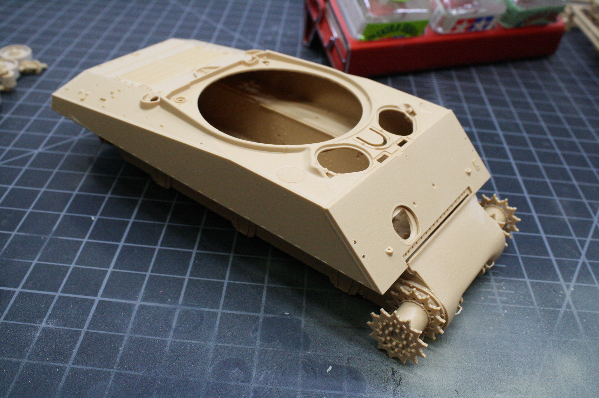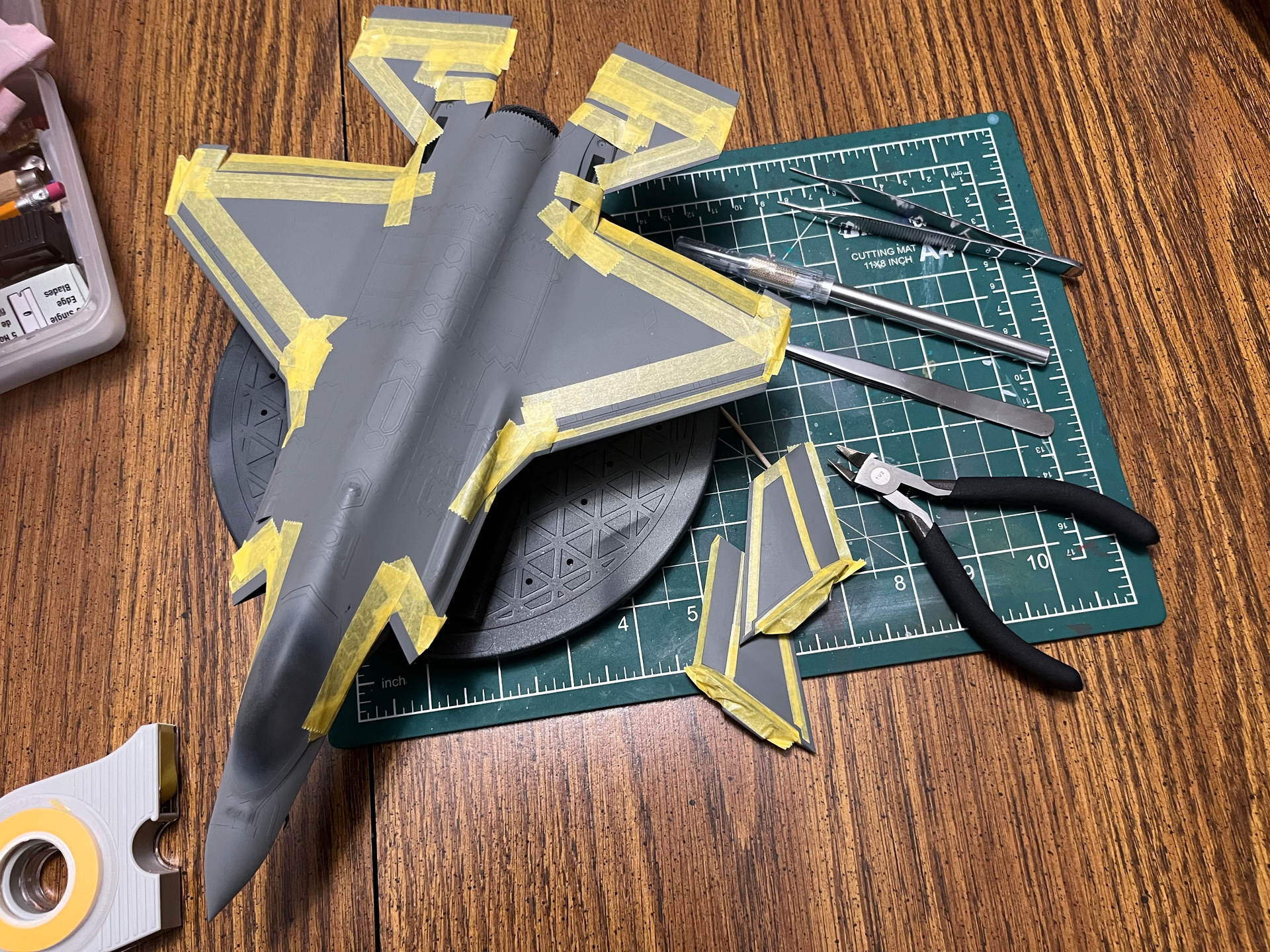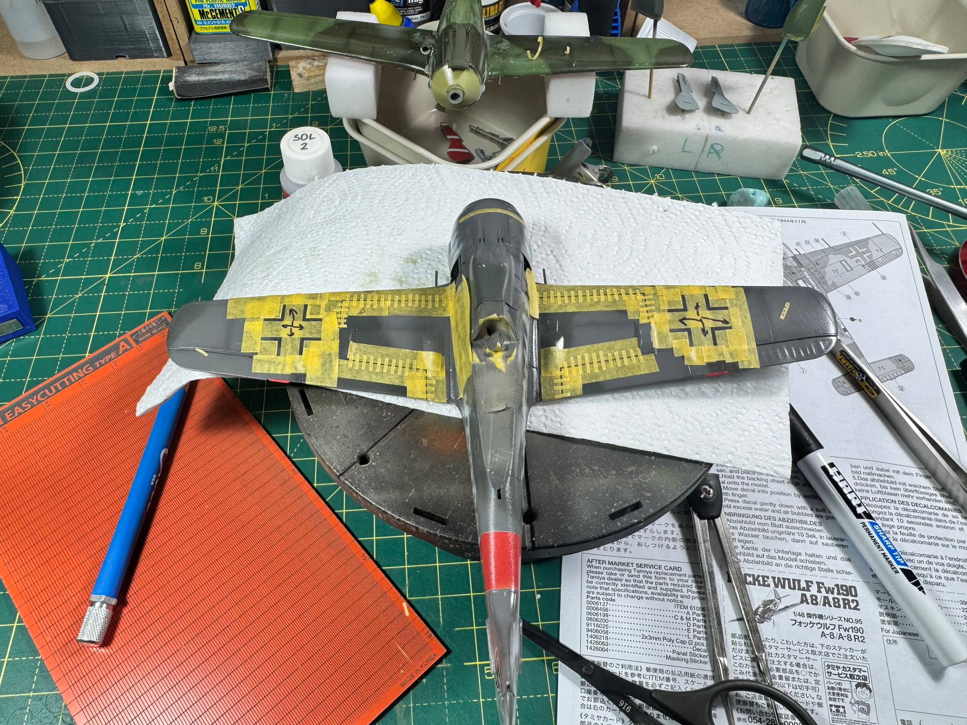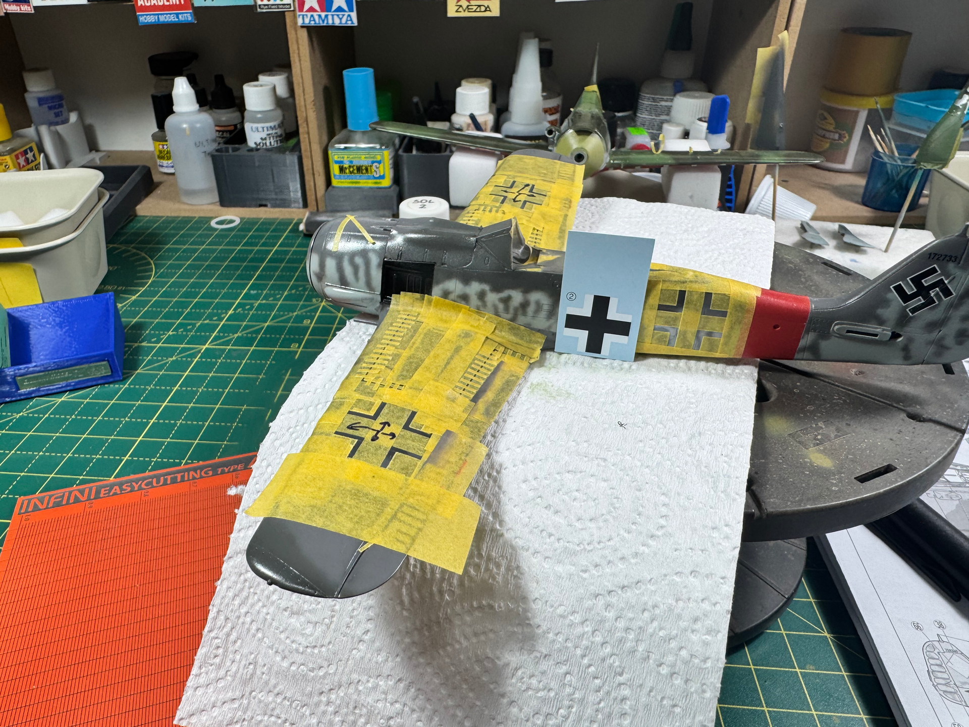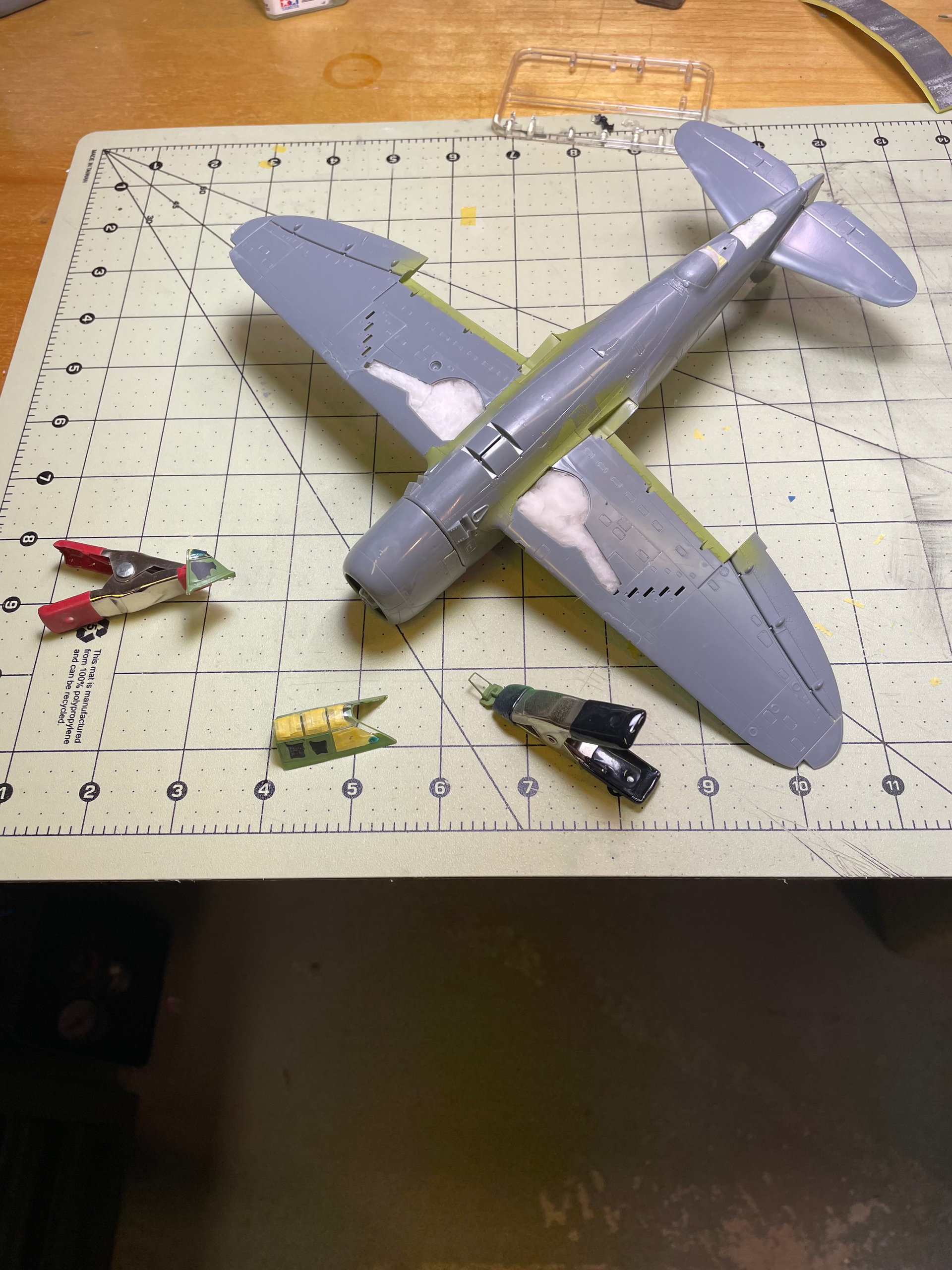 I tried doing some canopy masking and painting the interior color on my Tamiya P-47 Razorback. I used a set of Montex masks made specifically for this kit and was sadly disappointed. The top masks on the curved part of the canopy didn’t stay down and the paint got onto the “glass”. So I had to remove paint and once everything was dry start remarking with good ol Tamiya tape. Also masked the wheelwells and such. Hopefully I can get some primer on it tomorrow.
