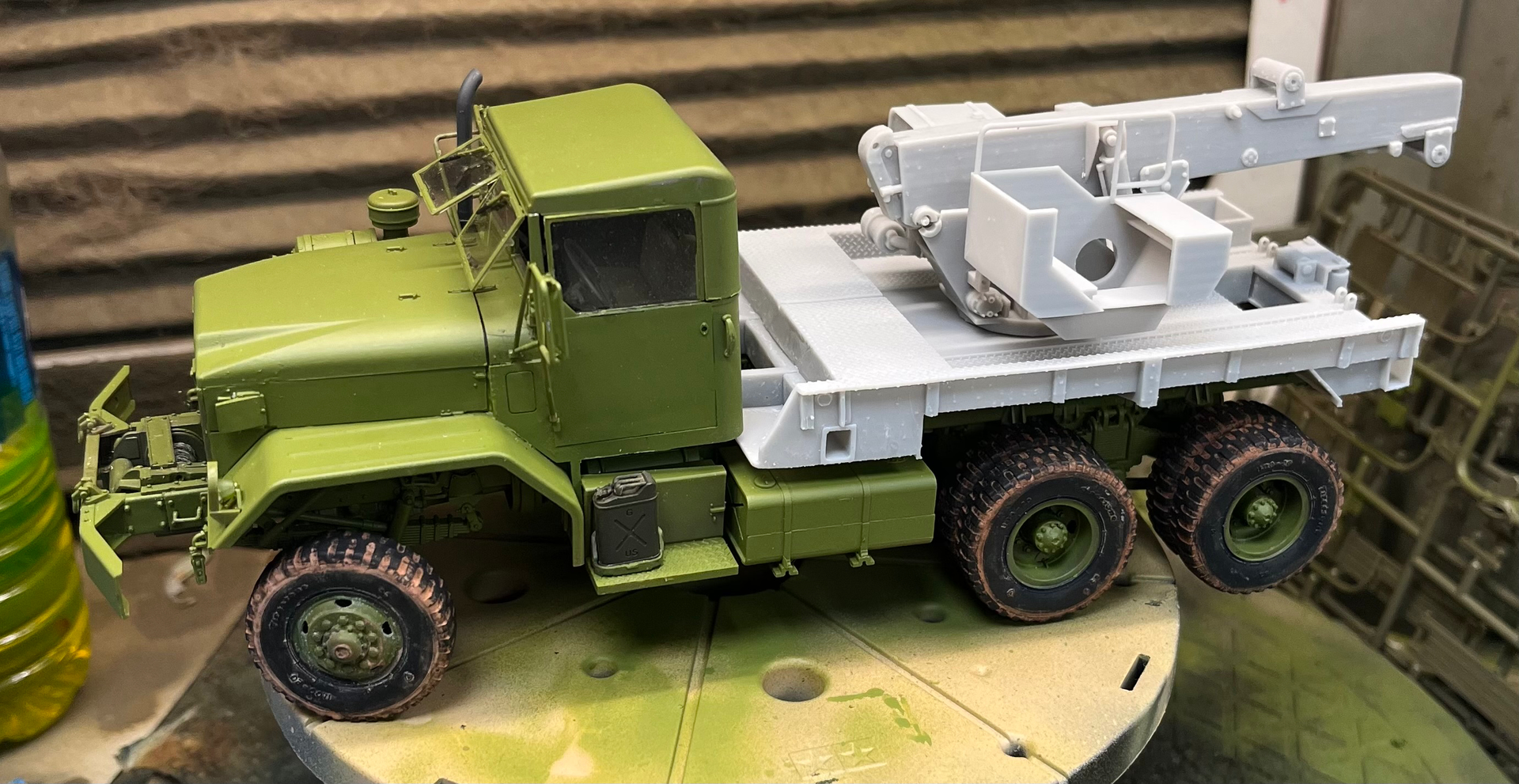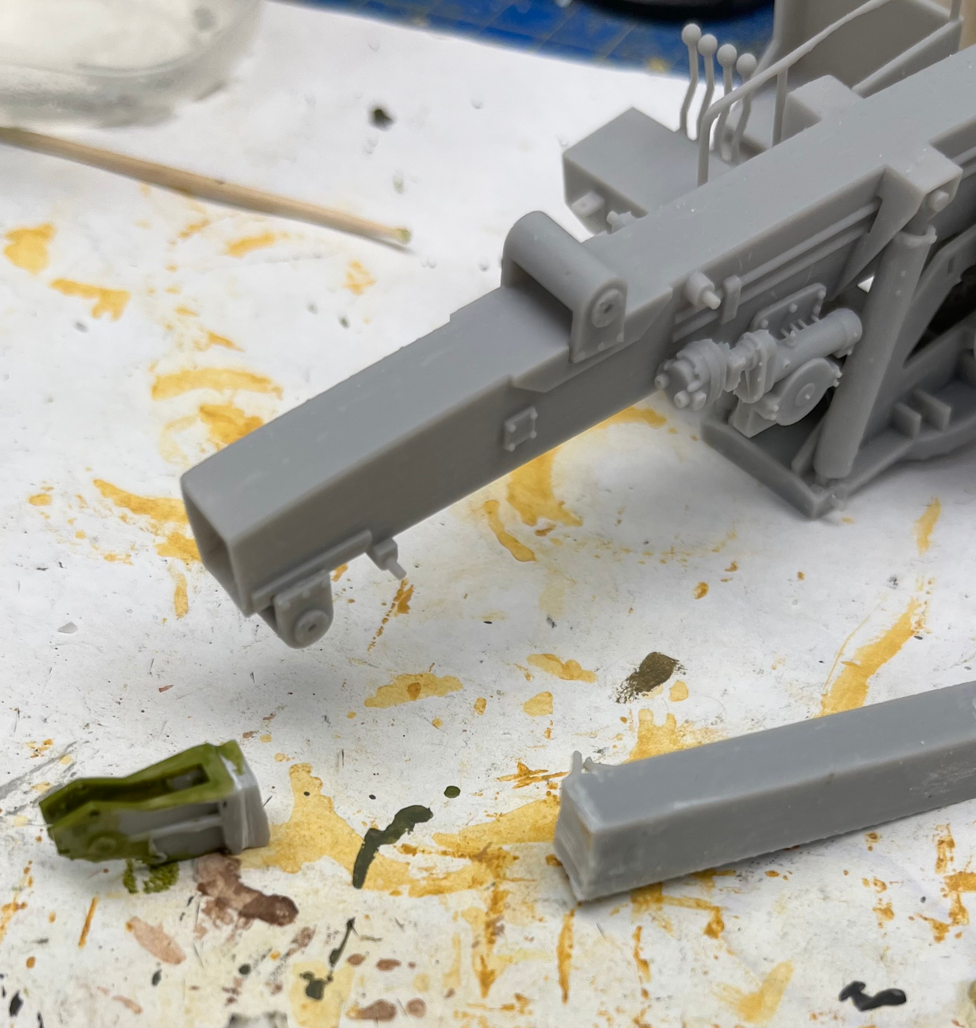 Some paint on the crane and deck. Dry fit for now as I need to weather the deck plating some and clean up the surface of the side panel on the deck. The extending boom was not going to fit into the main boom due to a sizing problem. I will let Khang know about this. Necessary to use a razor saw and a small metal file to fit the trimmed boom-end as can be seen.