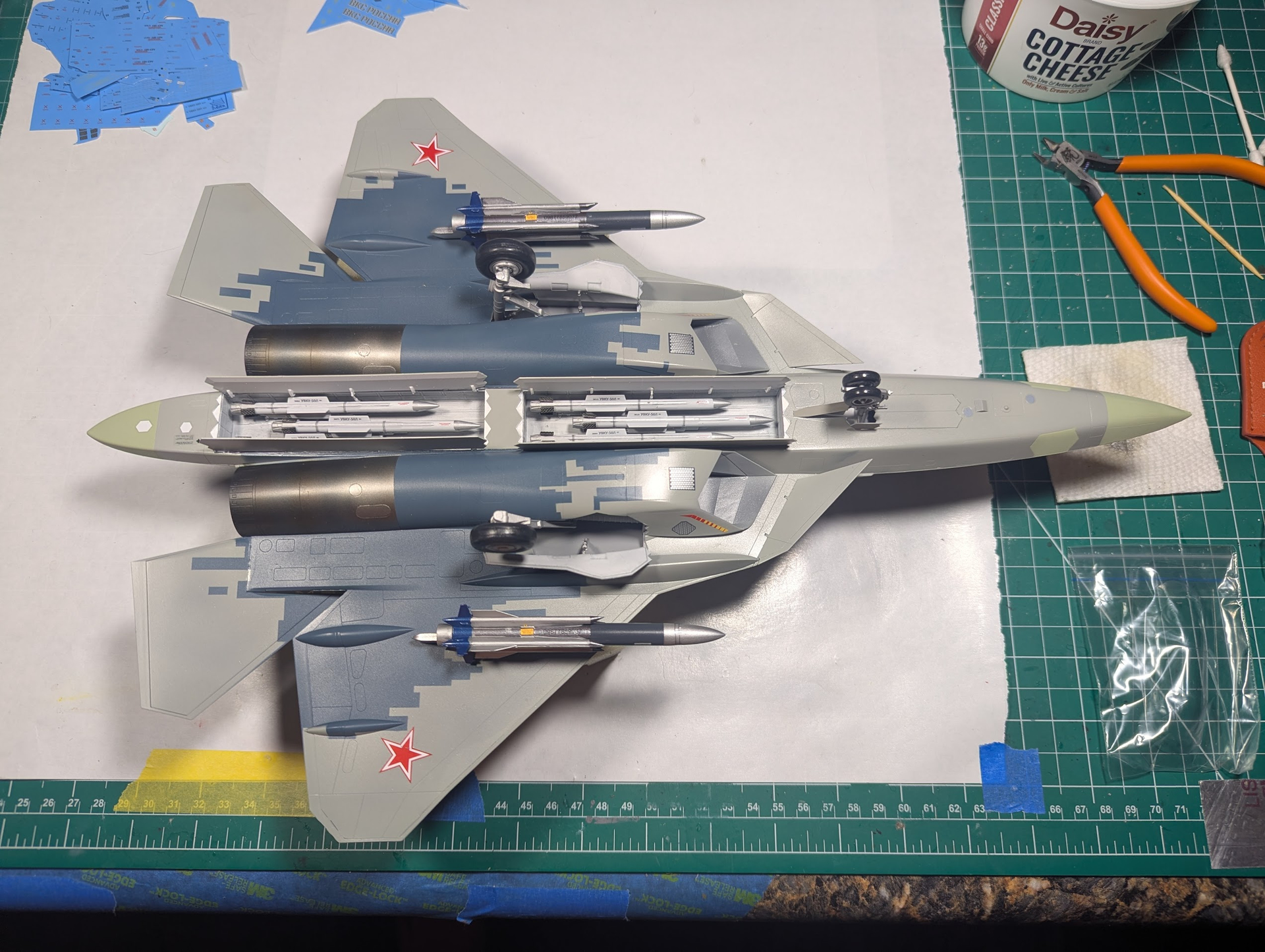 1/48, from Zvezda. These were the kit decals, and most went down just fine, but there were a lot of HUGE ones with the red-dashed lines, the “walk here” stuff that had large clear areas. I used micro-sol and micro-set, poked hundreds of little holes and improved it a lot. But in the end I just accepted what I had and kept going. I’m not looking for trophies, I want a set of Gen-5 aircraft. My Raptor and J-20 are waiting ![]()