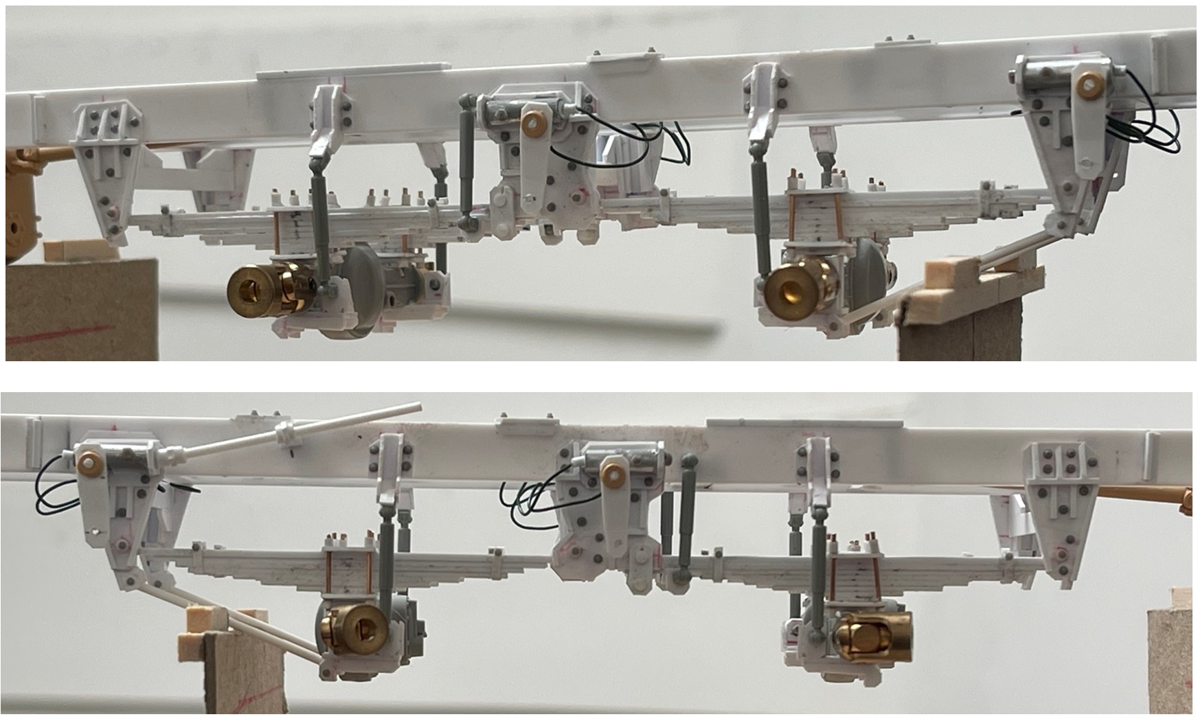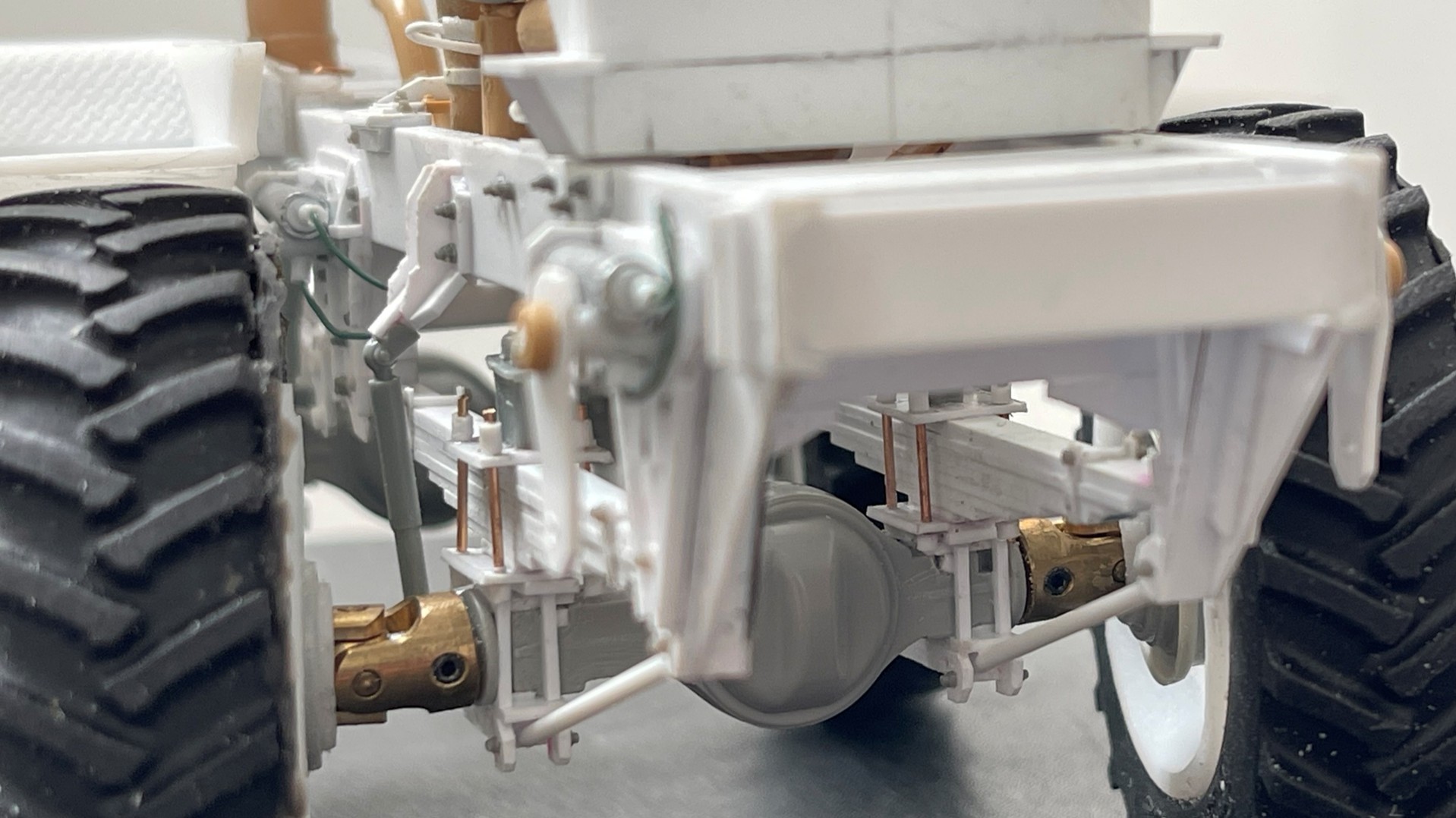 Looking closer to a viable chassis and suspension. I cut some styrene out, and added some in other places, plus more shock absorbers and bolts. And, we now have four sets of steering gears, pitman arms and hydraulics installed!