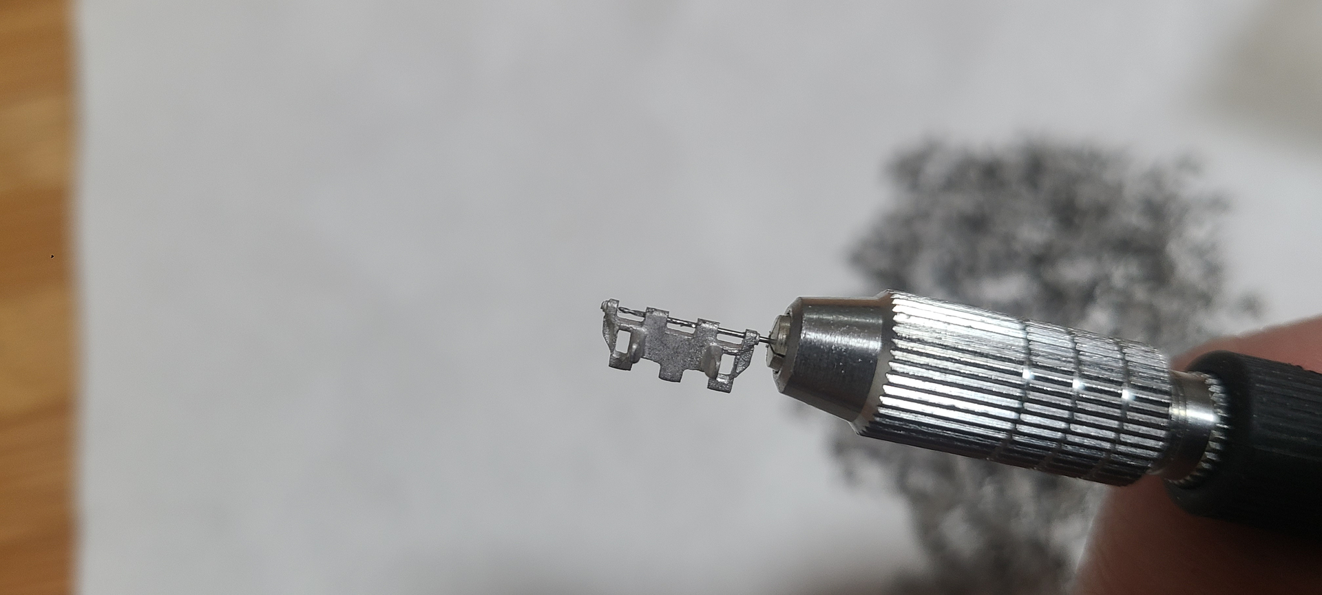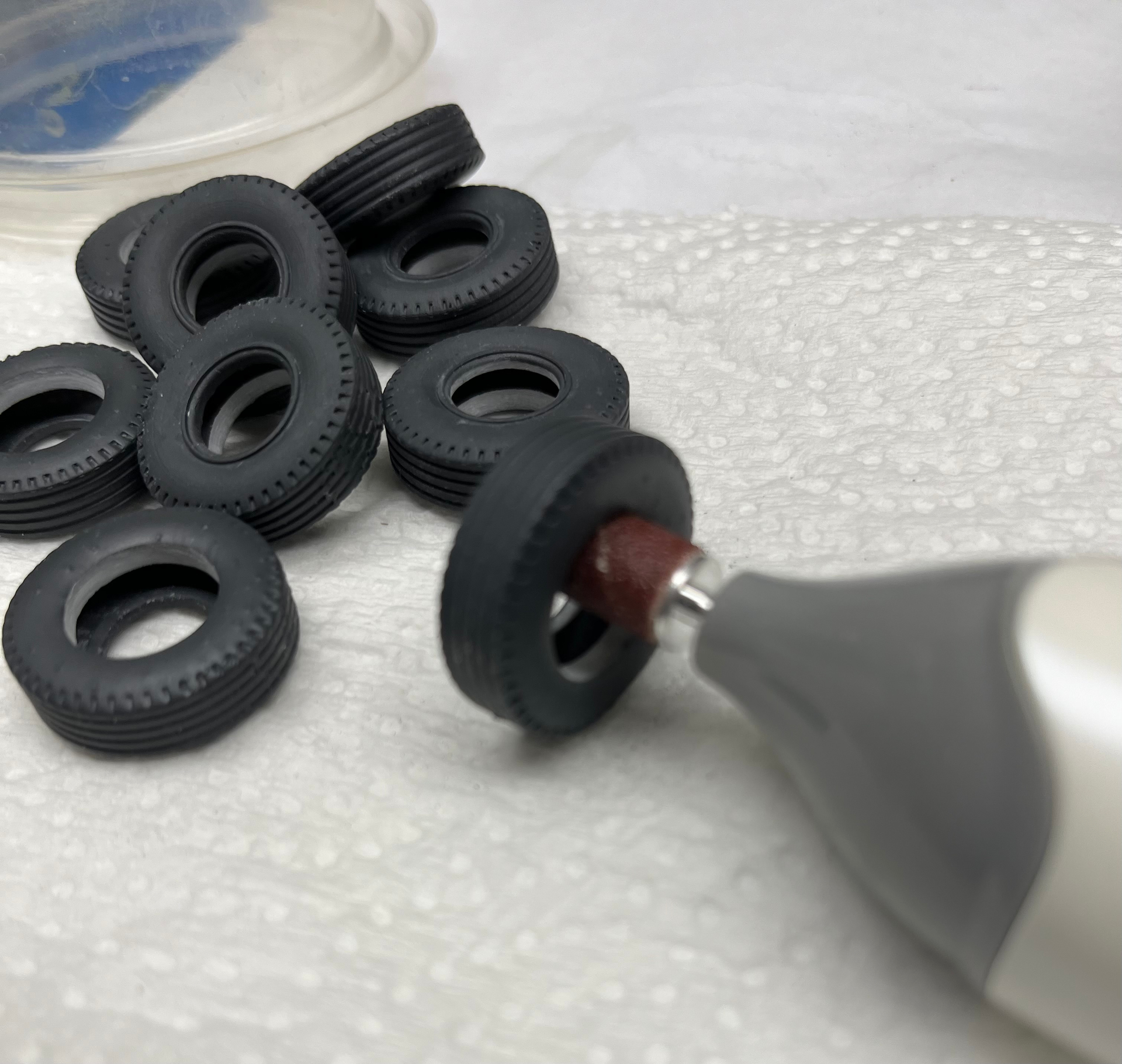 Used my Fanci brand rotary sander to remove some material from the trailer tires, allowing them to fit. About 2.4mm each, drilled out the hubs for the same reason.