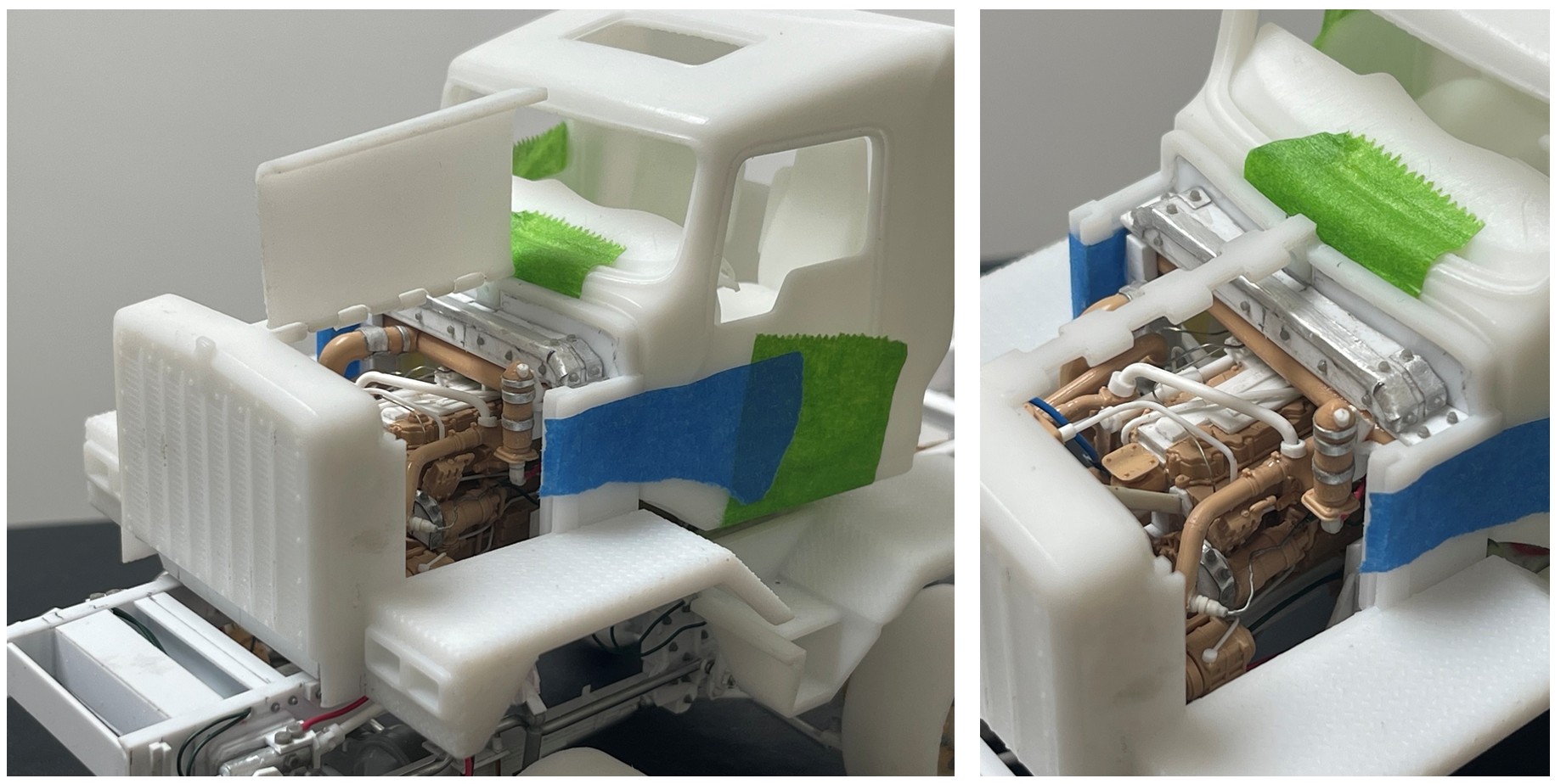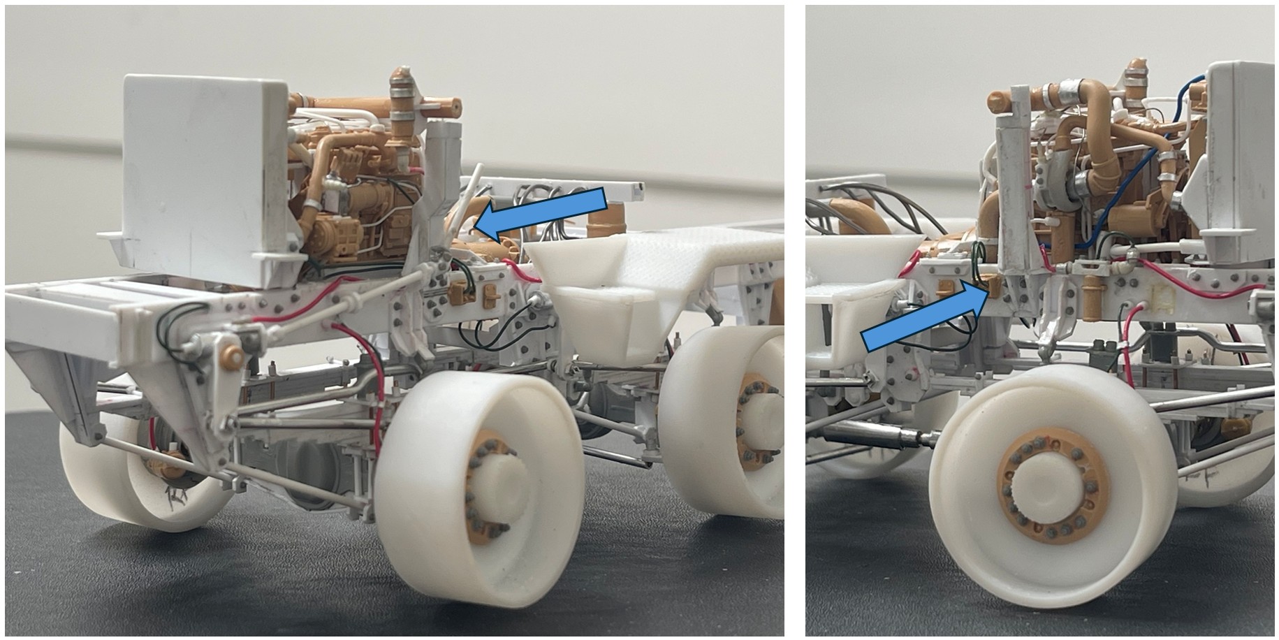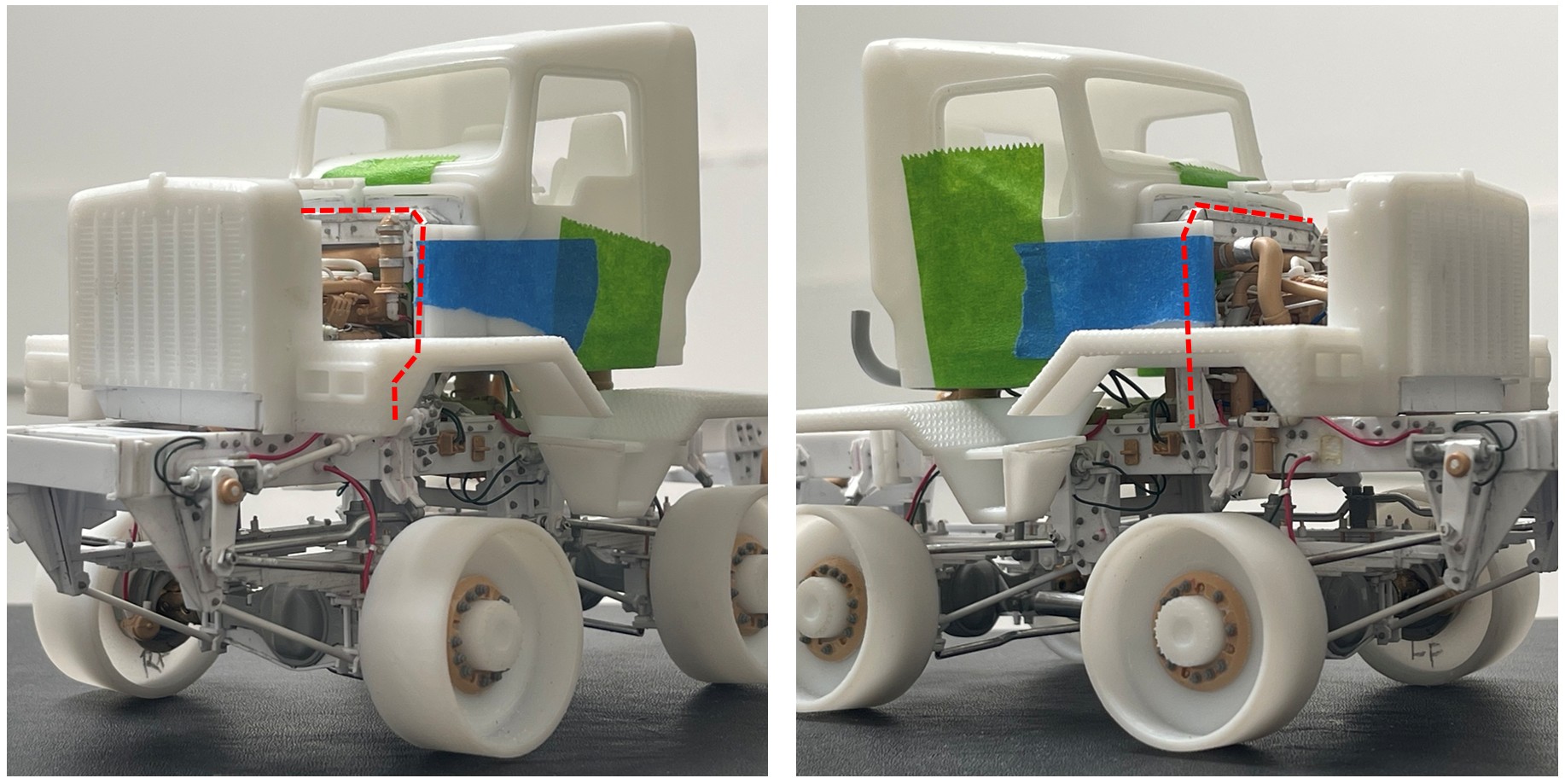 While a bit hard to see here, it turns out this truck has a structural frame separating the hood and cab, running from the frame rails up and over the engine, and across, in front of the cab, so I added towers to each side of the frame rails (blue arrows).