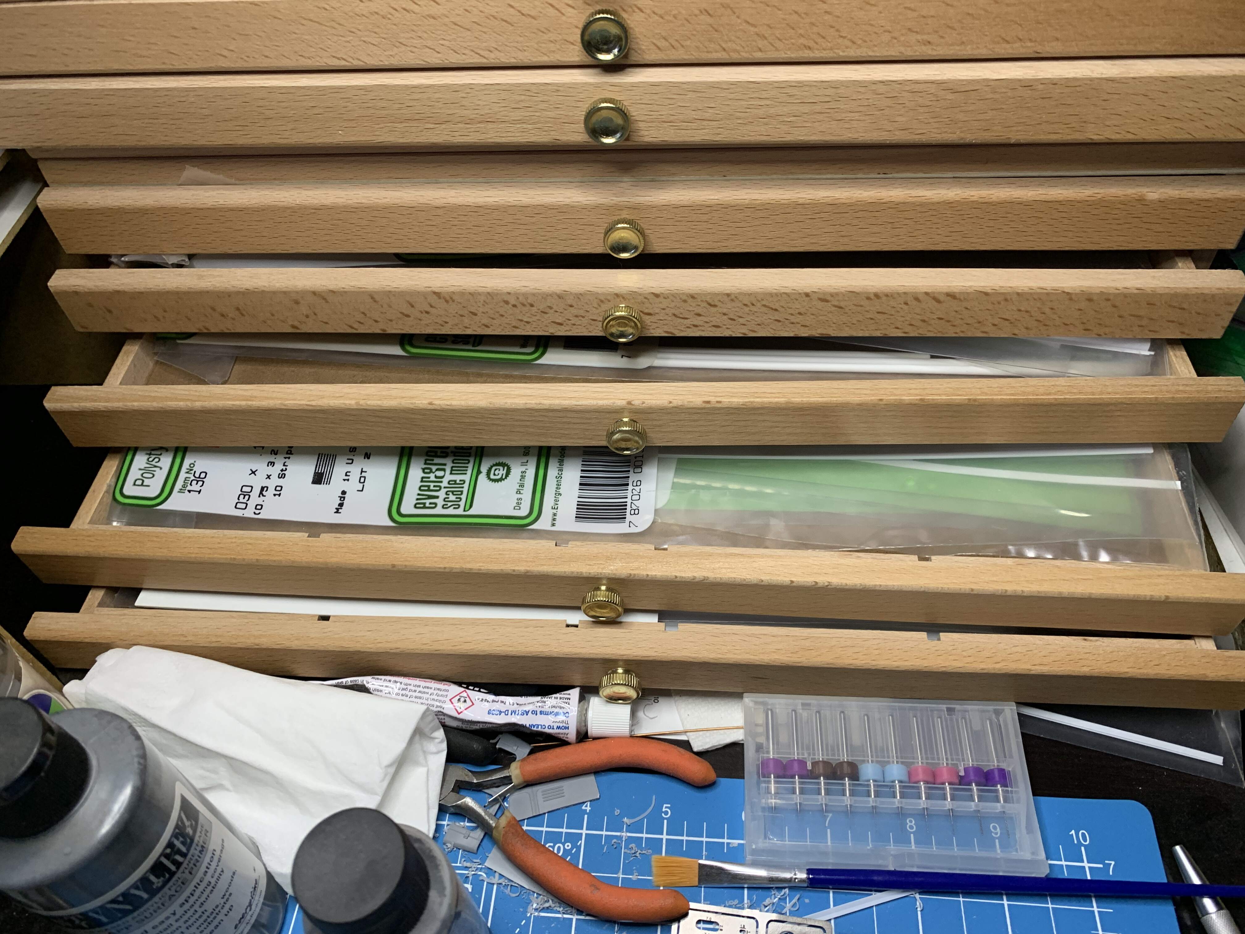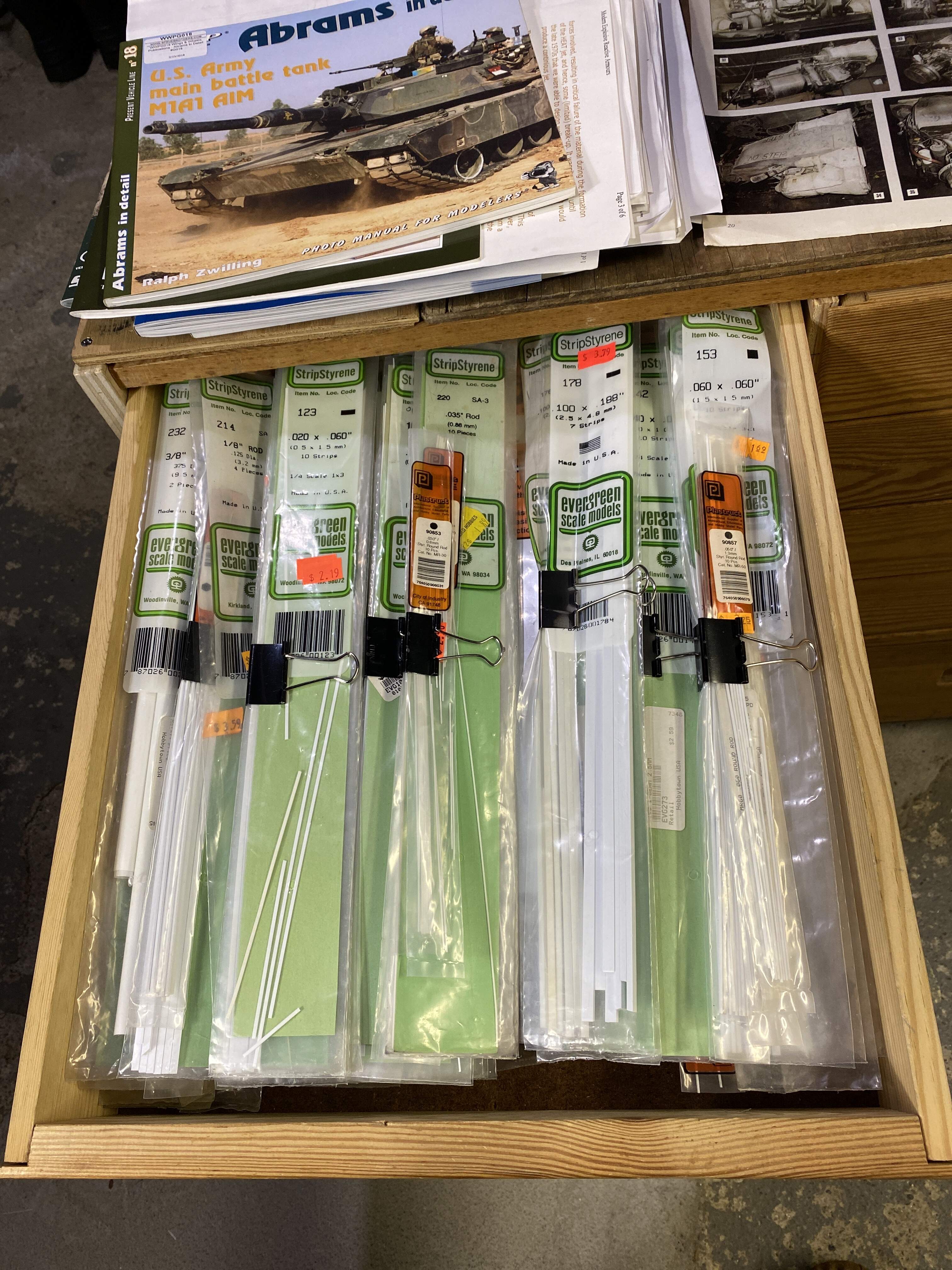 Careful! Evergreen is addictive - I have all of the normal-length shapes from their catalogue. (Plus some Plastruct rods & tubes.) The cardboard box has a home-made set of dividers so each bunch of packets has its own cell, and the near end of the bag has sheets. I used to put them in a set of desk drawers, but this way the bag can come to wherever I’m working…