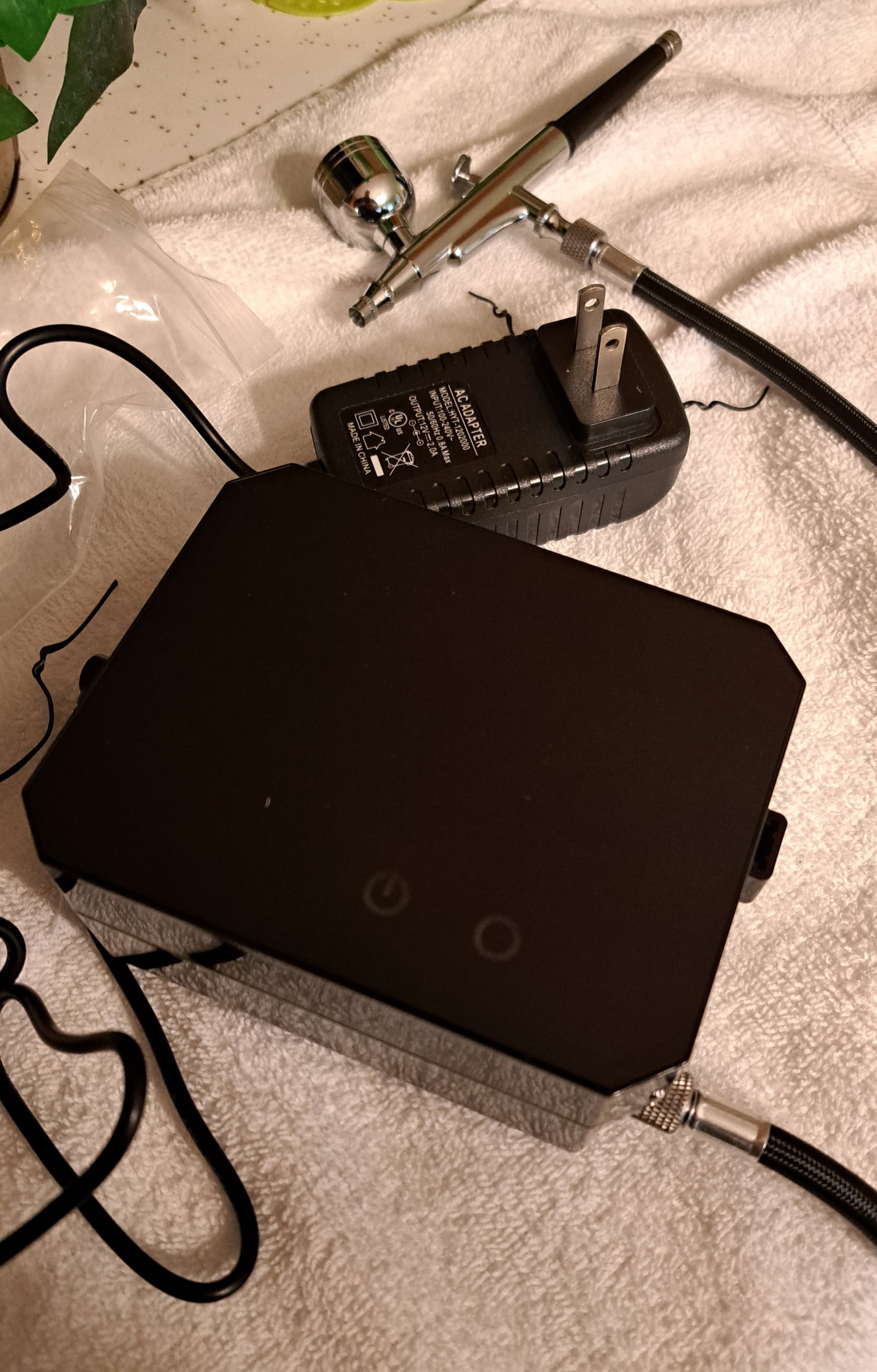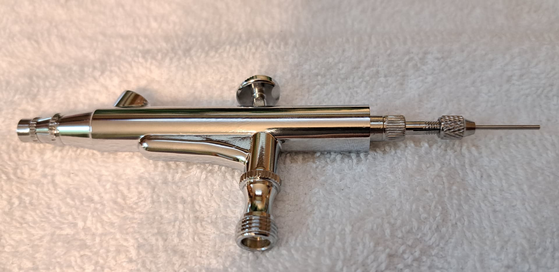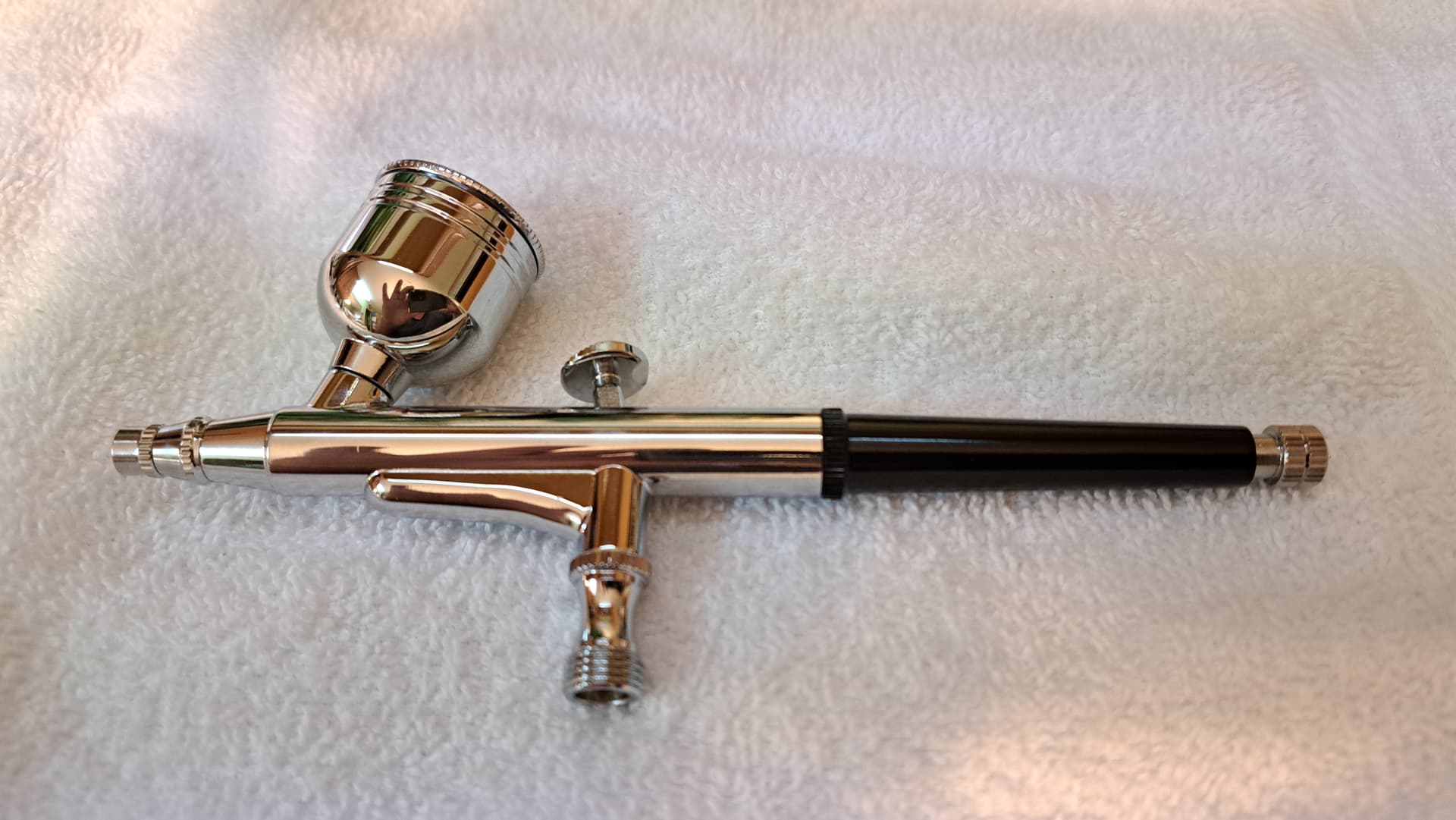 The airbrush. I was very pleasantly surprised. Trigger is cleaner and smoother than my Harder-Steenbeck, very close to my custom Paasche VL. Balance felt pretty good.