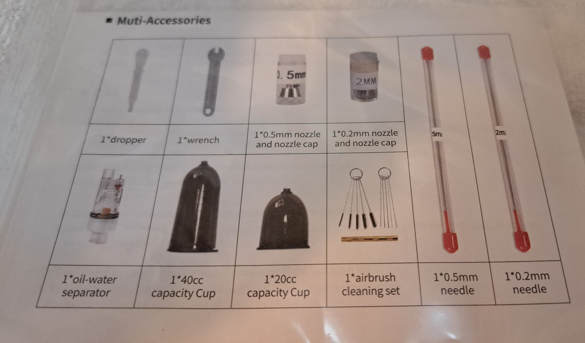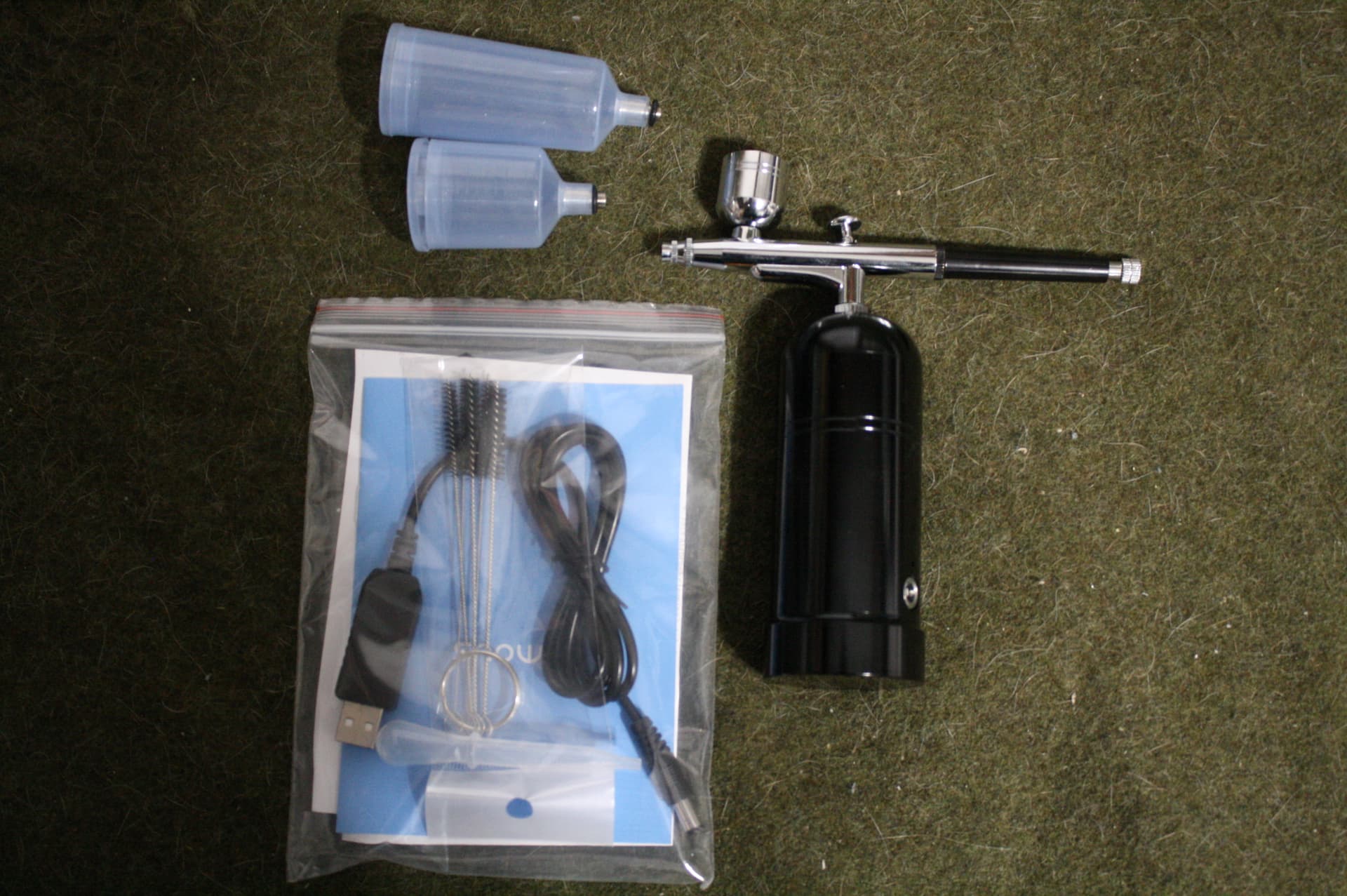 We discussed details and I rolled the dice on what we think is the same airbrush supplied with a small compressor, airhose, 3 needles ( .2, .3 & .5) and cleaning kit for ~$60 via Amazon.