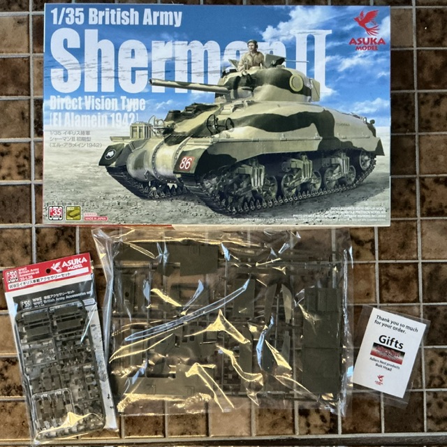 For a model I have in mind, I needed an M4A4 Sherman lower hull, which I ended up buying as a separate sprue straight from Asuka in Japan. Because of the postage costs, I ended up adding a set of British accessories and a full kit: