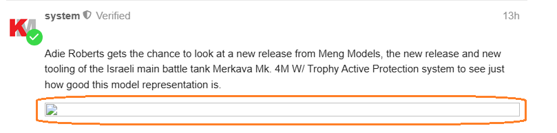 Honestly for all the people complaining in forum… you should be visiting the sites regularly anyway and not have to come to the forums to see content. Remember… the forum was setup to support the sites, not the other way around. I hope everyone takes that as intended, in that WHERE you are bookmarking to arrive here has more to do with how much you see on those sites than this issue of images not showing up in the forums. For a year or more we had no images in content site posts on the forum and everything was fine. Now people seem to be using the forum as some guide to see if there is something interesting to see on the sites. Again the ONLY reason site posts show up here is to facilitate the chat showing up on Armorama, AeroScale, etc. It’s not so people can find content to look at. If you aren’t bookmarking the sites and visiting them regularly then that’s a problem for the long term survival of the content sites.