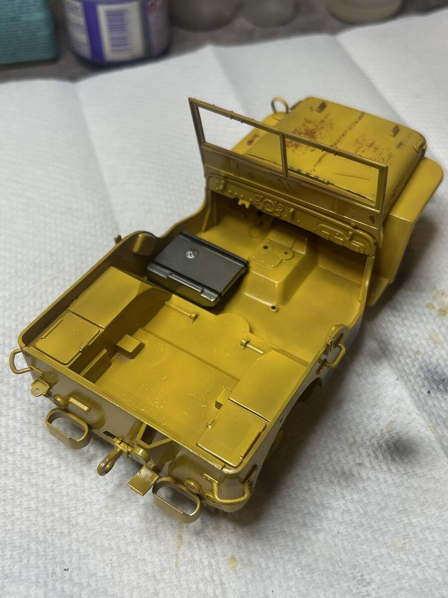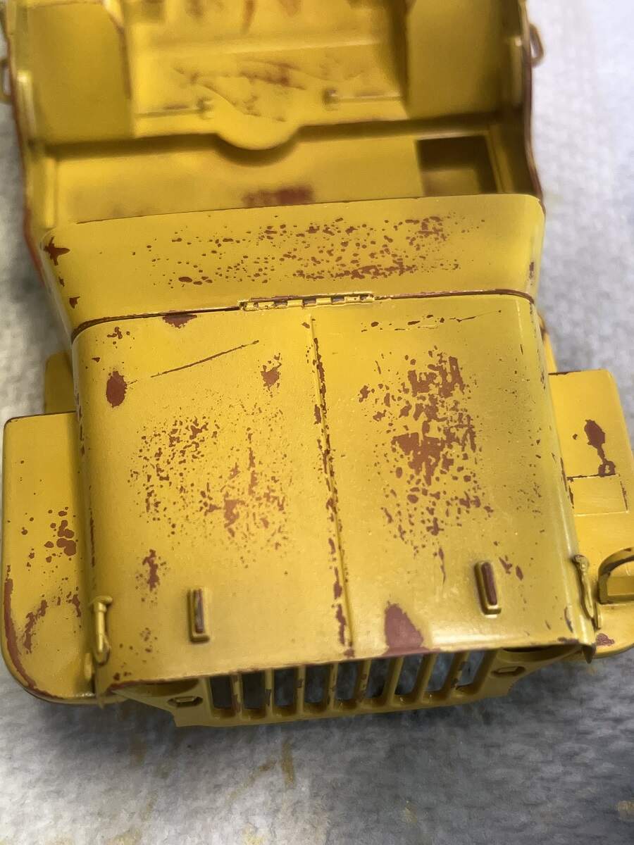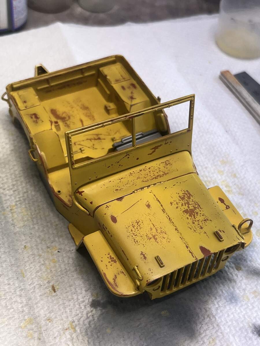 Great work Damian. Here’s a thought because I am not sure if you’re going for the worn look or the rusted look… I don’t much know about Jeeps or their construction but I have had several vehicles in my time that have rusted and it it always seems to me that the rusted away at the edges. I like the sprayed grey part as a fix. I wonder if you poke a few holes in it closer to the edges it might help the rusted look if that was the aim.