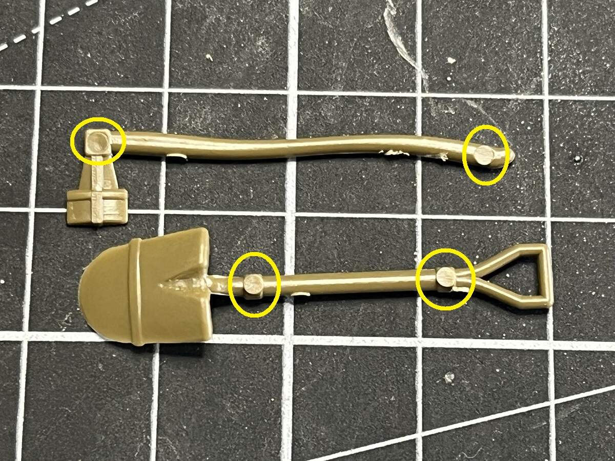Why Italeri, why? We have a couple of tools to be fitted to the outside of the body, and they have a nicely detailed visible side. Why would you go and plant your dirty great ejector pins right on top of that detail? Why not put them on the inside face of these tools where they will never be seen?