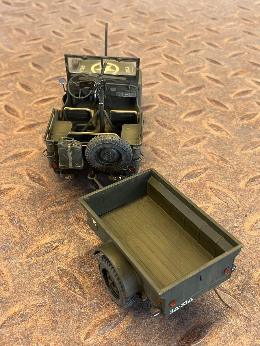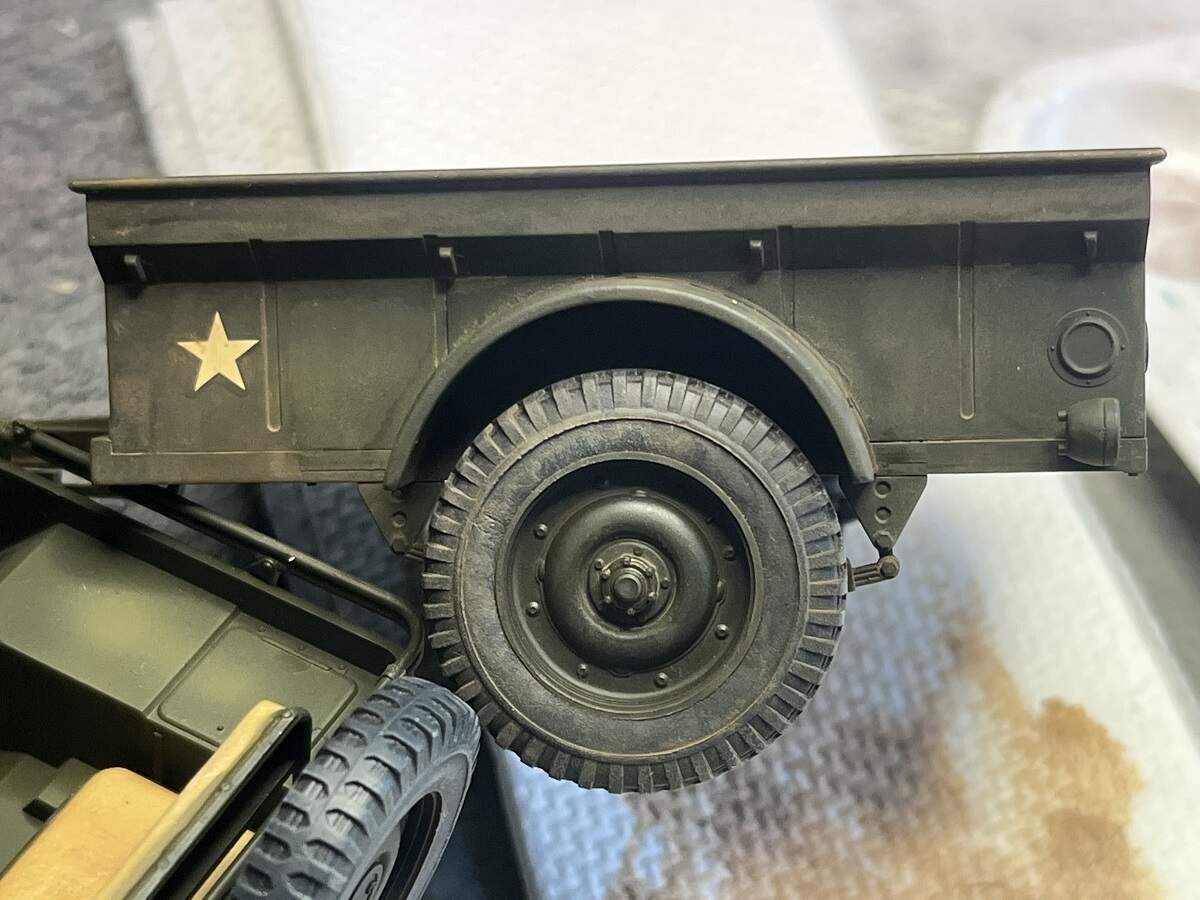 I love how things just seem to accelerate when you get to the pointy end sometimes. I fitted the chassis assembly on to the body of the military Jeep, then set the wheels in place on the Jeep and trailer (they had been faded with the Grey from the Tamiya Weathering set). Next thing you know I’m looking at a 99% completed kit!