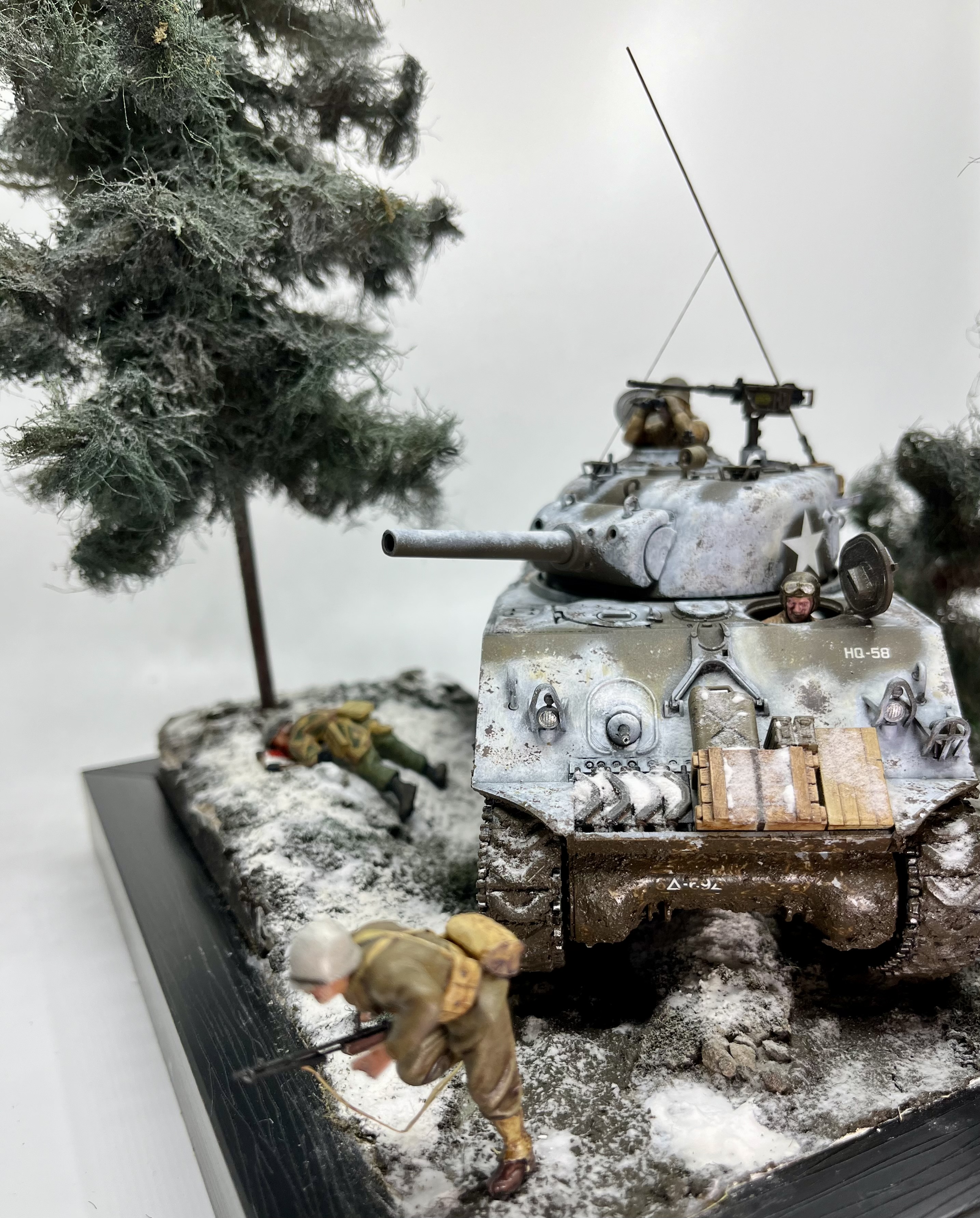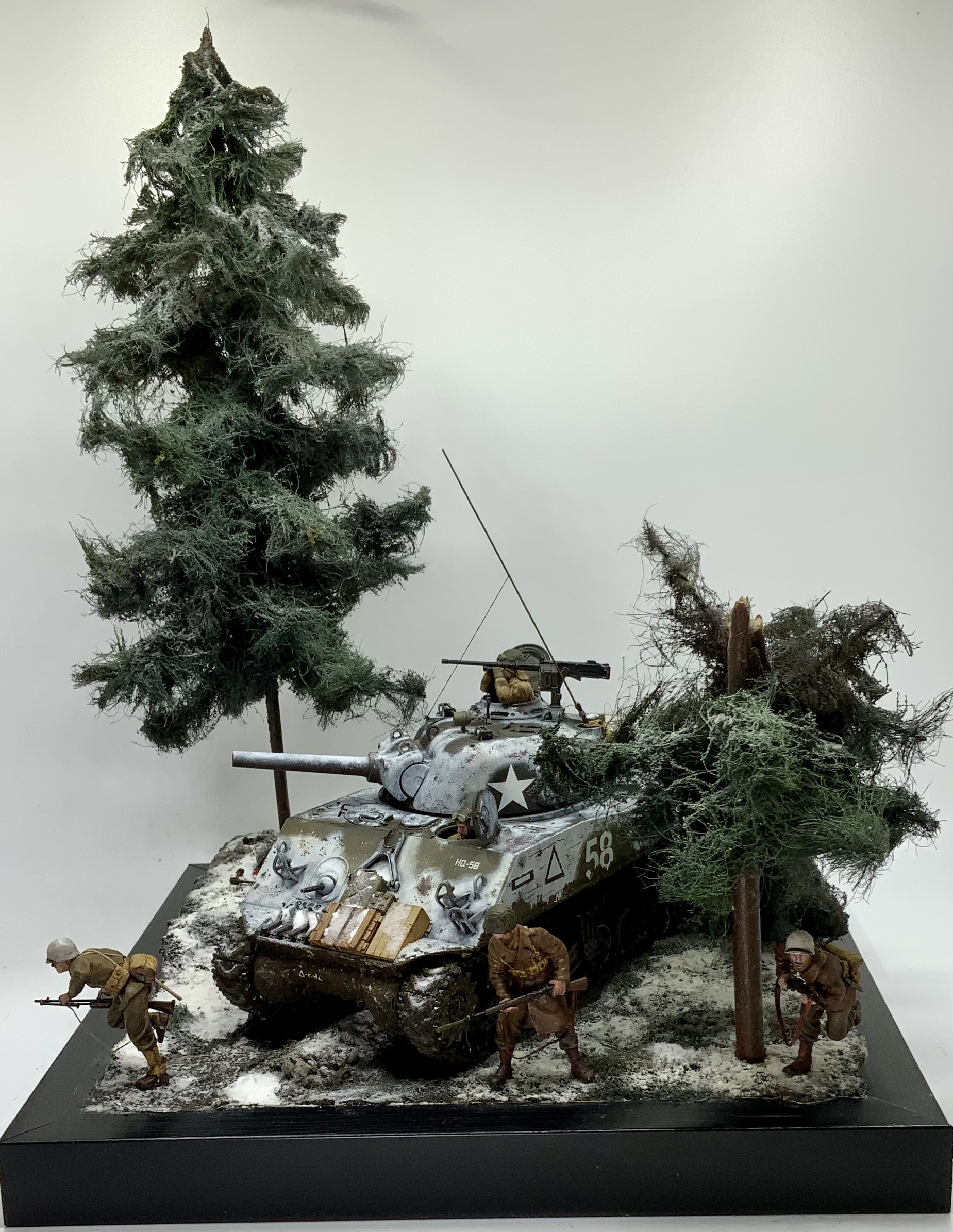 Finished this project this evening. I could probably have done a lot more, but the whole purpose was basically to practice whitewash. Then I thought it was a good idea to add the figures and finally build a «Bastogne base» for the tank. That included some fir trees and learning to make those. I used a YouTube movie as reference and took it from there. Next time I make some I will use thinner fibres. On the bright side the fir trees are solid as concrete. The kit itself is typical Tamiya and I will highly recommend it for beginners. The more experienced modeller will probably want a more detailed kit. Summerized I´m happy about how it turned out. I reached my goals about learning some new techniques.