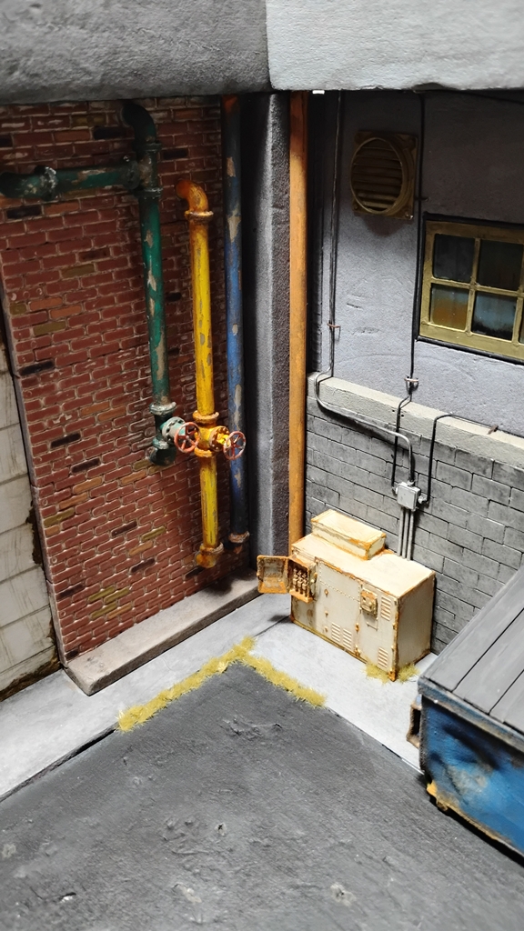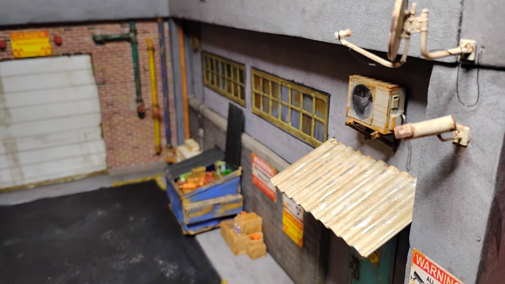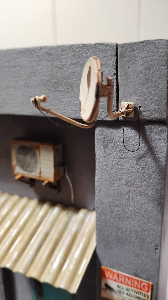 Small update I got the AC unit on along with a vent. And worked on the roll up door I cut it a bit short so not sure if I want to leave it a bit open or add in small piece and then blend it in with the rest of the door to be closed. I’m not to worried about the bits of black paint on the grey on the ground it’ll mostly be hidden by tufts of dry grass and other items. The black pavement is just well black paint with some browns added into the recesses and a very light second black wash to blend it all in. Added in a lot of junk to fill the dumpster still got to add in some paper goods to it and then then the lid top which Im hoping to have a figure that can be posed holding it open while searching the bin. Then its on to electrical wiring, a sat dish and maybe some type of mounted antenna. Barrels and drums and bits and pieces this will be one busy dio thats for sure.