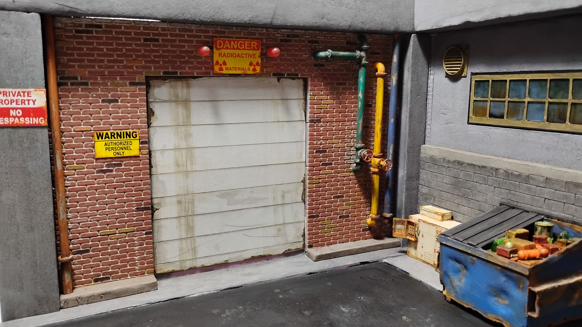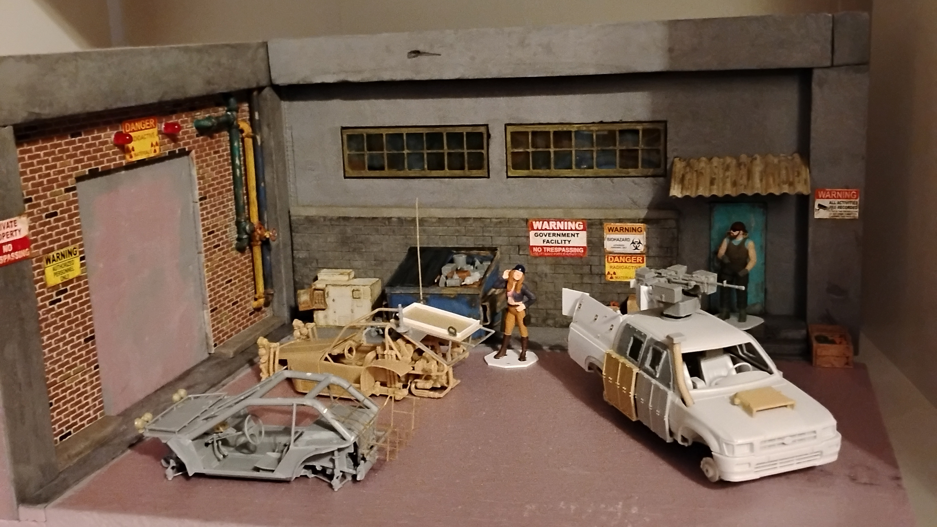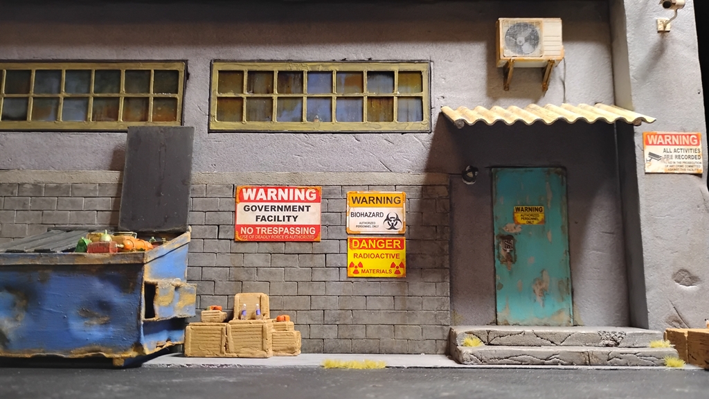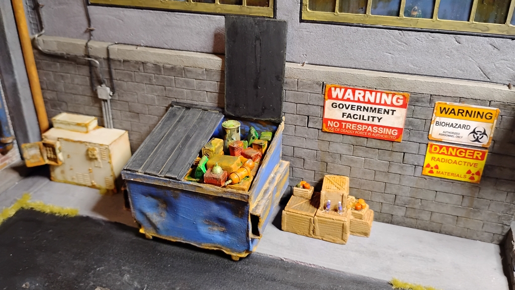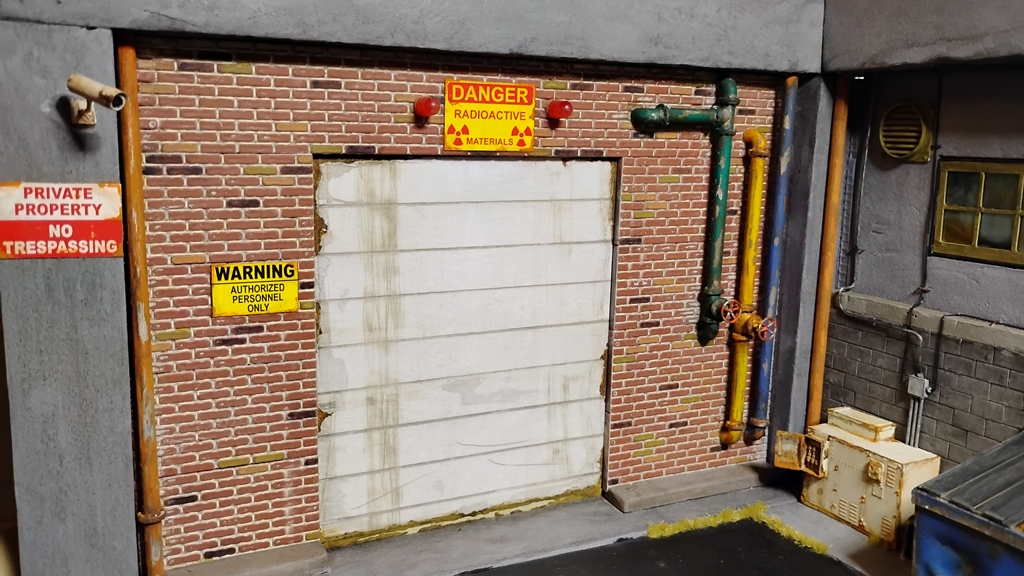 Got to build the roll up garage door, paint the asphalt, add in dead and dying grass in the cracks then add in all the various drums, barrels and various set dressing. Start running all the power lines and connections points plus the sat dish and sercuirty cameras. Then I can finally start figuring out all the various figures to use.