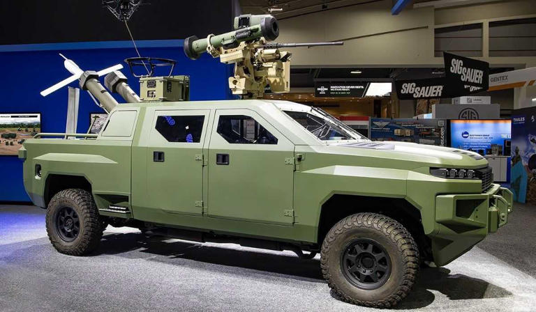 Most likely too late for 2024, but possible for 2025…GM Defense’s “Next Generation” pickup concept demonstrator and prototype. I want the 4-harddoor option with .50cal and Javelin ATGM remote weapons station, two loitering munitions in the cargo bed, and tethered sUAS.
