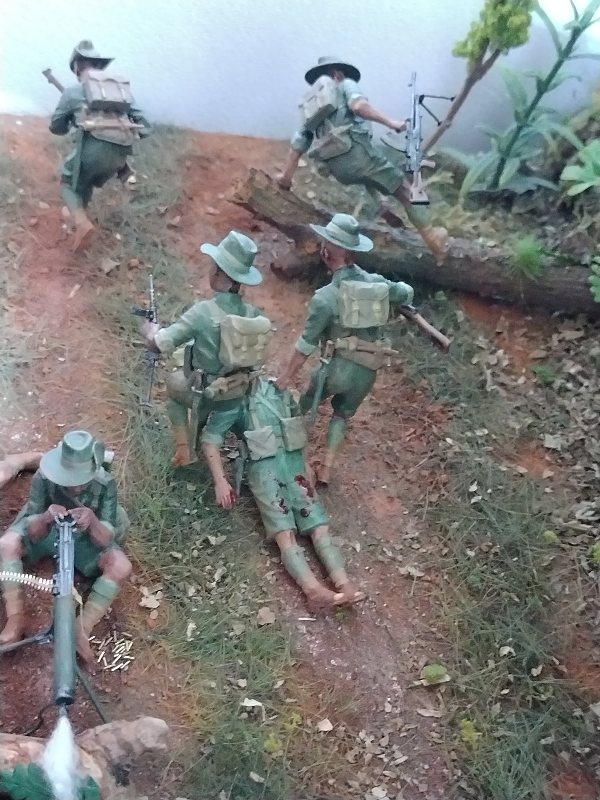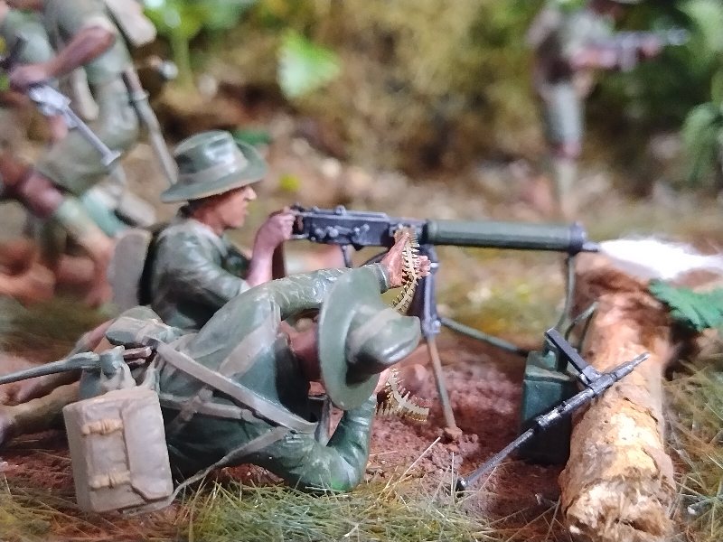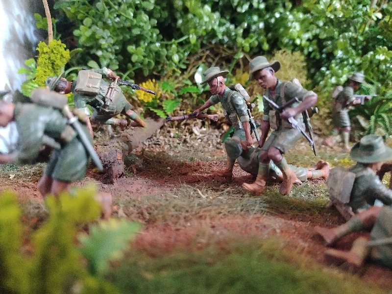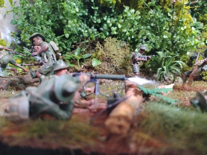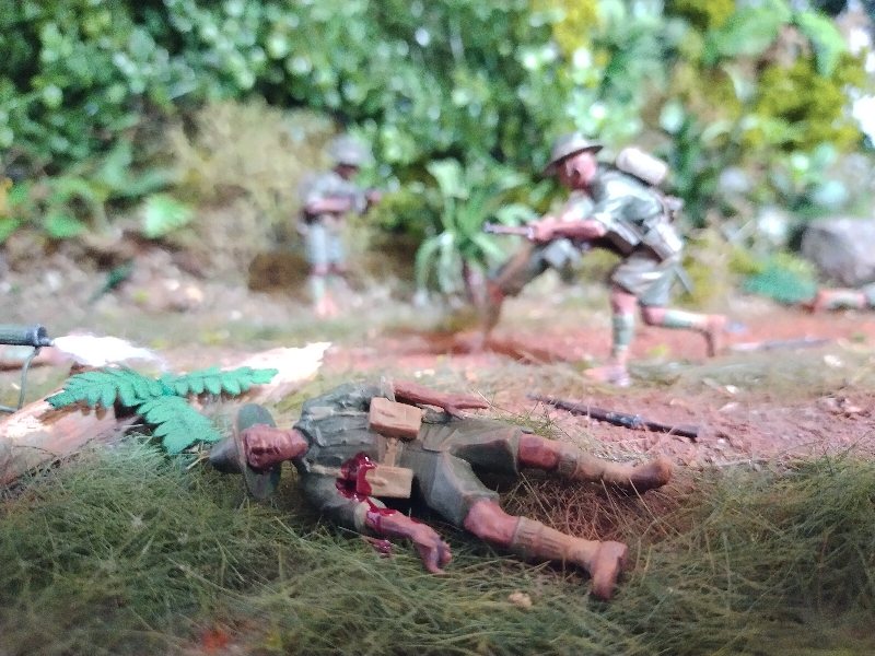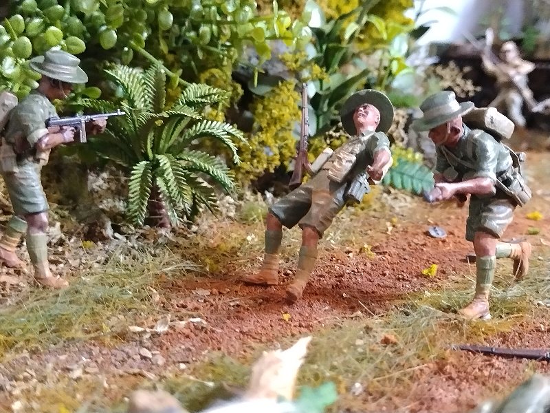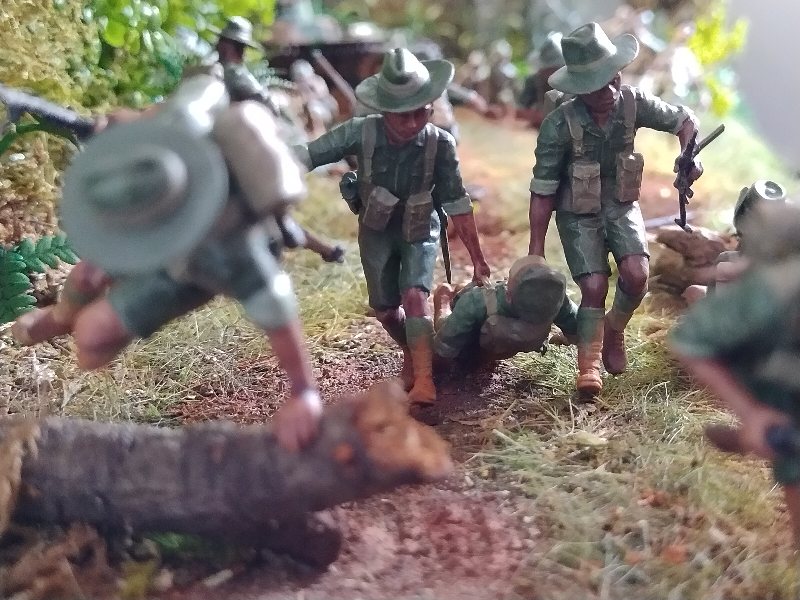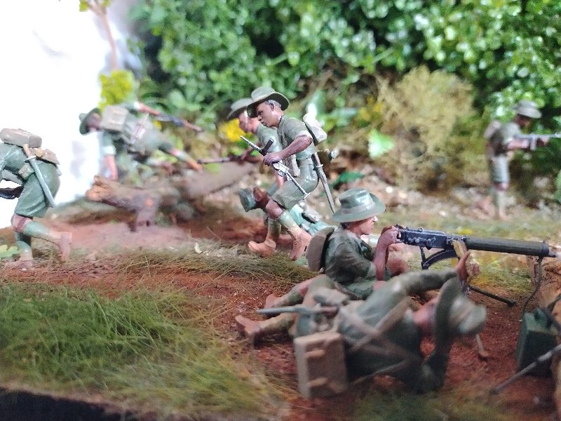 Great dio Christian, it’s quite a challenge to convincingly portray close combat and you nailed it. Best figure has to be the Aussie vaulting the tree trunk! I hesitate to criticise anything because this is an excellent scene and (too) rare, but the uniforms are shiny when they need to be flat/matt…and I hope I’m wrong but the Aussies uniforms look very green, I would have thought they were khaki (?) One other thing, a couple of lost slouch-hats lying on the ground might look good.