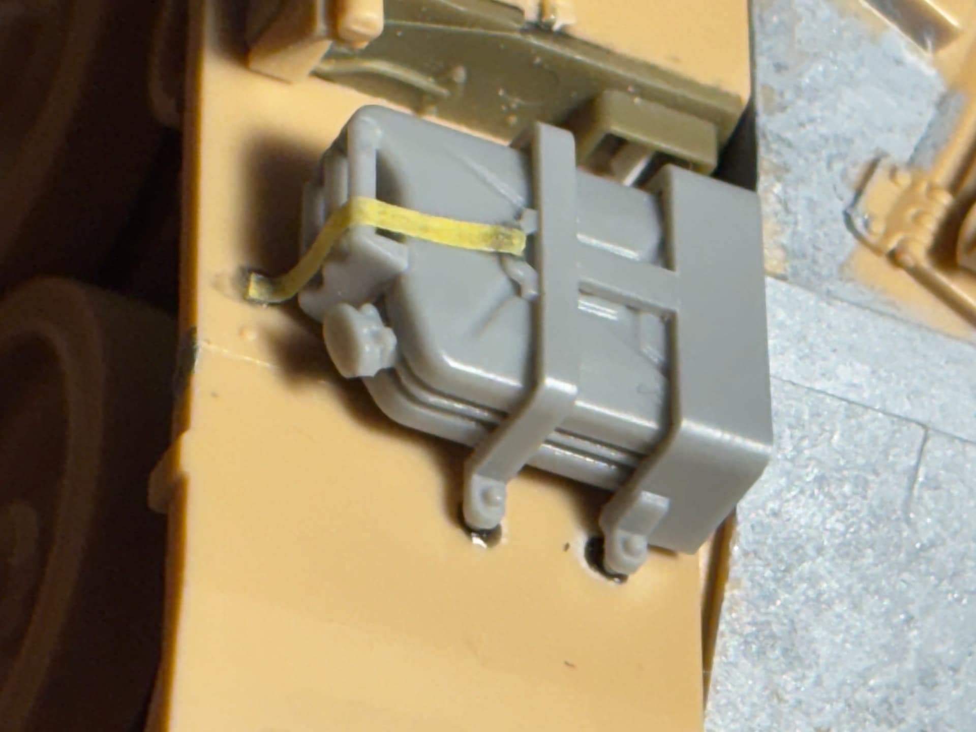I put on this IDF Jerry can from the AK IDF accessories set on the left fender, there’s normally an IDF water can there but the kit part has these two huge indentations on the side of them; and I have a photo of a YKW Sho’t Kal with a gas can on it, so I just decided to go with that.